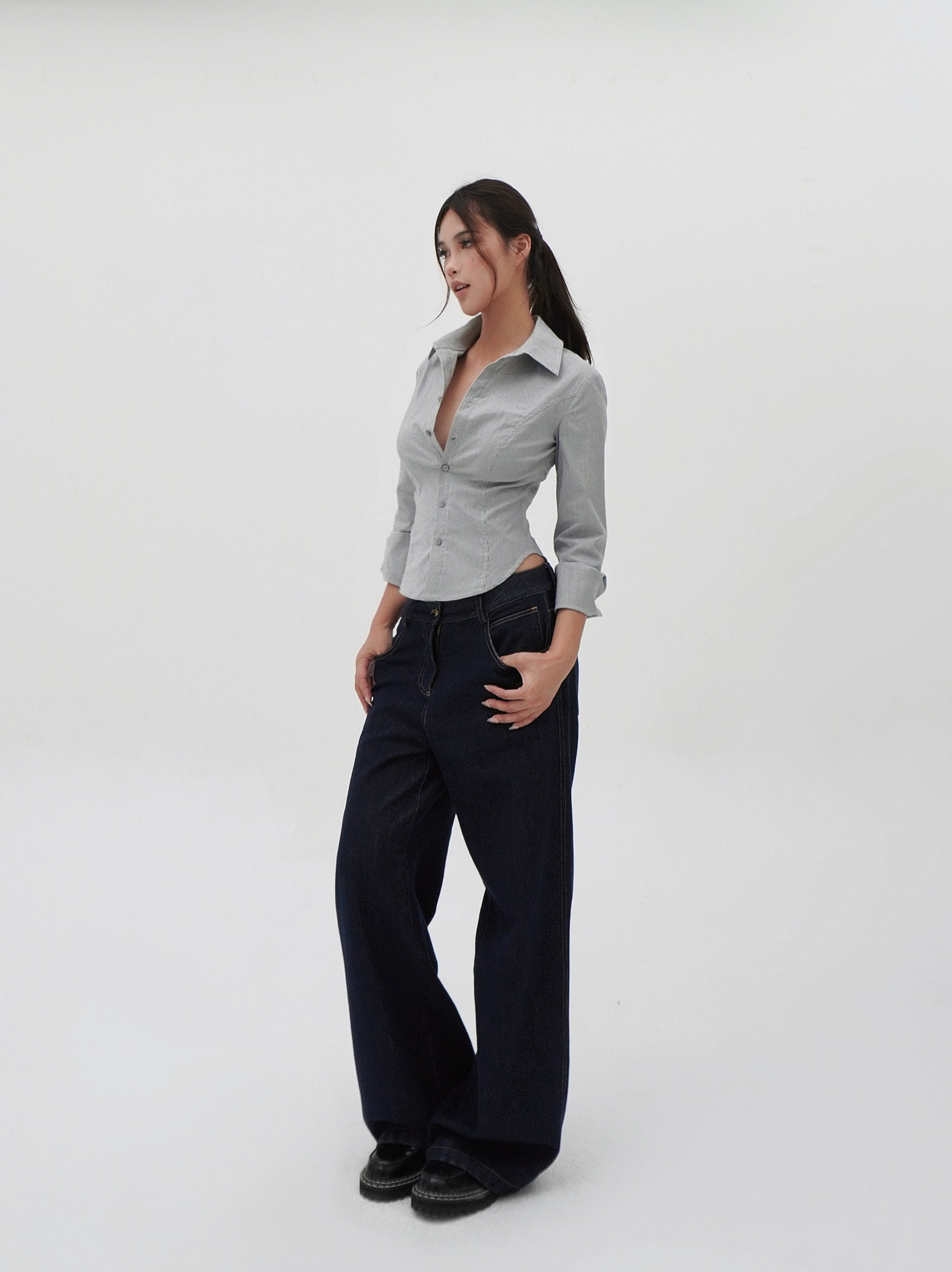 Styled easily with high-waisted trousers for work or distressed jeans for a weekend brunch, this shirt is suitable for a variety of settings. The cotton-blend fabric offers breathability and a hint of stretch ensures freedom of movement, embodying the nonchalant vibe of the collection.