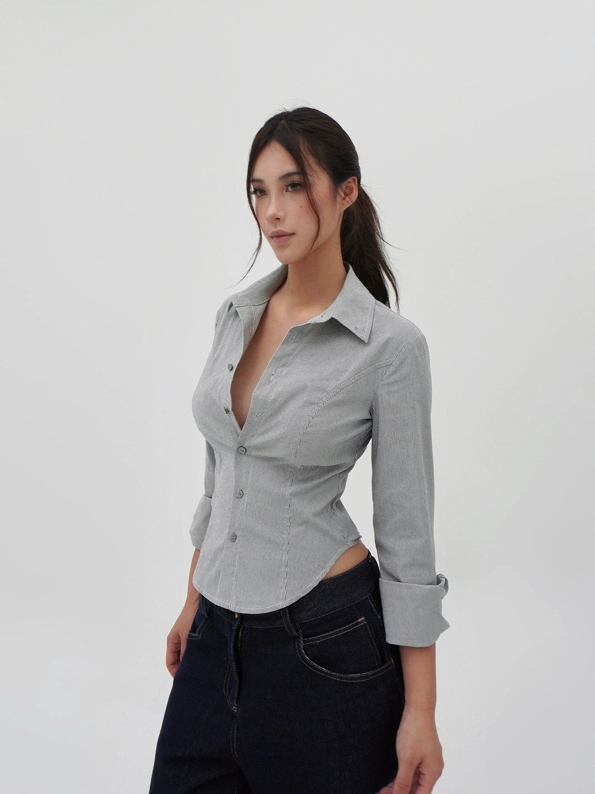 Expertly crafted with a blend of cotton and other materials, this shirt features a slim silhouette complemented by a unique U-hem that highlights the waistline, presenting a mix of tailored sophistication and relaxed comfort. The combination of classic pinstripes with a modern cut creates a versatile piece that resonates with a moody yet refined aesthetic.