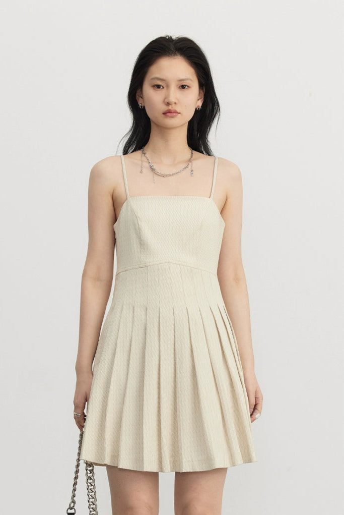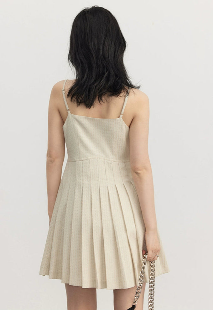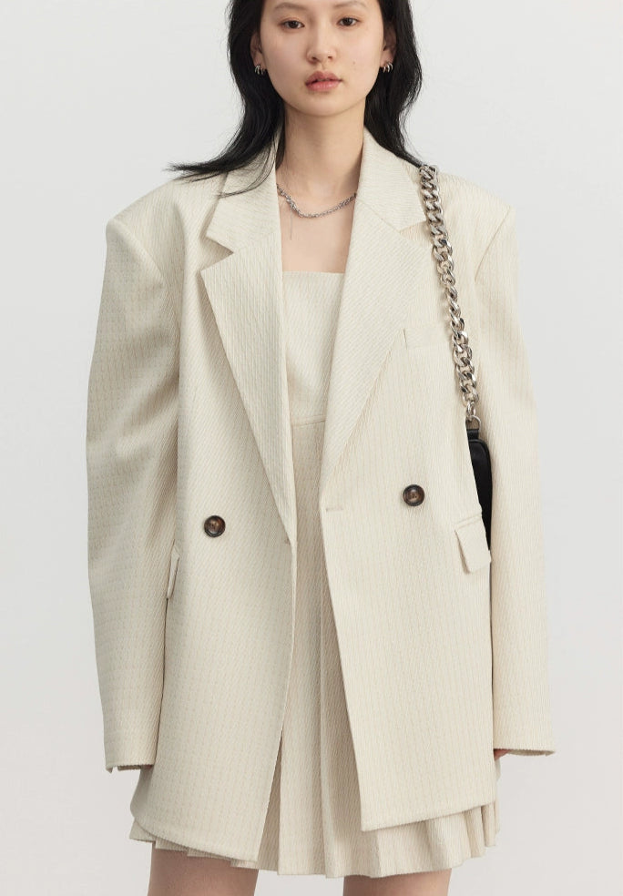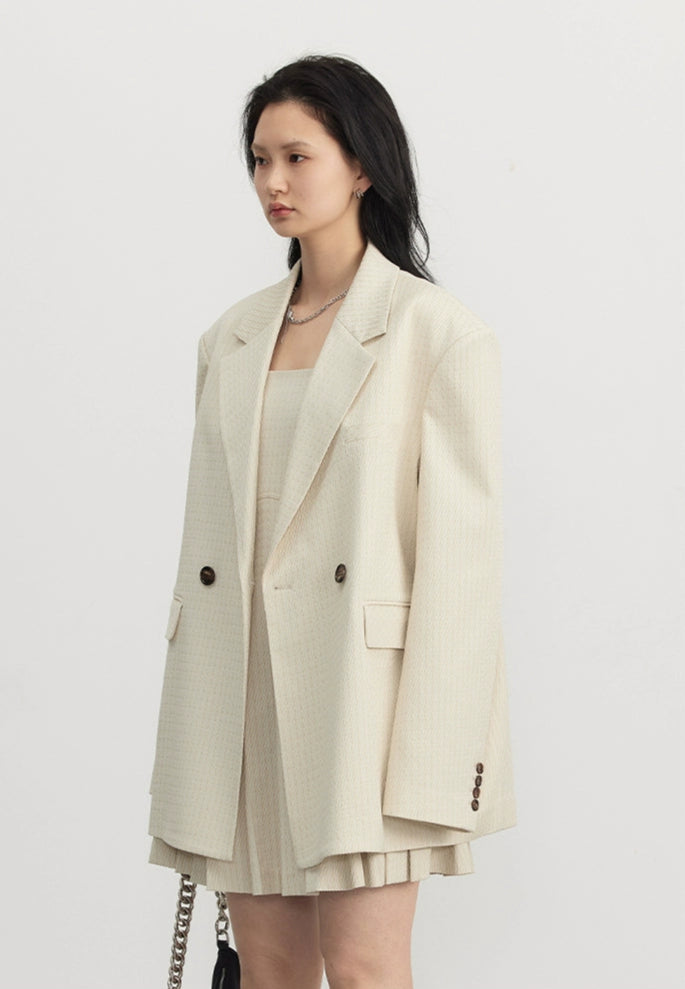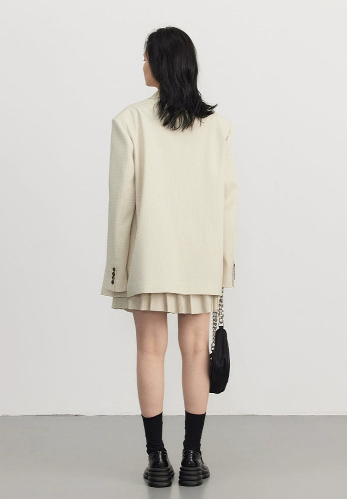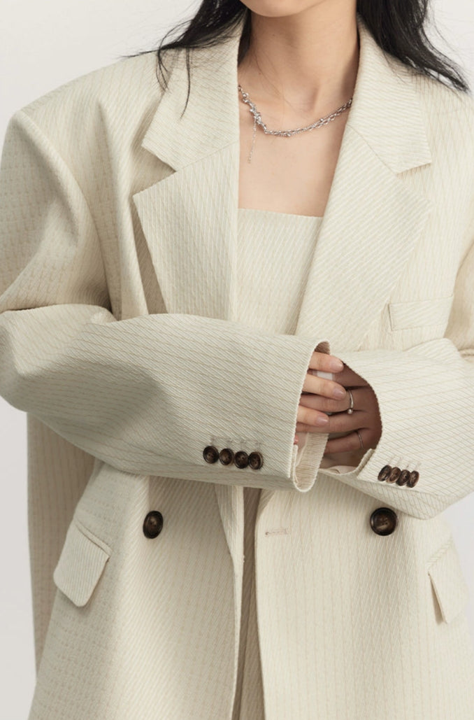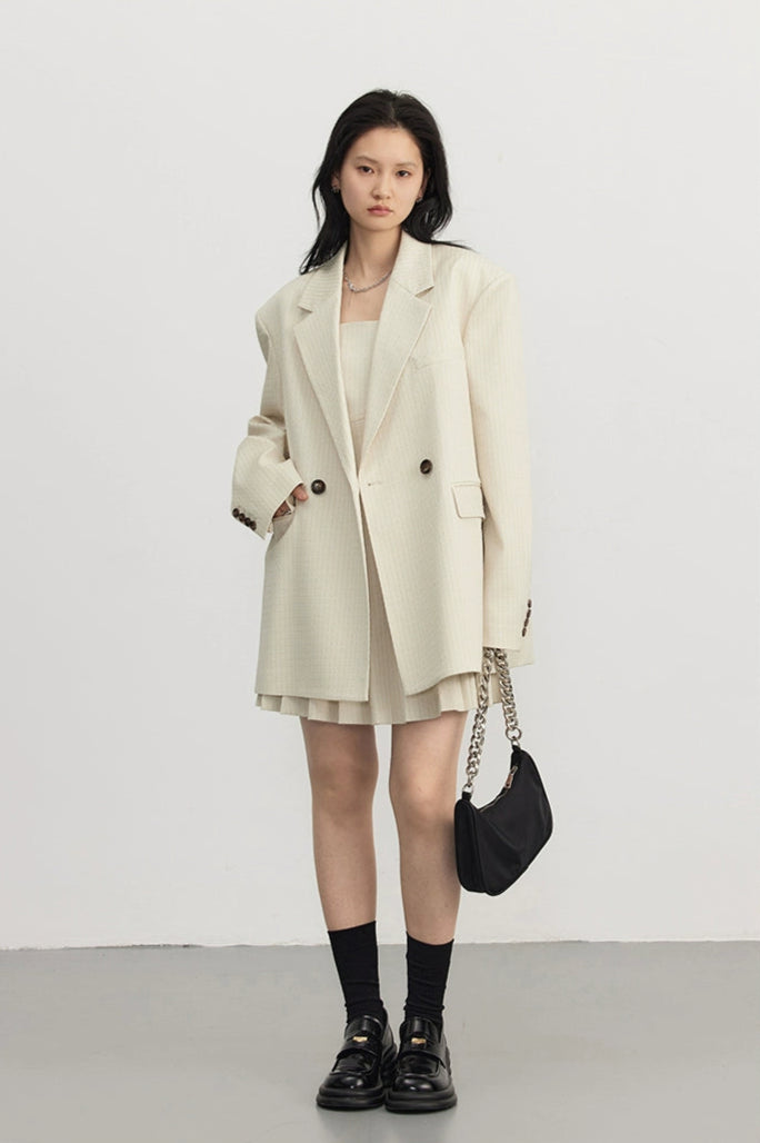 Designed for those who appreciate details that don’t beg for attention, this set is understated but far from basic. Made from a luxe, irregular twill jacquard with a subtle pinstripe, the fabric holds its shape while delivering all-day comfort. The double-breasted blazer features tonal buttons and an oversized silhouette, paired with a pleated mini dress that balances softness and edge.