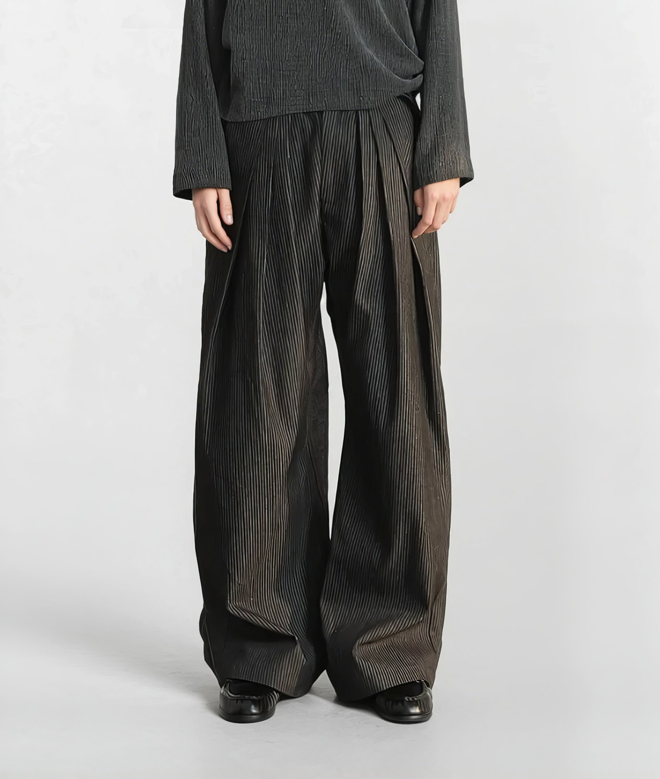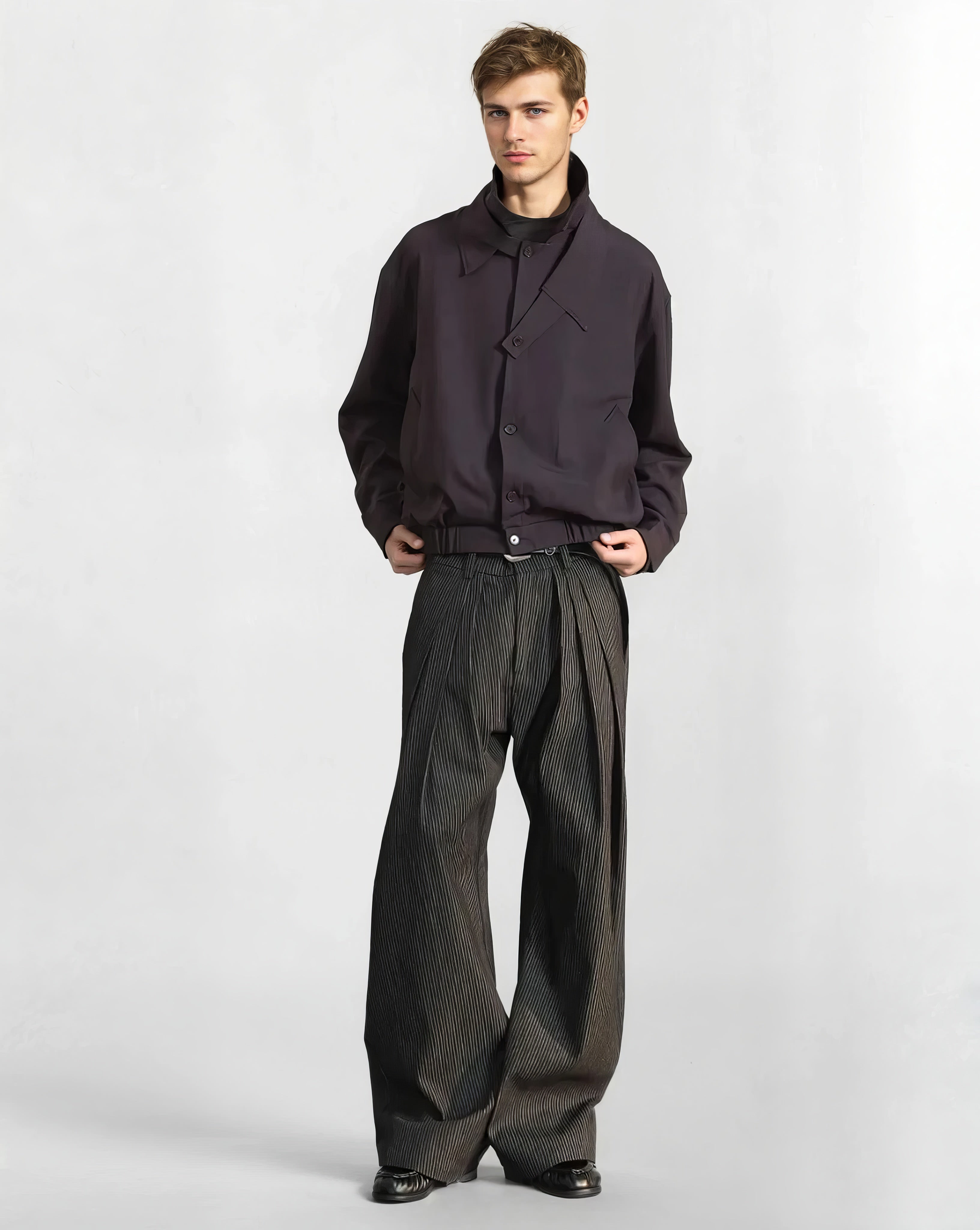 Crafted from a heavyweight cotton-poly blended denim, these trousers feature crisp vertical pinstripes woven into the fabric and a distinctive triple-pleated front. The A-line cut and precision pleats are heat-set to retain shape, offering a relaxed but structured silhouette that streamlines the waist and elongates the leg. Durable seam construction and clean edge finishing balance style with everyday wear.