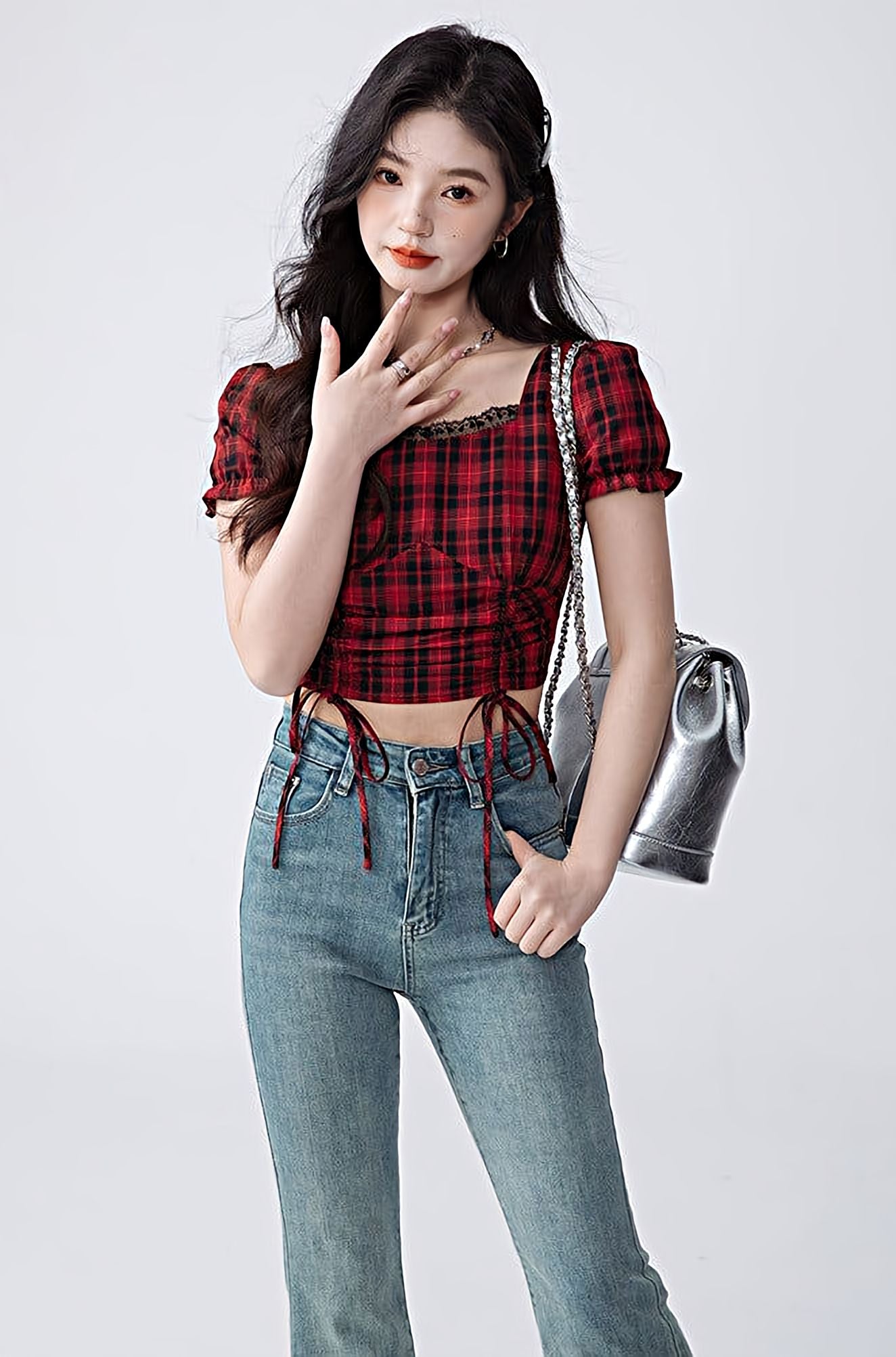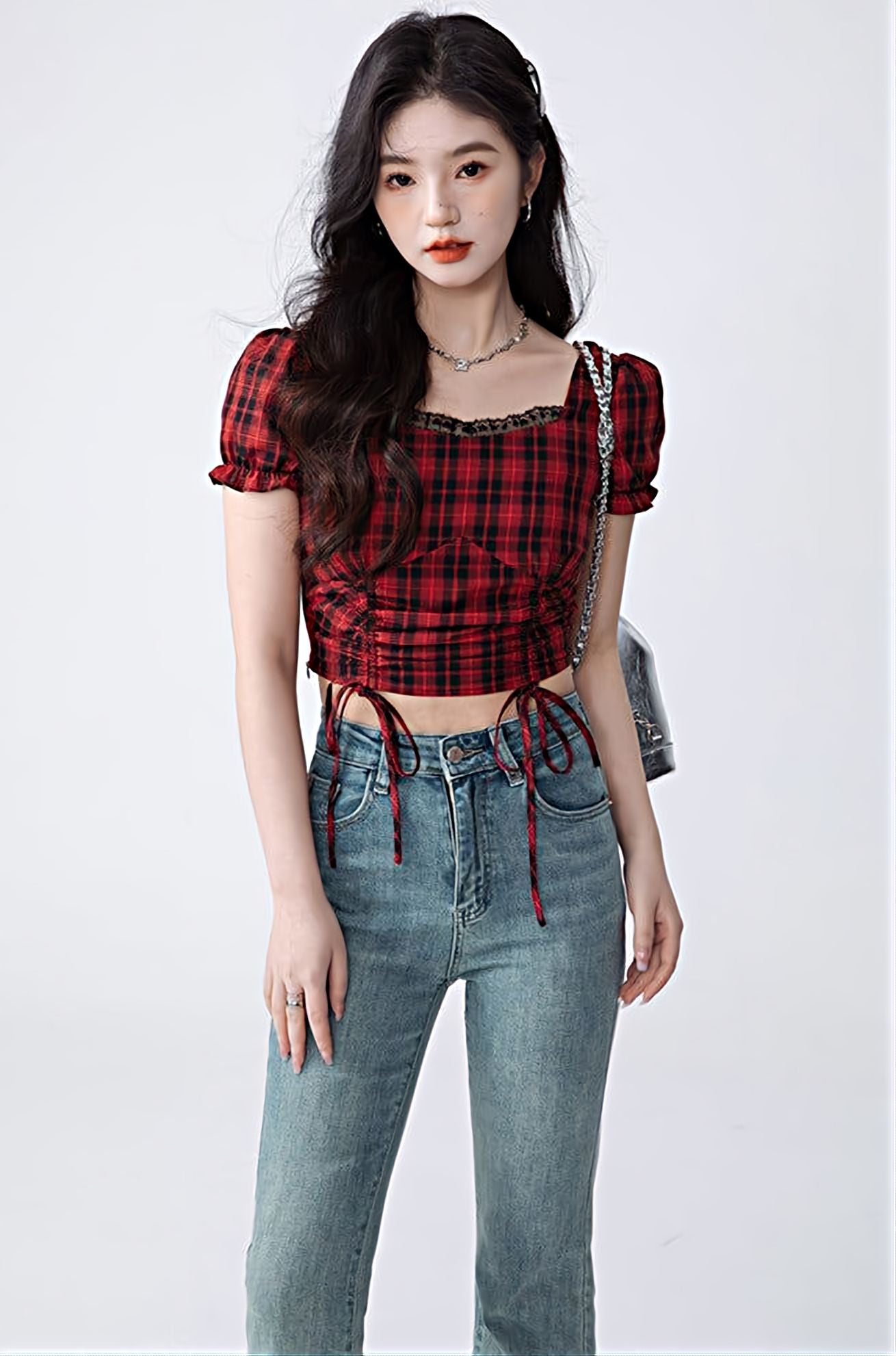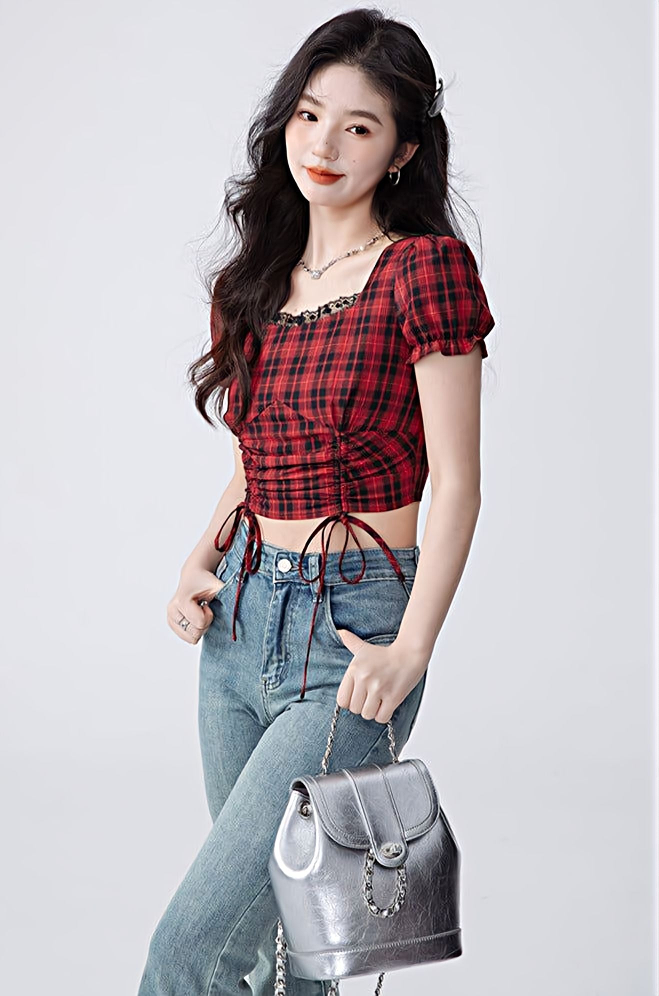 Read full Return PolicyThis Plaid Ruched Puff Sleeve Crop Top is perfect for everyday wear. It features a casual plaid pattern made of soft cotton fabric, and modern ruched puff sleeves with drawstrings for adjustable fit. Wear this top with jeans or skirts for a fashionable, comfortable look.