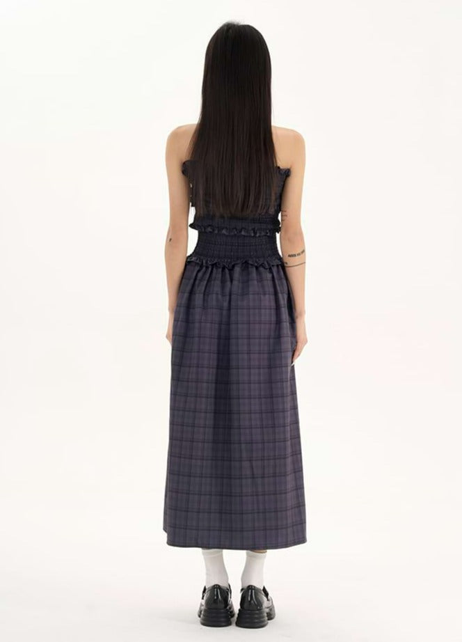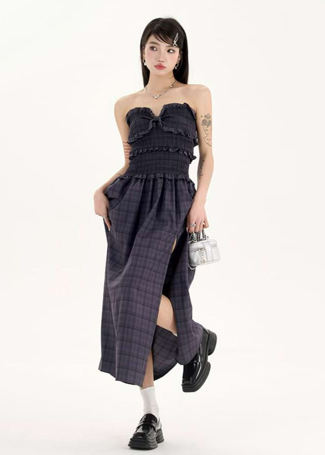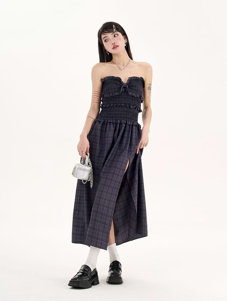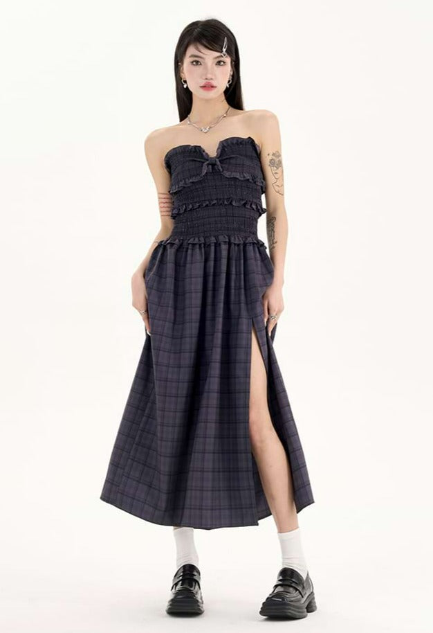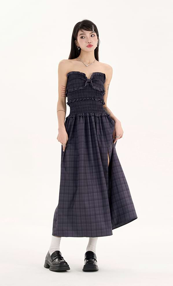 Read full Return PolicyThis timeless Plaid Ruffle Tube Midi Dress adds a formal touch to any outfit. The side slit gives the dress just the right amount of movement, while the ruched back design offers a flattering fit. Easily layer it under a blazer or cardigan for cooler weather, or pair it with elegant sandals or heels to complete the look.
