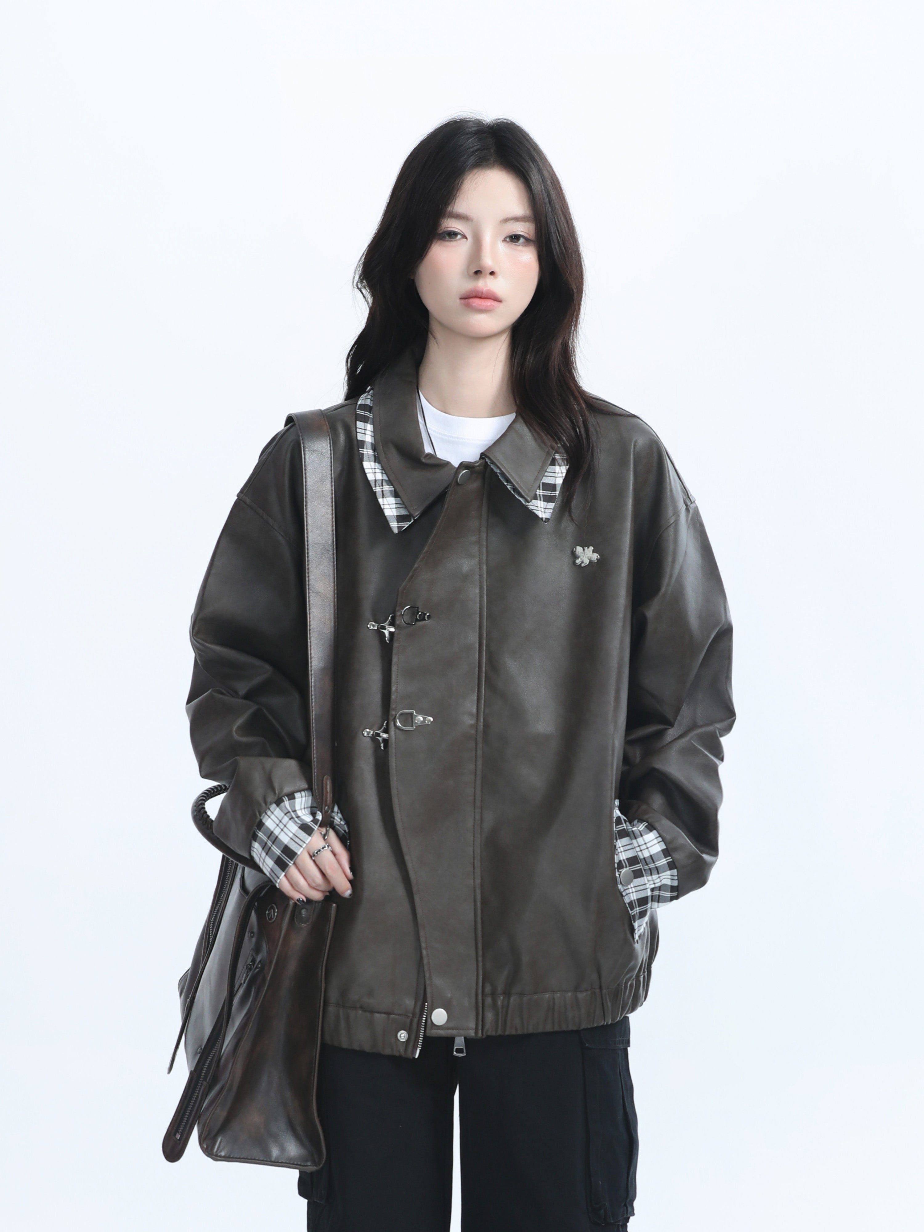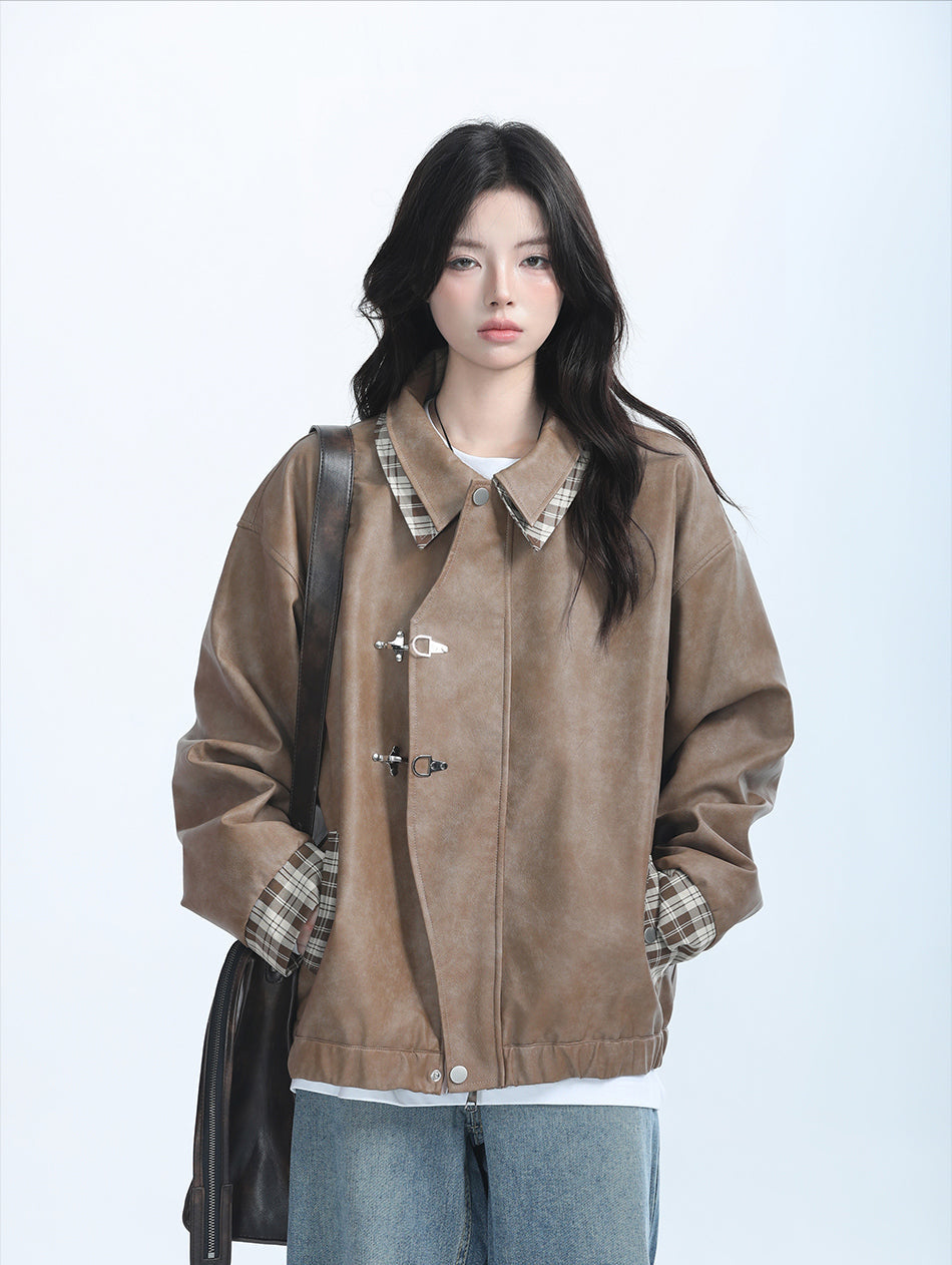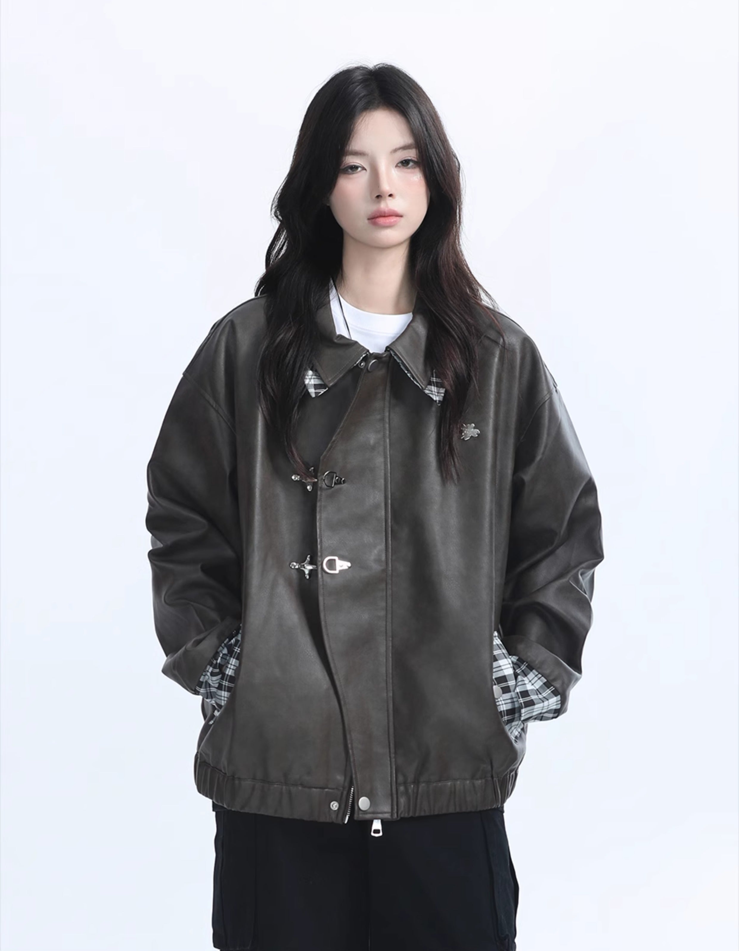 Featuring a soft faux leather exterior and subtly checked plaid accents on the collar and cuffs, this piece adds dimension to your look while staying effortlessly cool. The fireman-style metal buckle closures add functionality and industrial flair, making this jacket both practical and stylish.