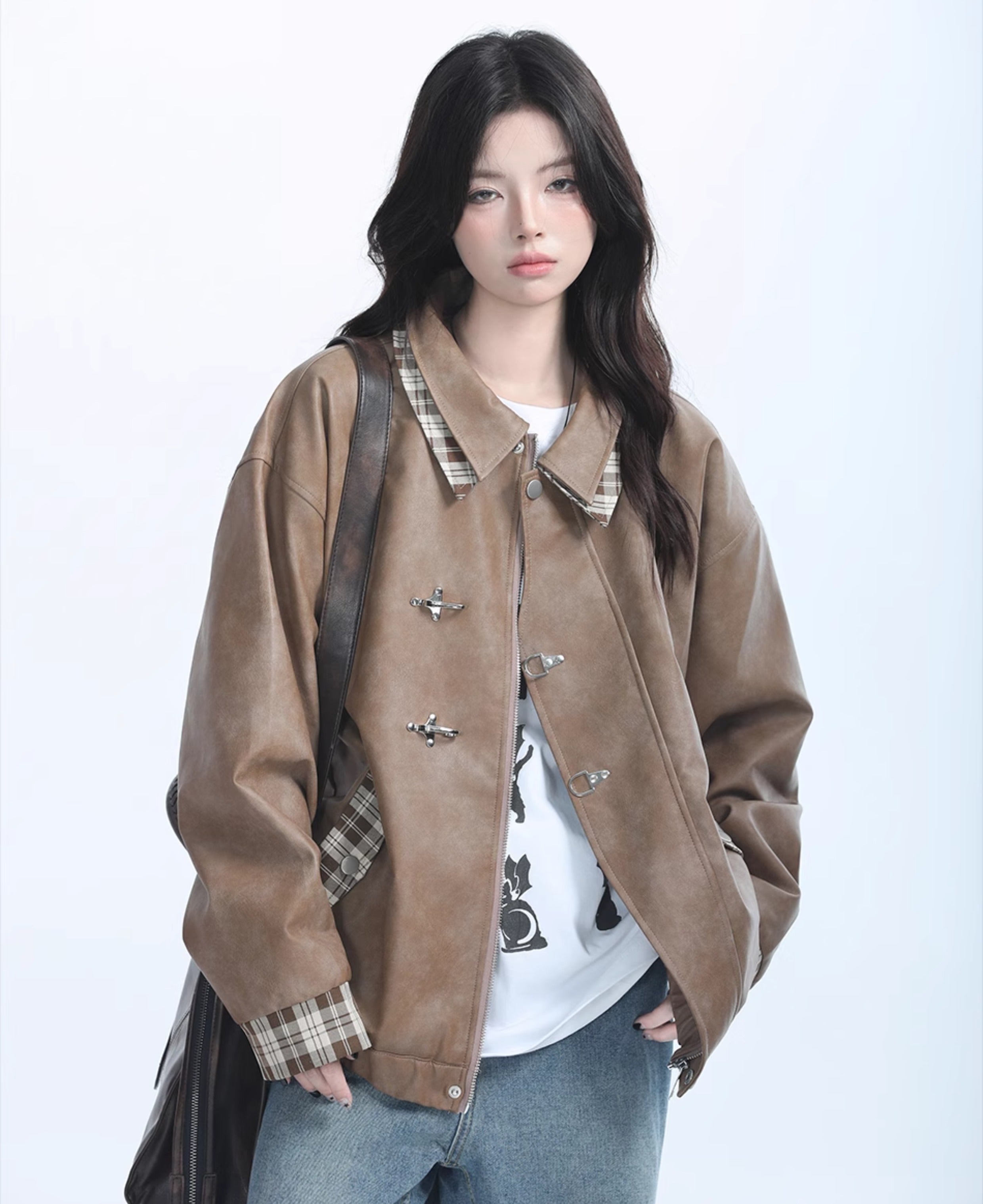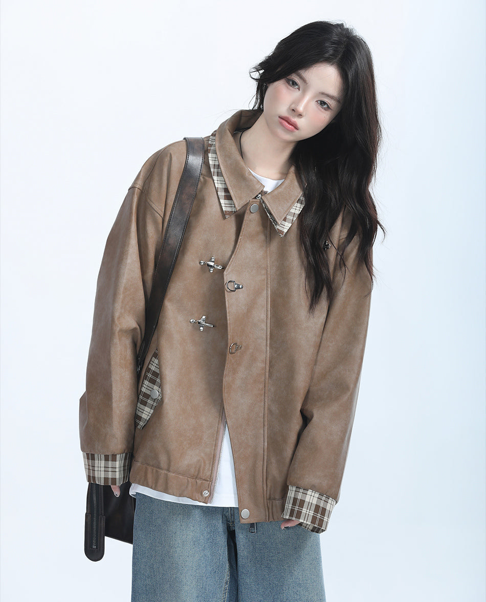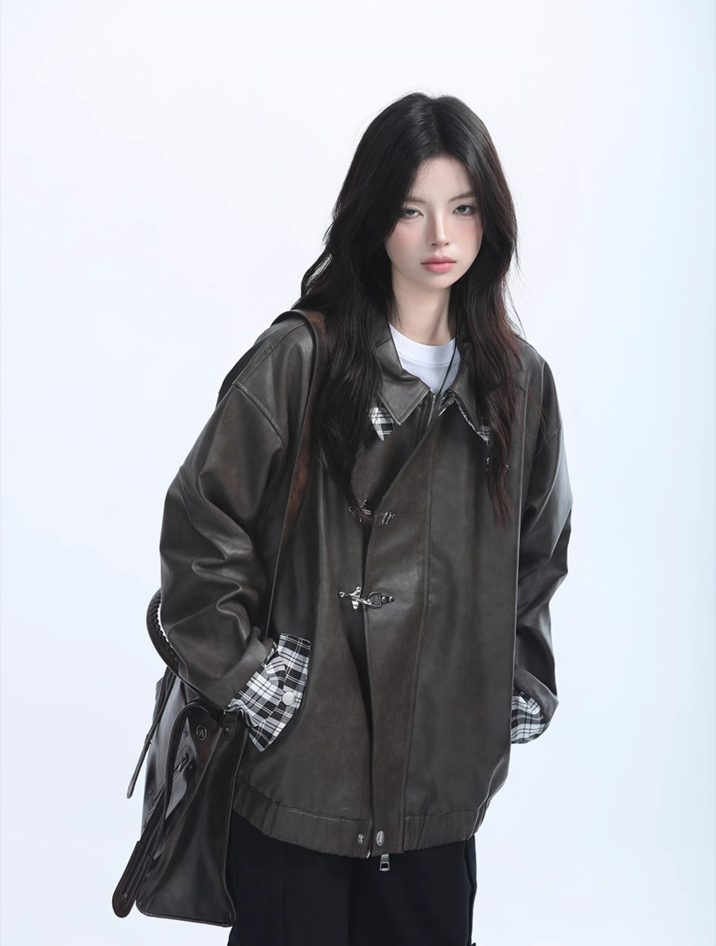 Featuring a soft faux leather exterior and subtly checked plaid accents on the collar and cuffs, this piece adds dimension to your look while staying effortlessly cool. The fireman-style metal buckle closures add functionality and industrial flair, making this jacket both practical and stylish.