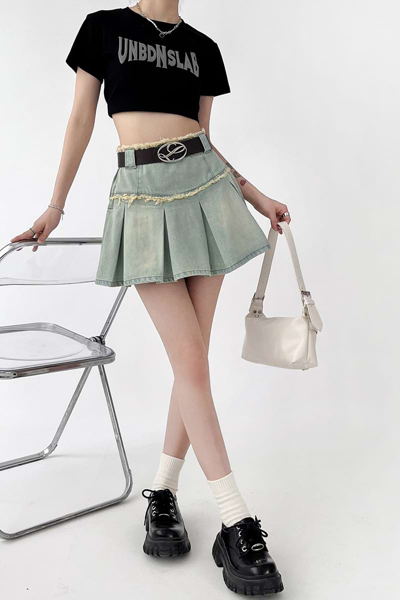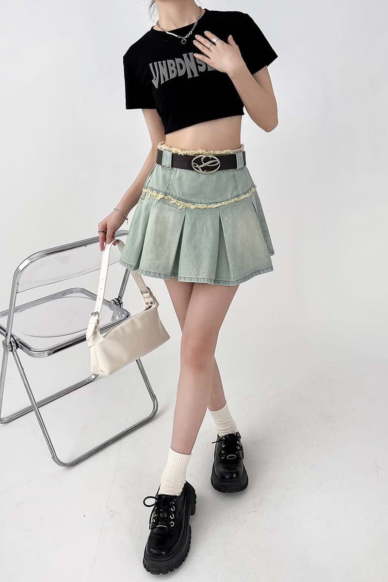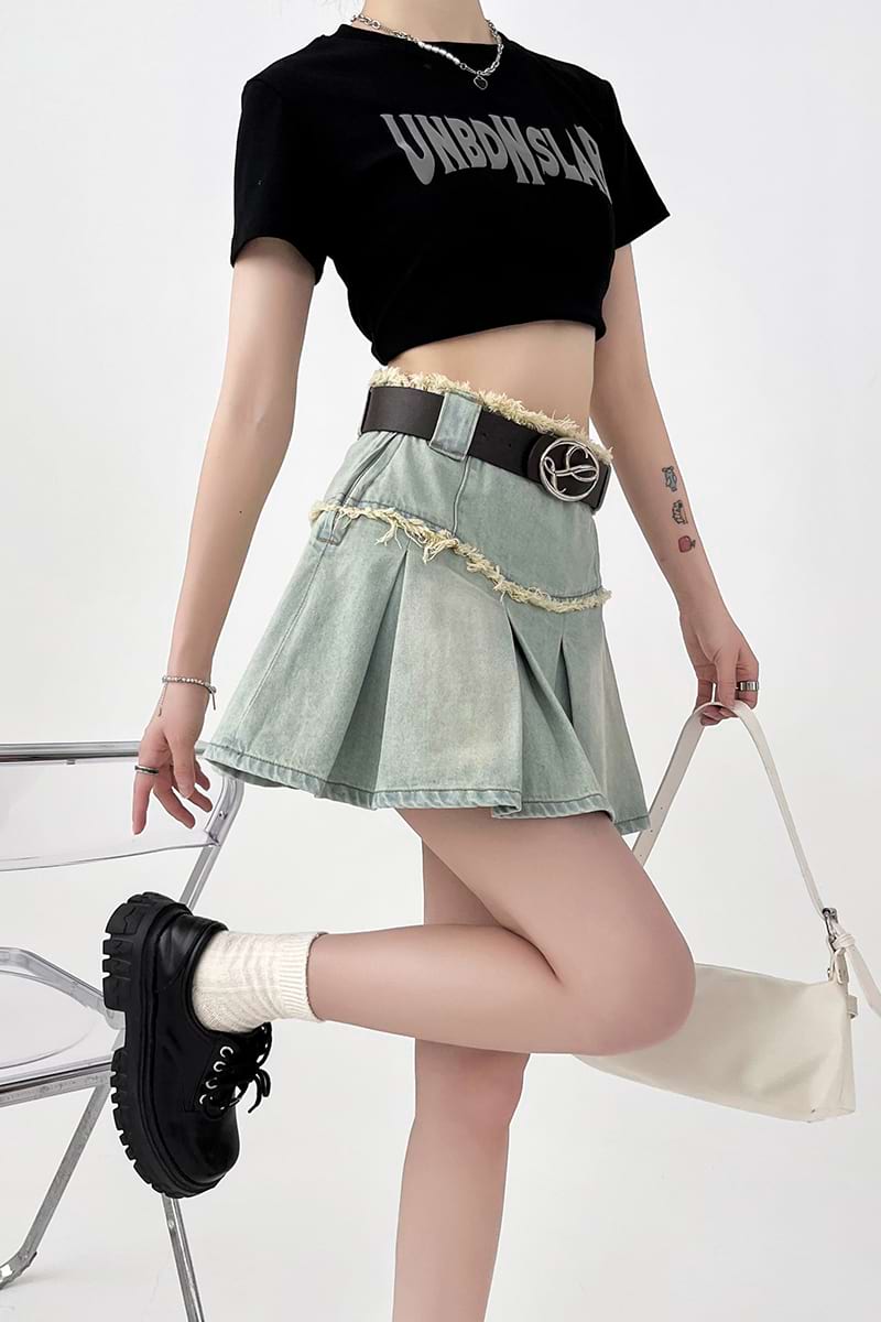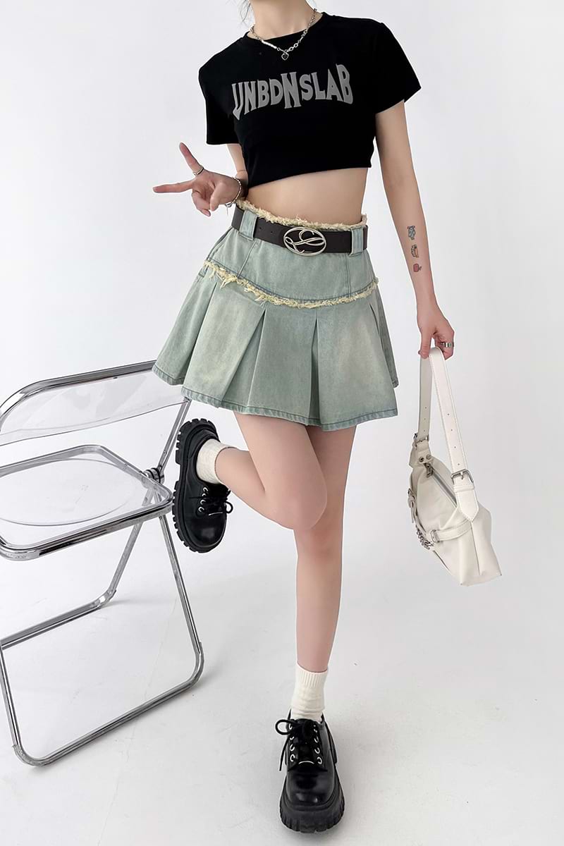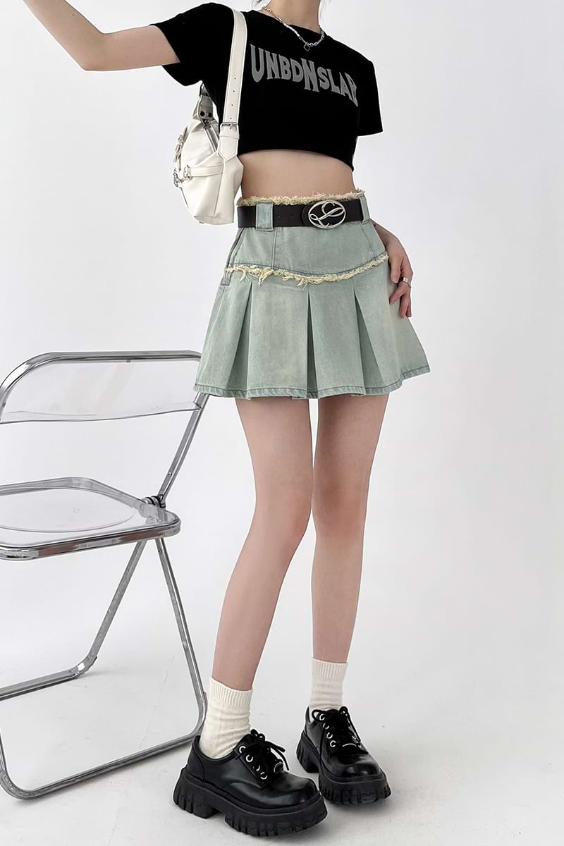 Read full Return PolicyThis Pleated Denim Mini Skirt offers casual, effortless style. Its versatile design allows you to style it with a crop top and boots for a more elevated look, or go for a more casual look with a basic tee and flats or sneakers.