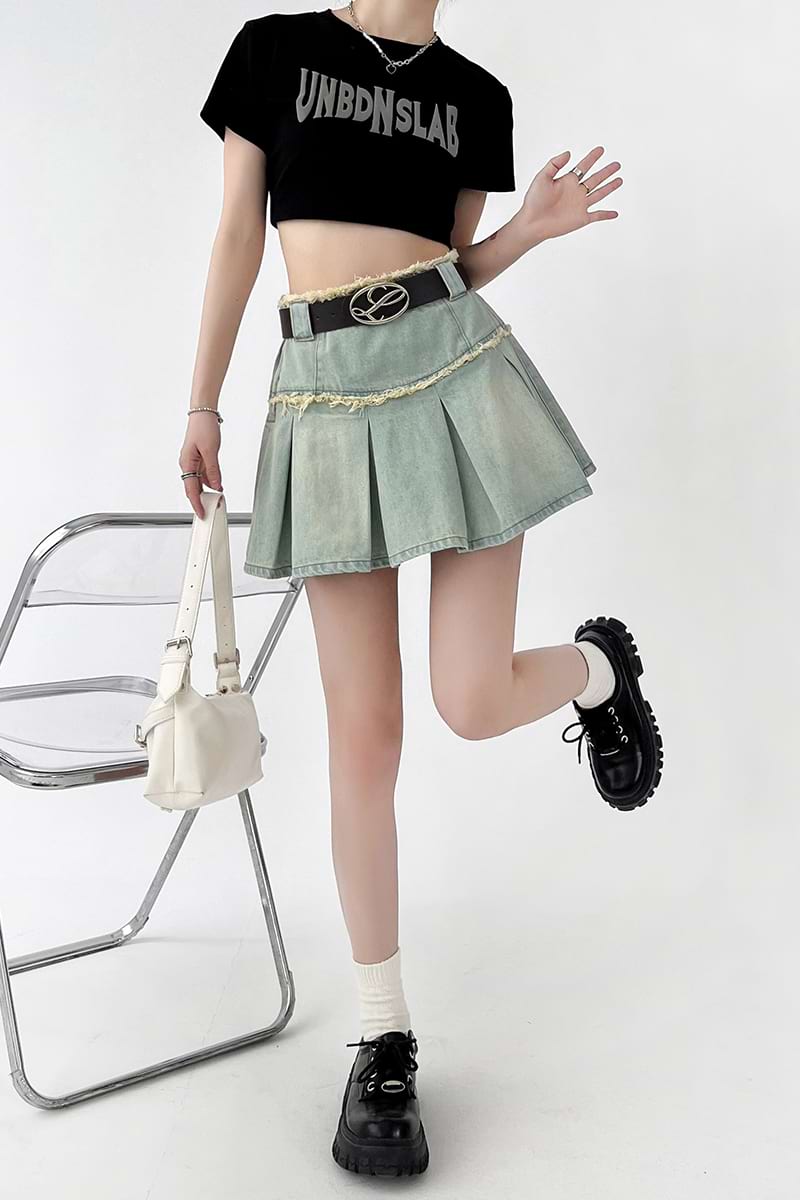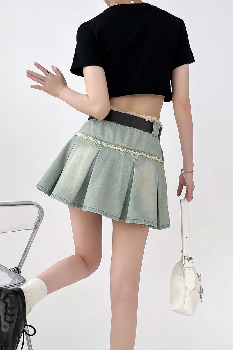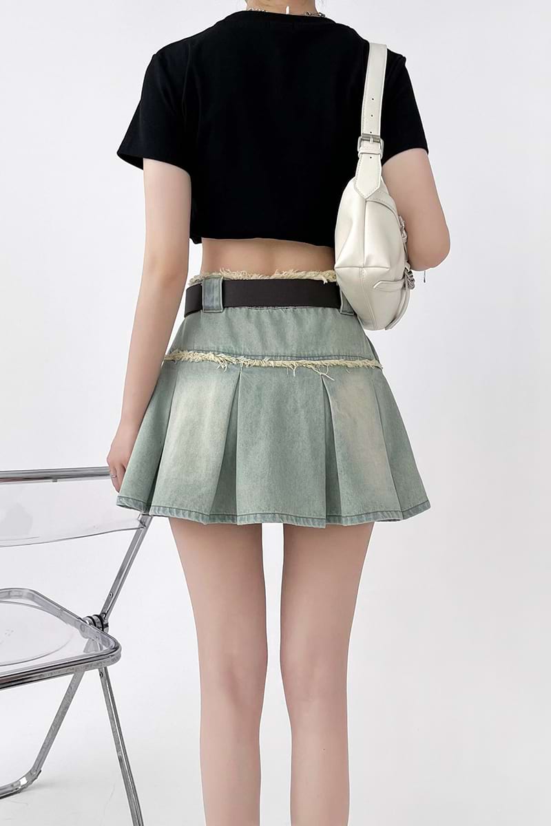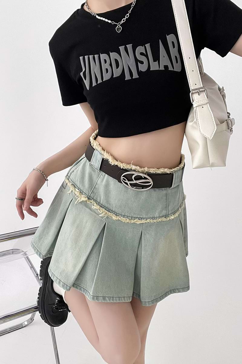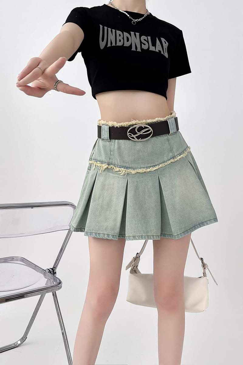 Read full Return PolicyThis Pleated Denim Mini Skirt offers casual, effortless style. Its versatile design allows you to style it with a crop top and boots for a more elevated look, or go for a more casual look with a basic tee and flats or sneakers.