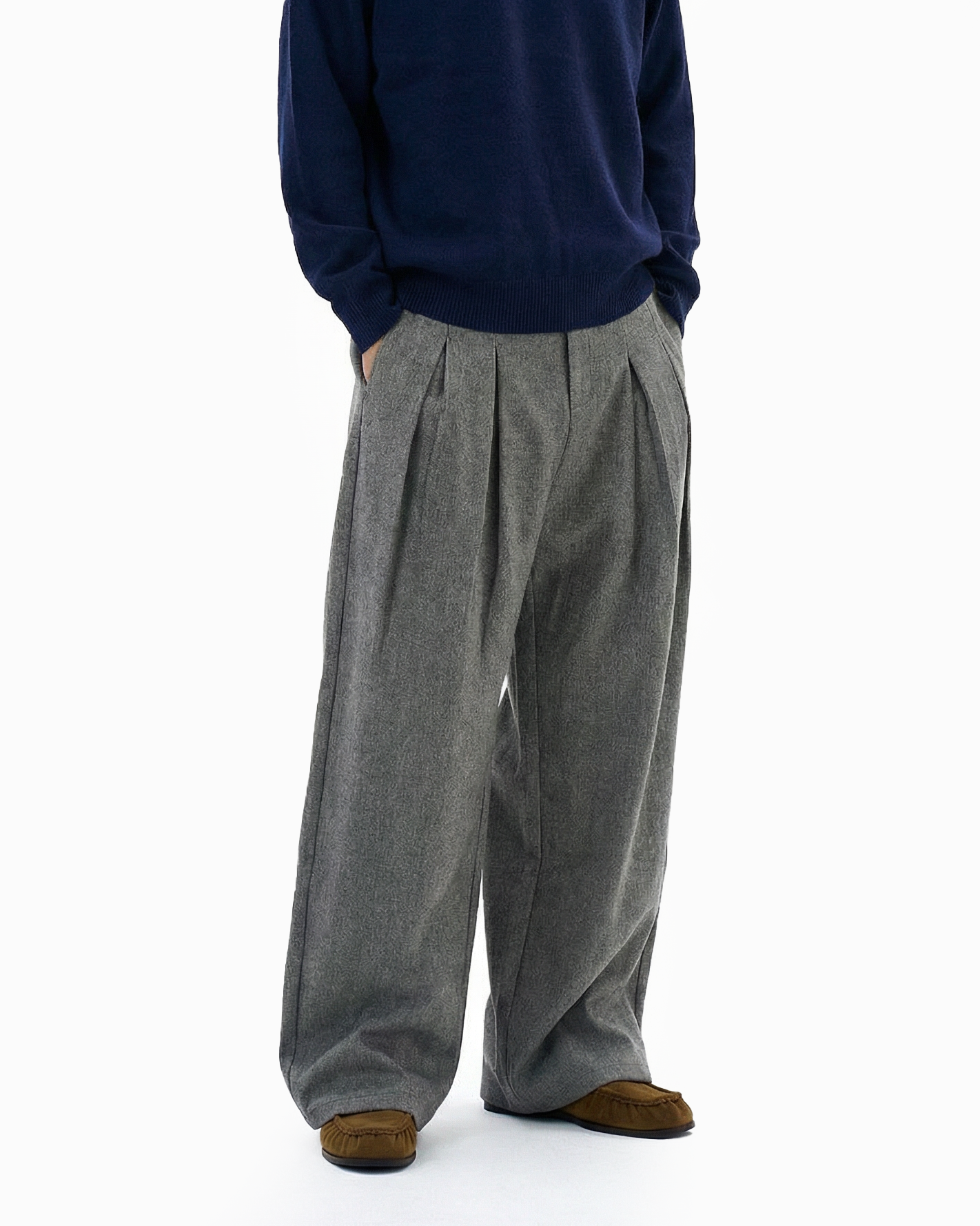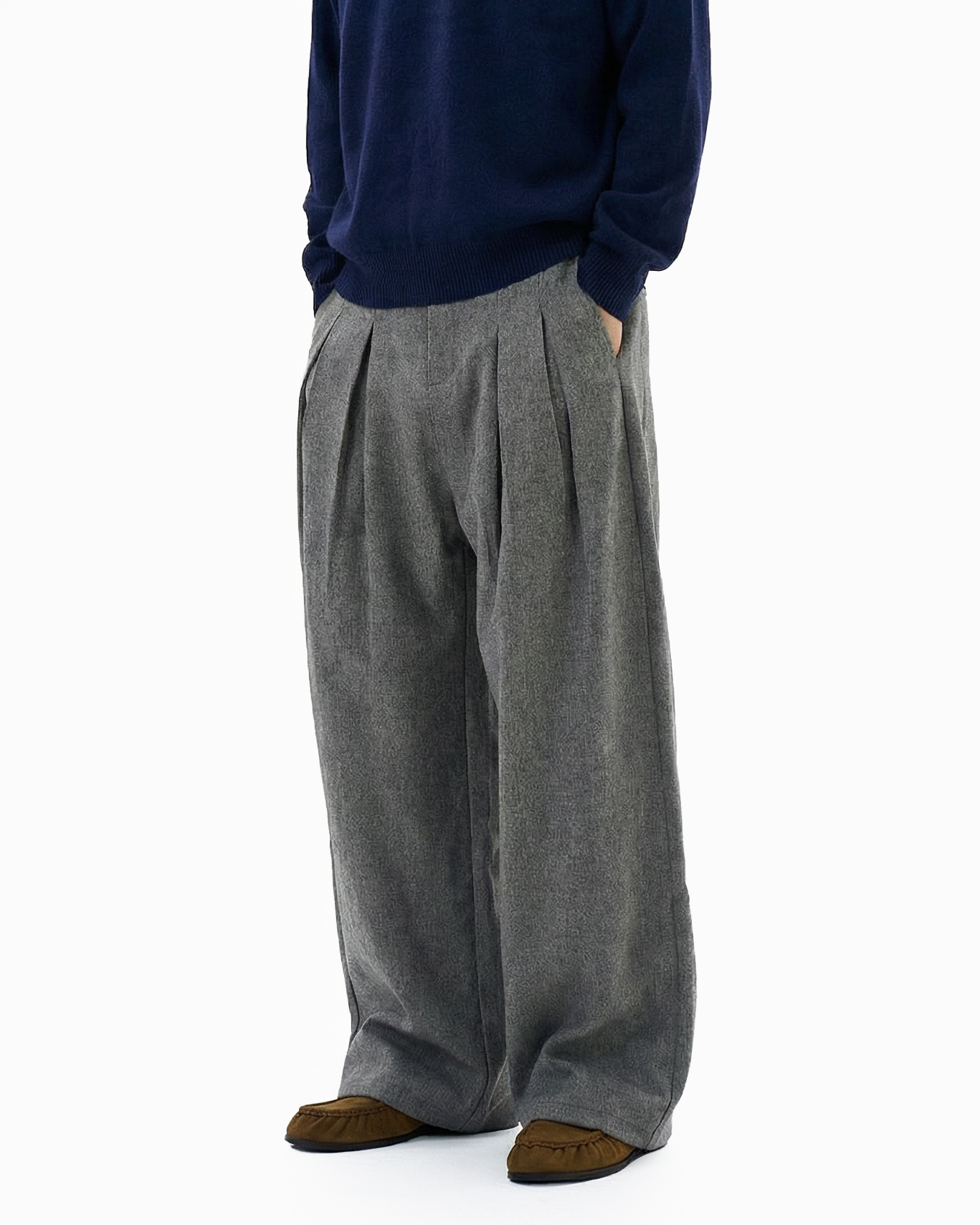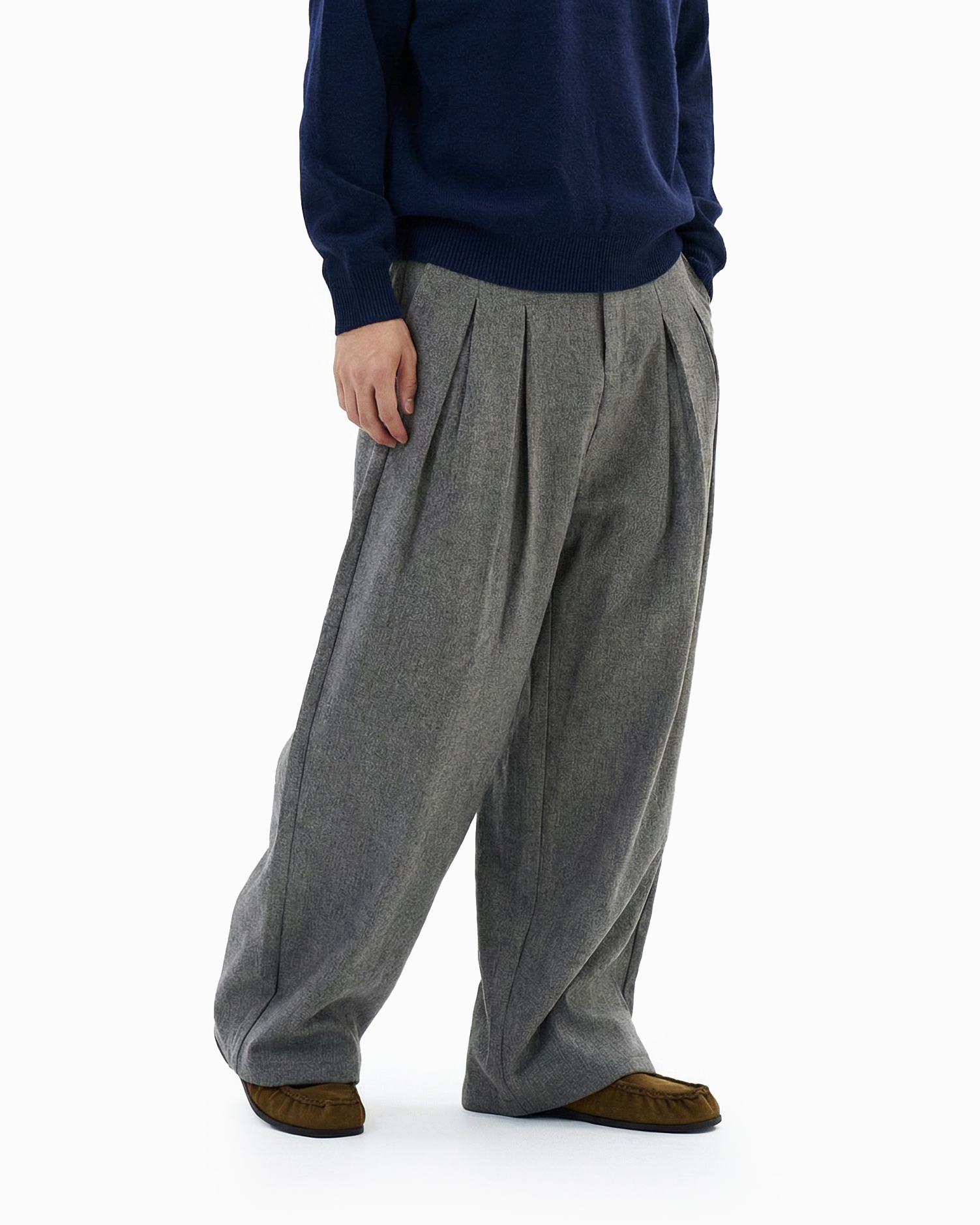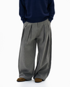 The loose silhouette and structured pleats create natural drape and movement, giving them a presence without trying too hard. Crafted from a smooth woven fabric with a clean, soft hand feel, the trousers feature a subtle heathered finish that adds texture without excess. The pleated front nods to vintage tailoring, while the wide leg cut leans into modern streetwear influences.