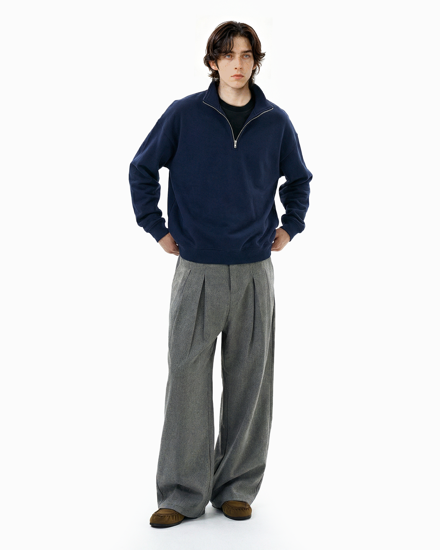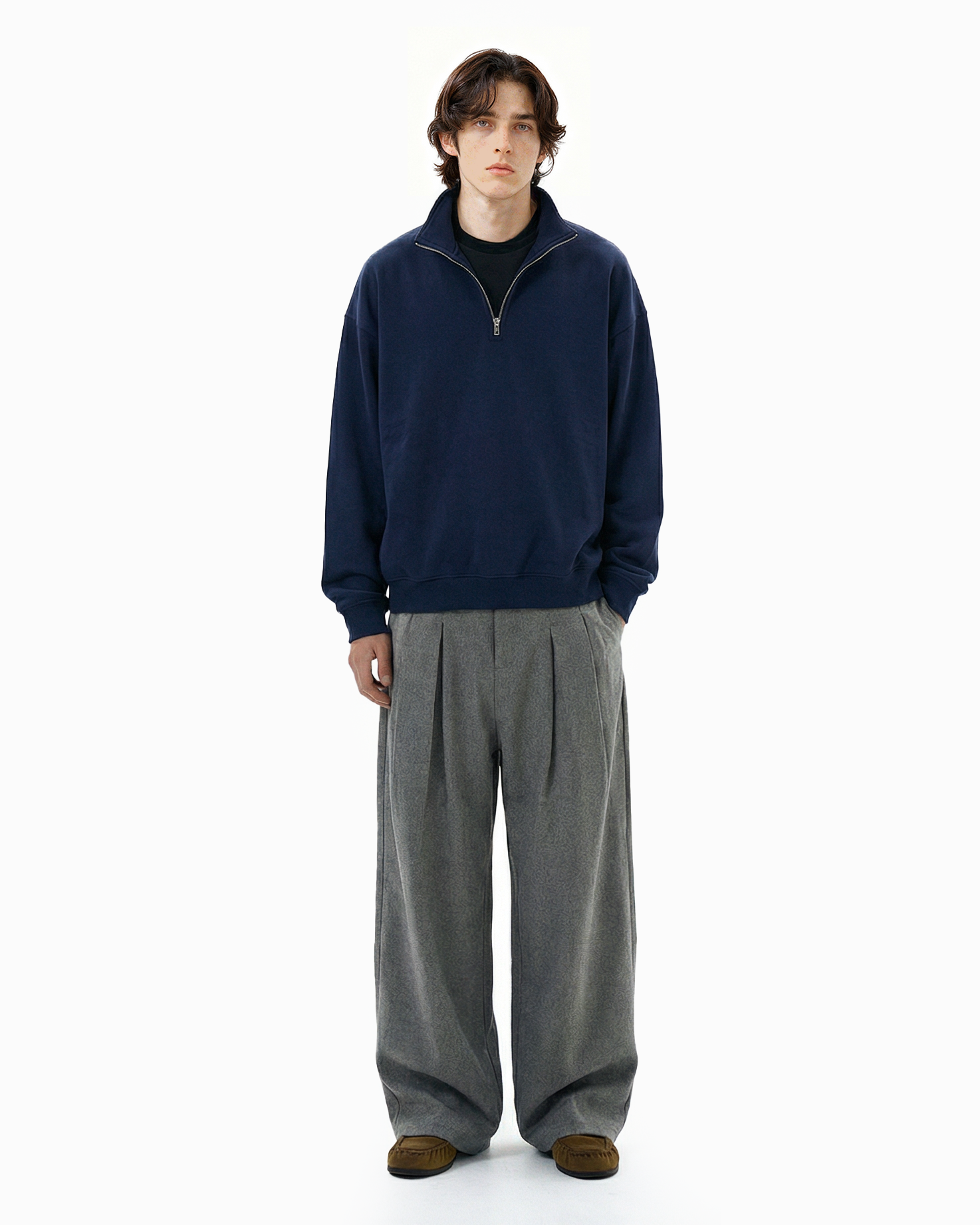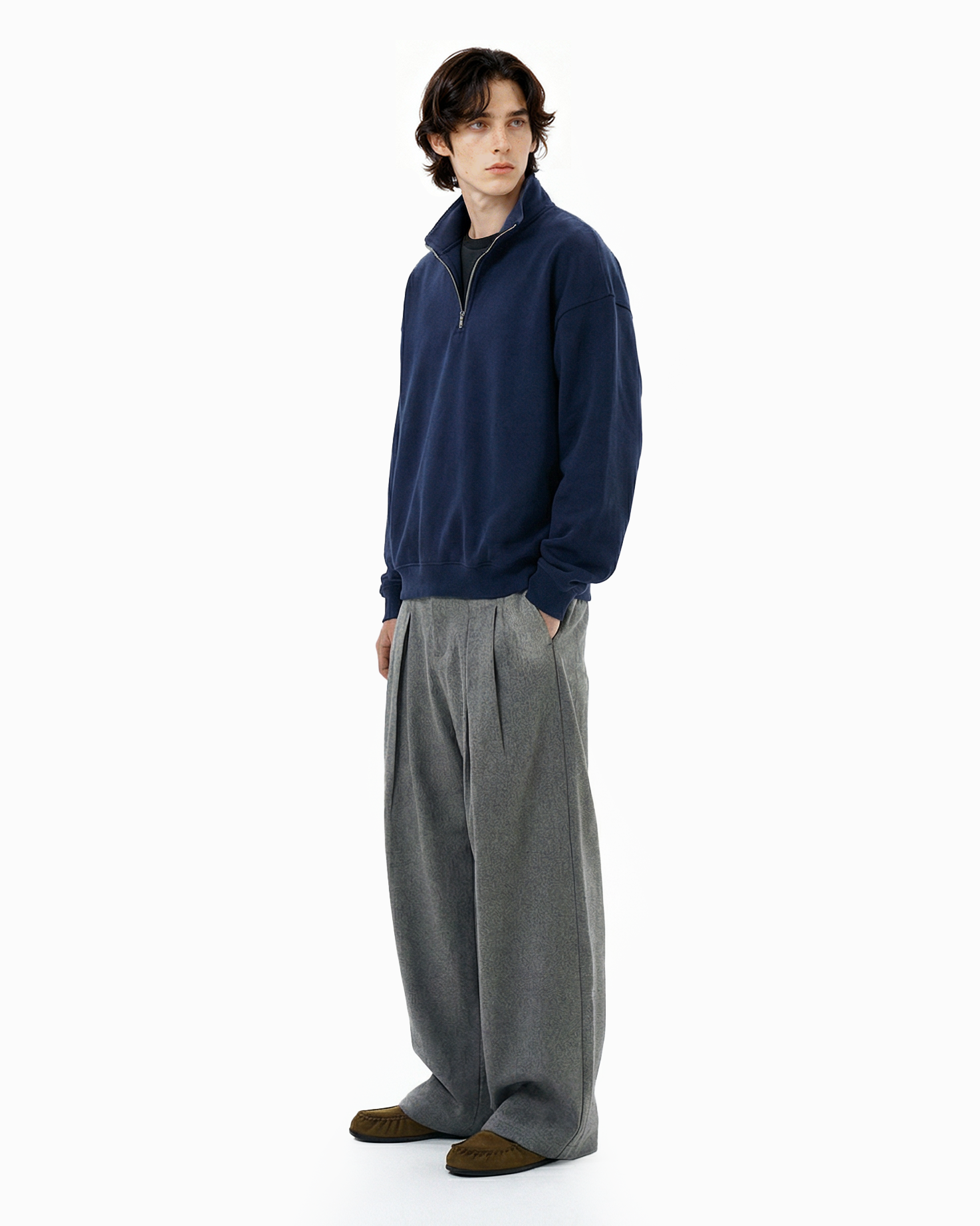 The loose silhouette and structured pleats create natural drape and movement, giving them a presence without trying too hard. Crafted from a smooth woven fabric with a clean, soft hand feel, the trousers feature a subtle heathered finish that adds texture without excess. The pleated front nods to vintage tailoring, while the wide leg cut leans into modern streetwear influences.