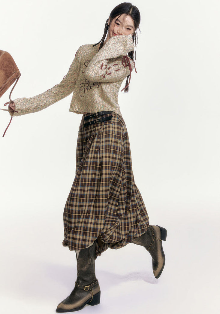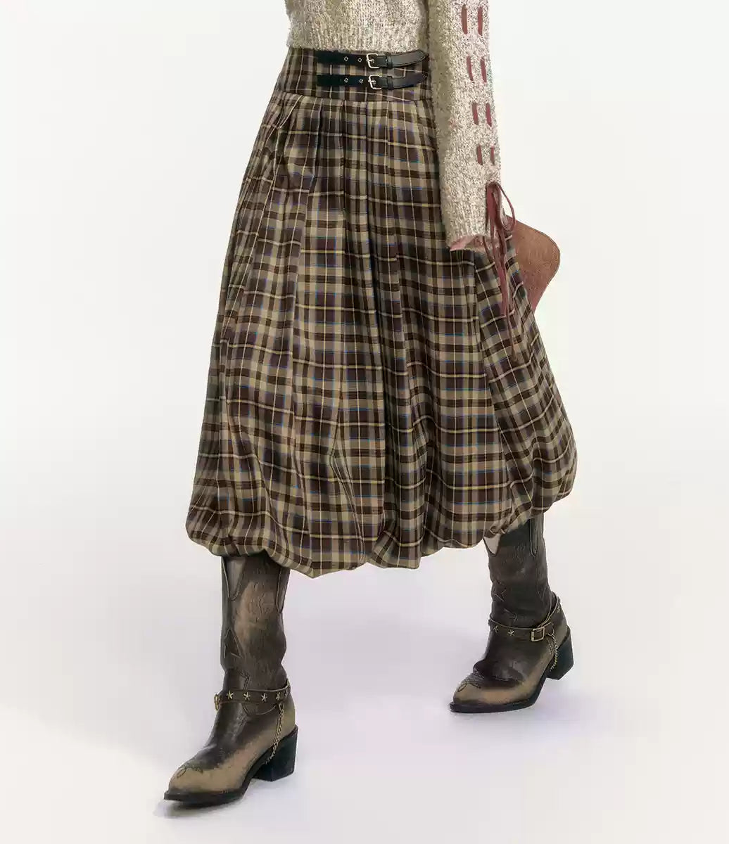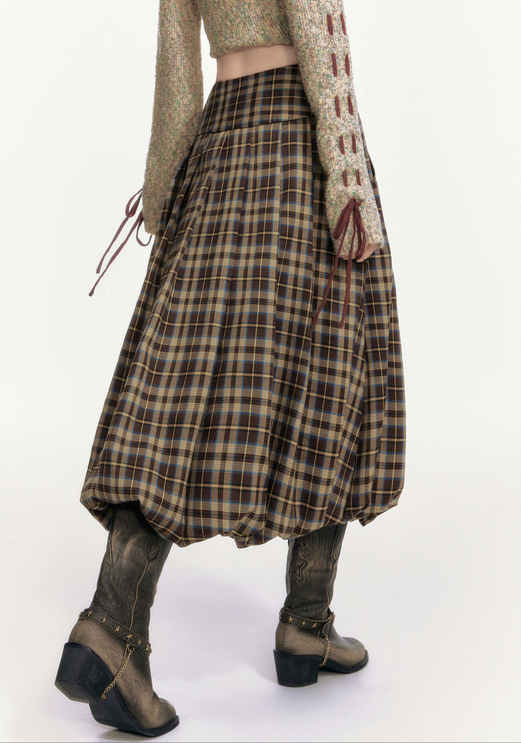 Pleated Plaid Balloon Midi Skirt with Belt Details