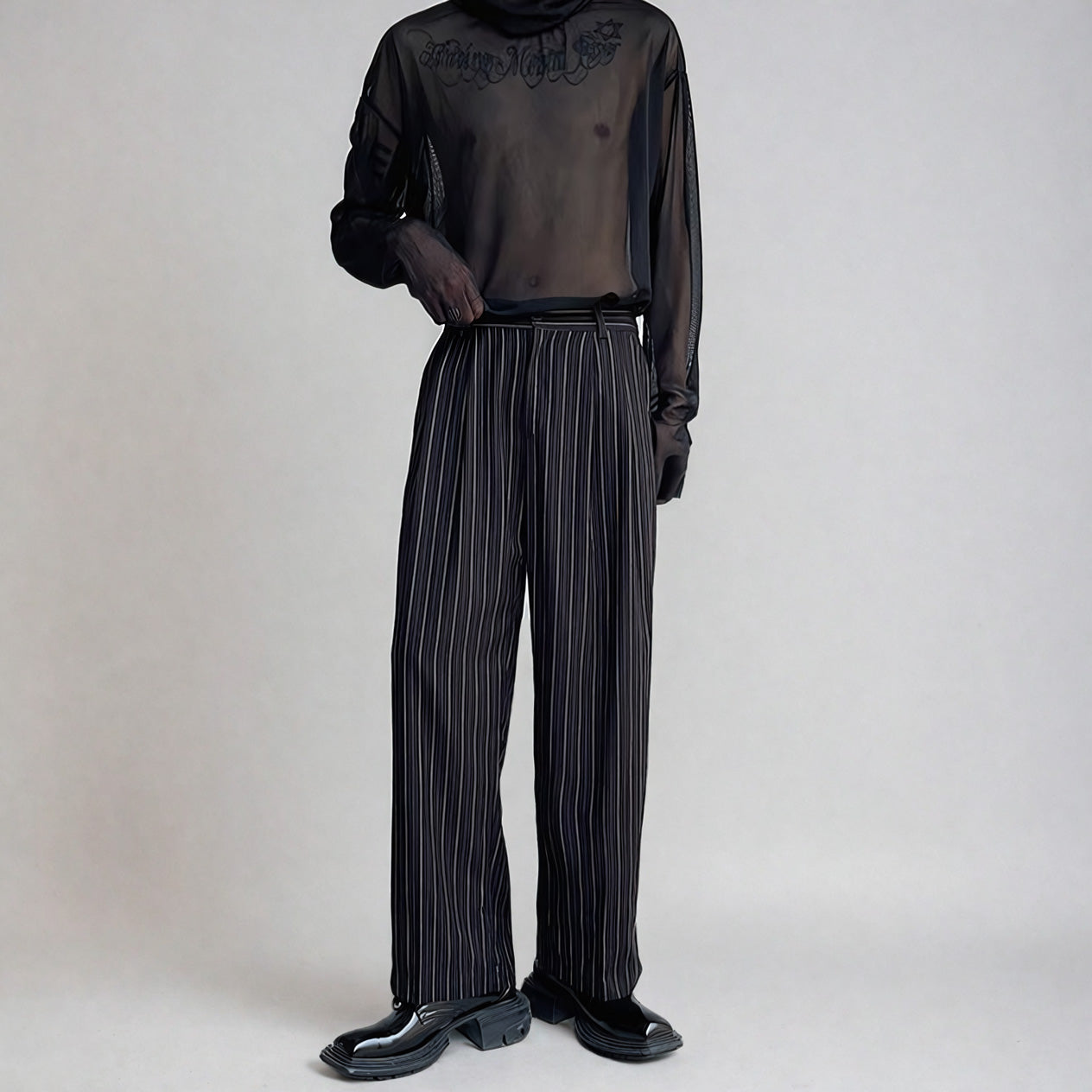 Crafted with meticulous attention to detail, these trousers boast a relaxed fit through the hips and thighs, gracefully flaring into a wide-leg silhouette. The pleated design and vertical stripe pattern not only elongate the legs but also add a touch of sophistication, making them ideal for a variety of occasions and styles.