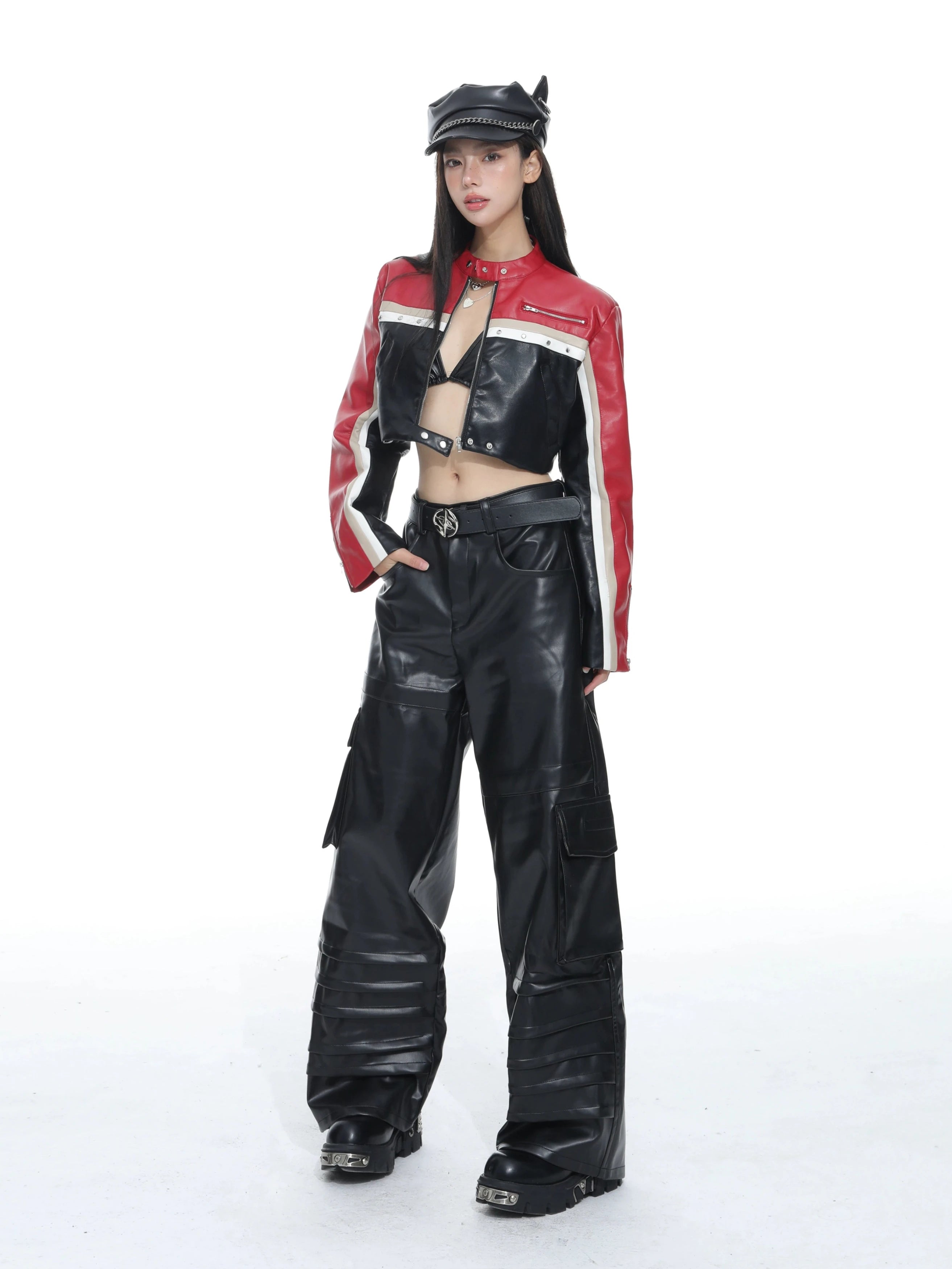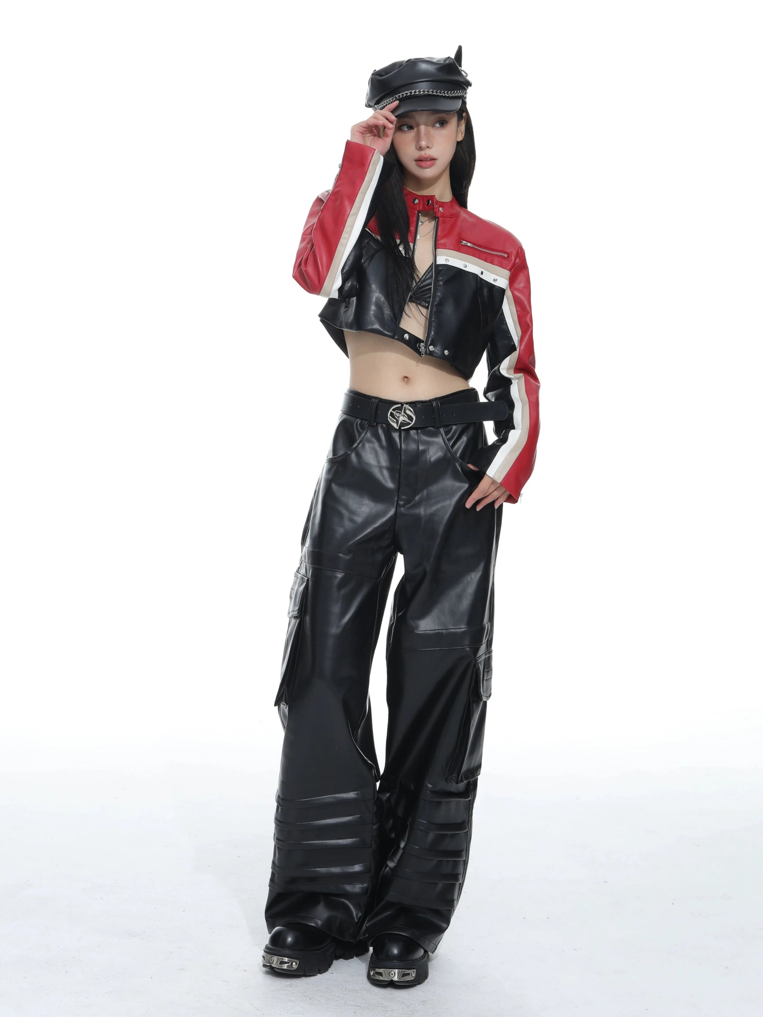 Crafted from high-quality leather, this jacket features a sharp lapel collar and a convenient zipper placket for easy wear. Distinctive black and red color blocking gives it an edgy, locomotive-chic vibe, while the cropped silhouette and conventional sleeves maintain a sleek and contemporary look.