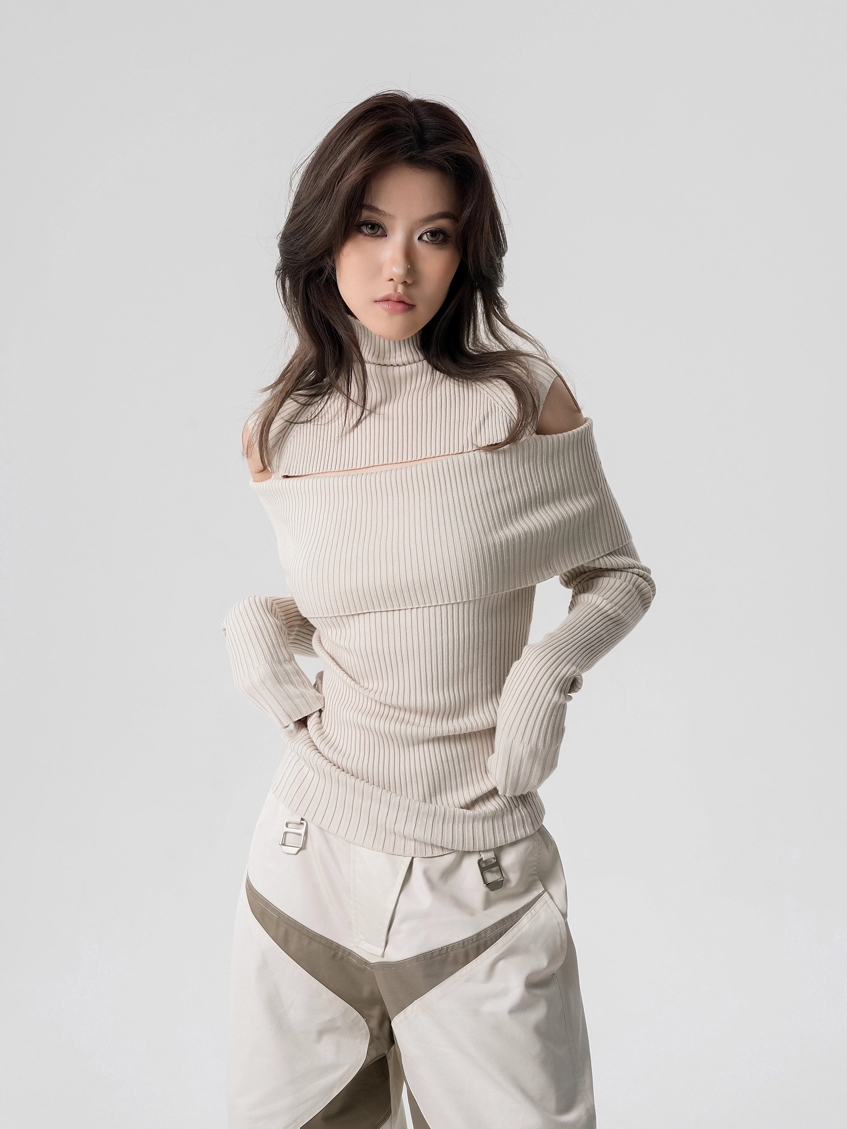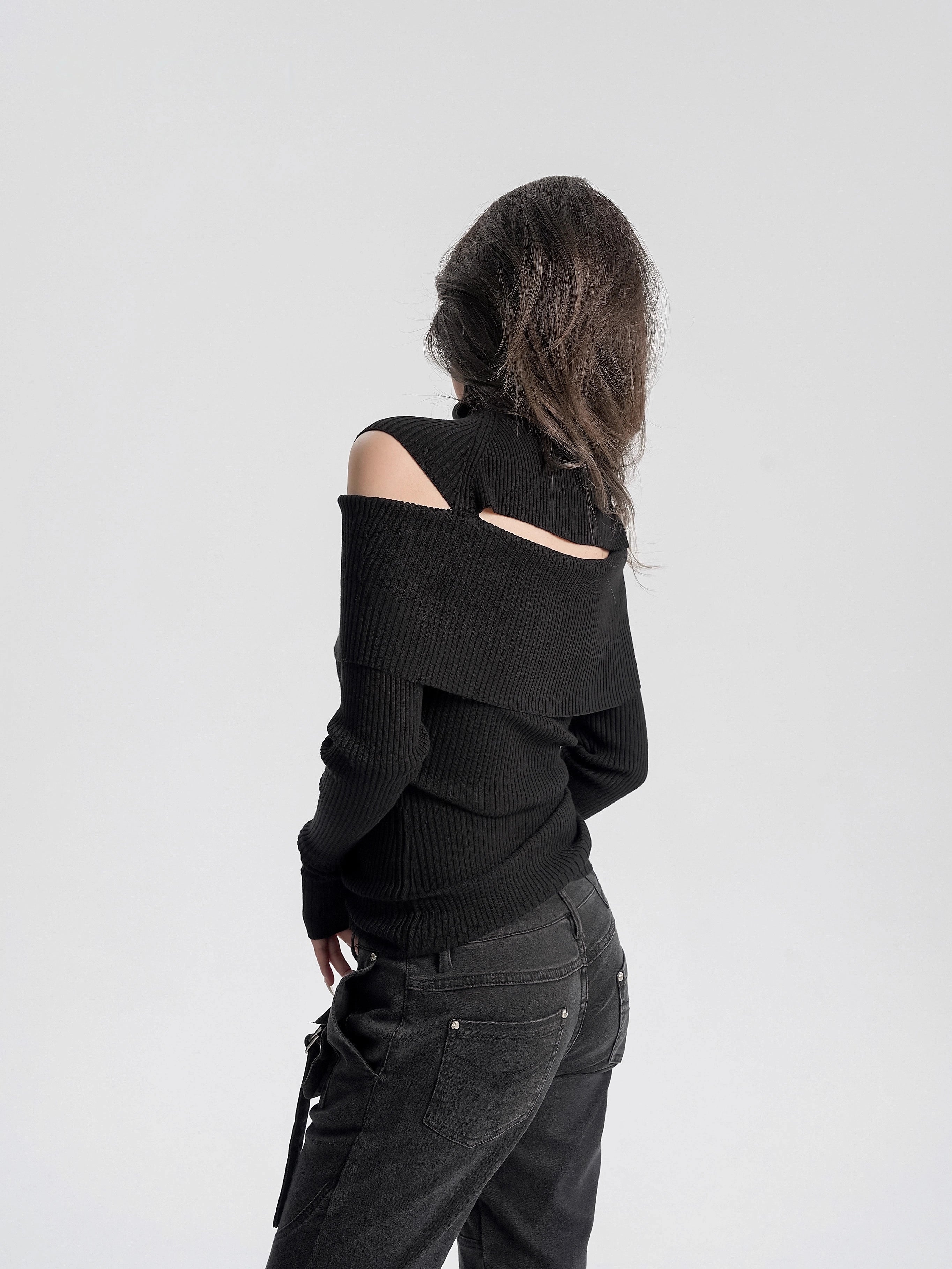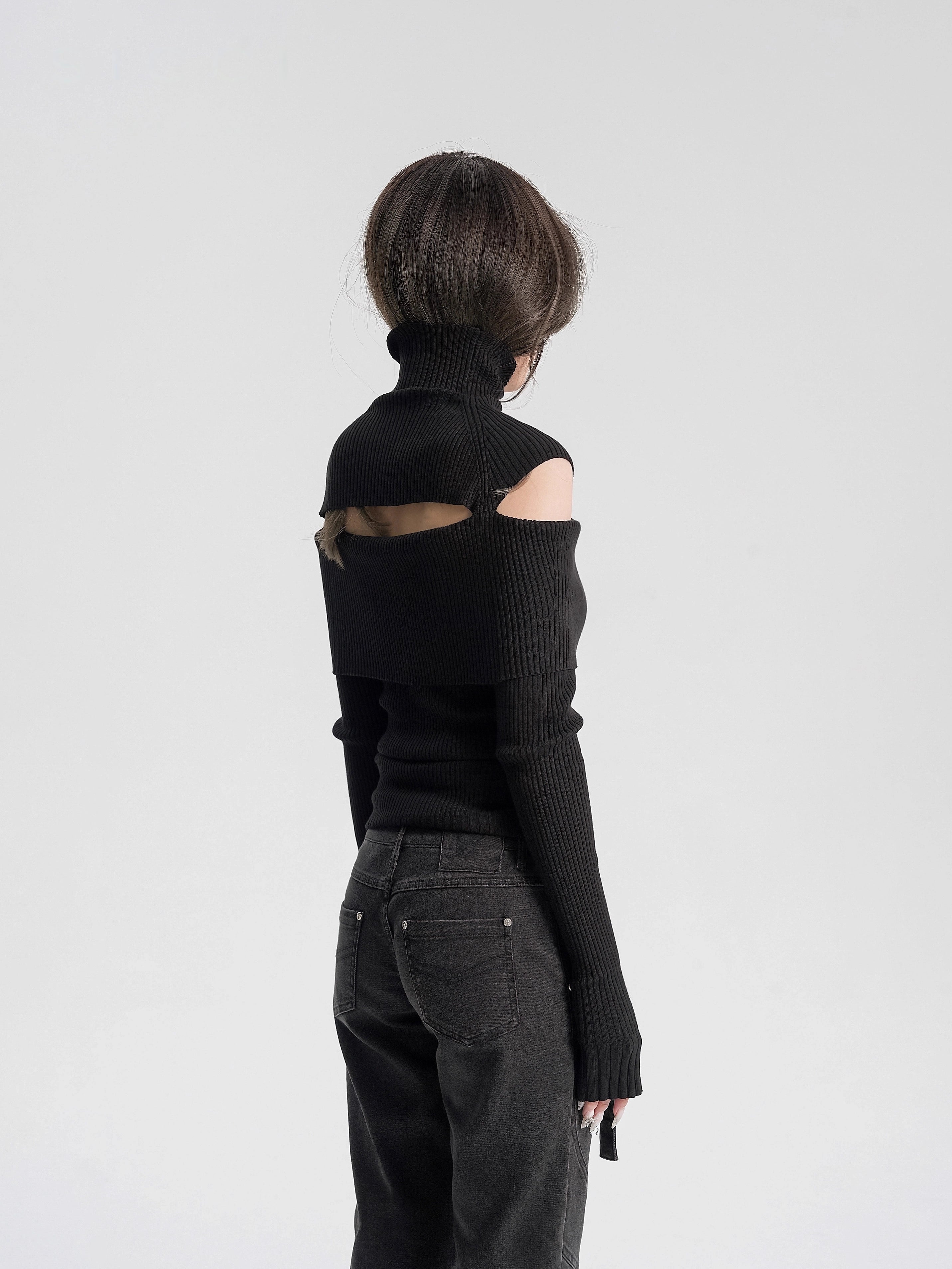 Ribbed Cold-Shoulder Cutout Turtleneck Sweater