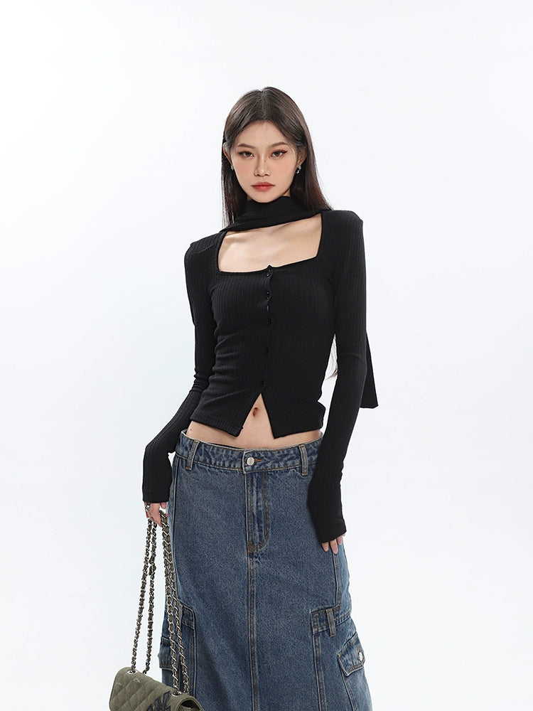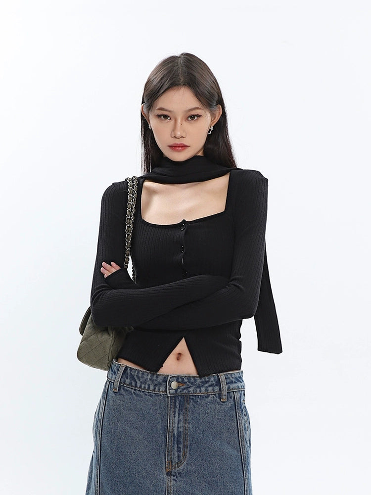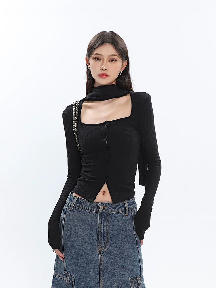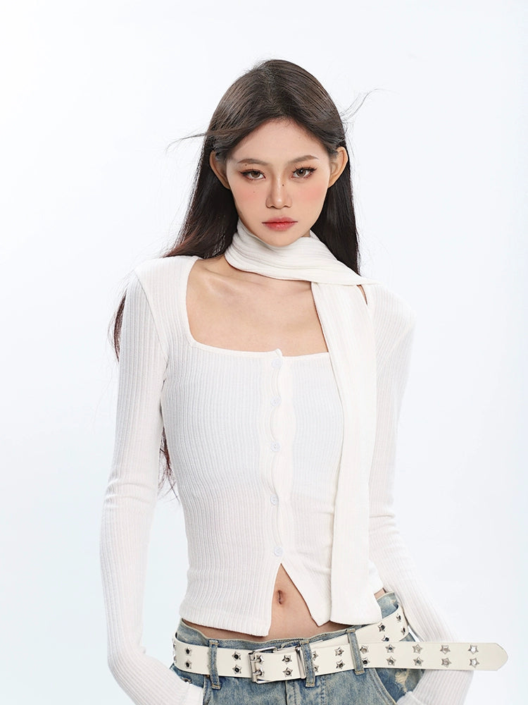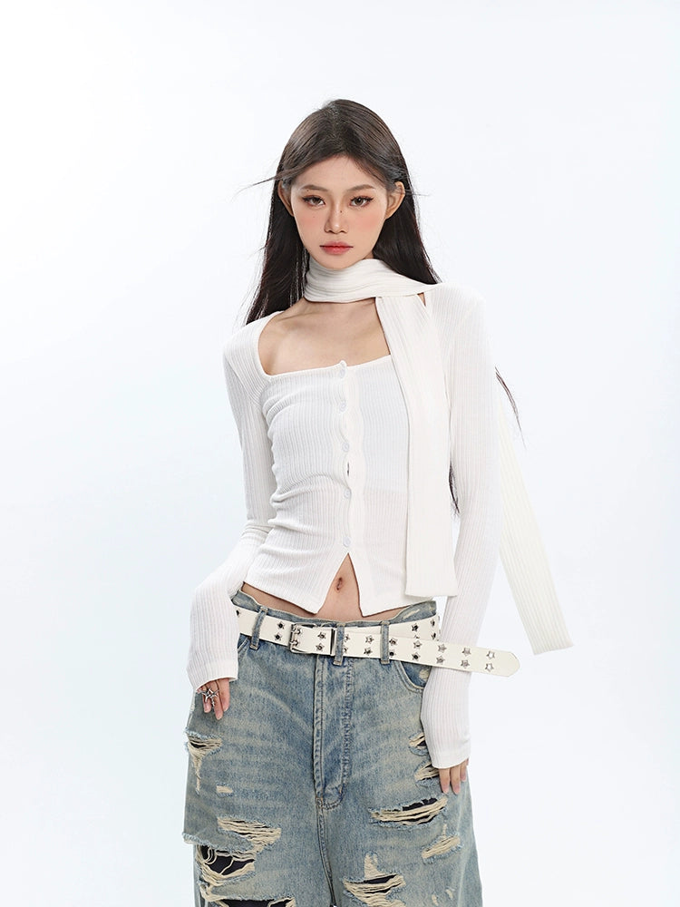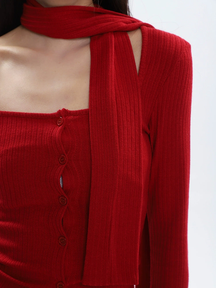 Crafted for comfort and style, this cardigan showcases a finely ribbed texture and solid color design. The slim-fit silhouette paired with a unique scarf detail accentuates an edgy yet sophisticated aesthetic. Its single-breasted placket adds a traditional touch while ensuring ease of wear.
