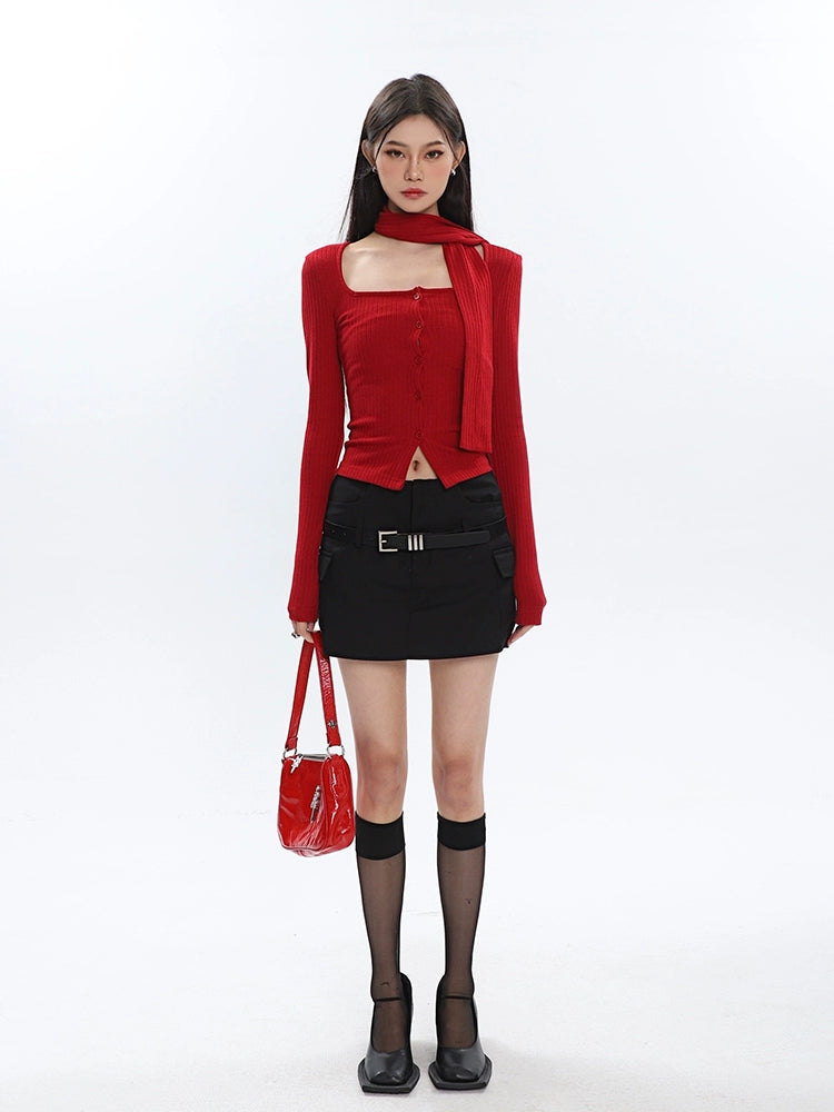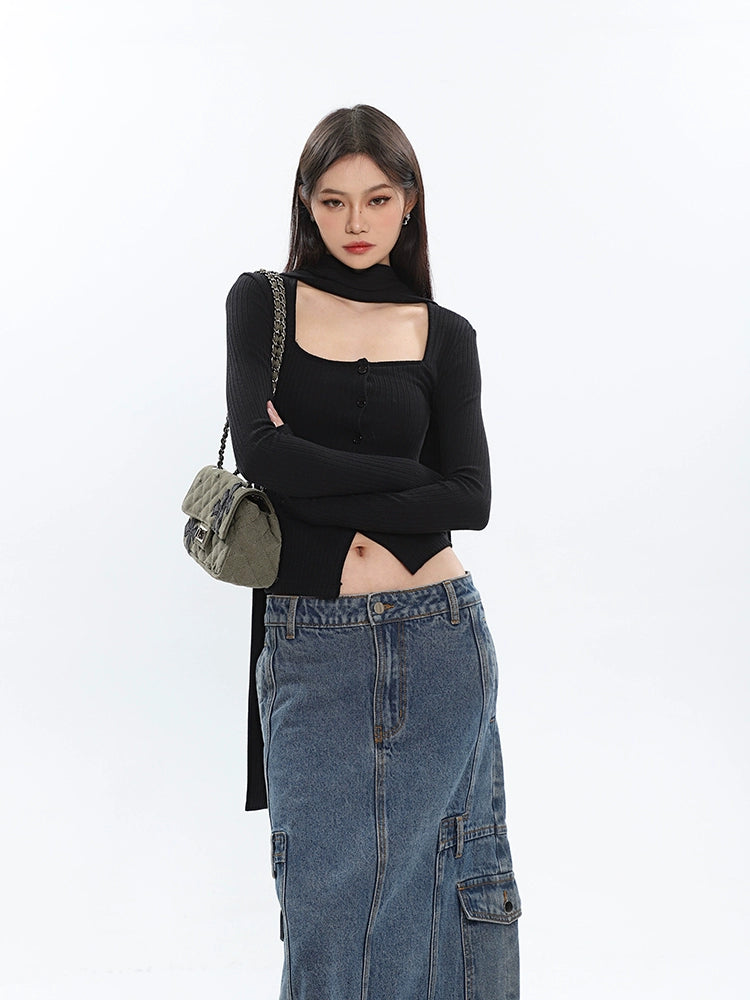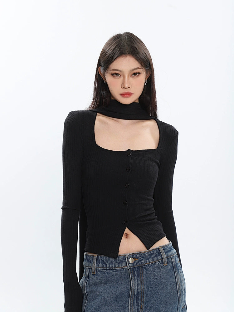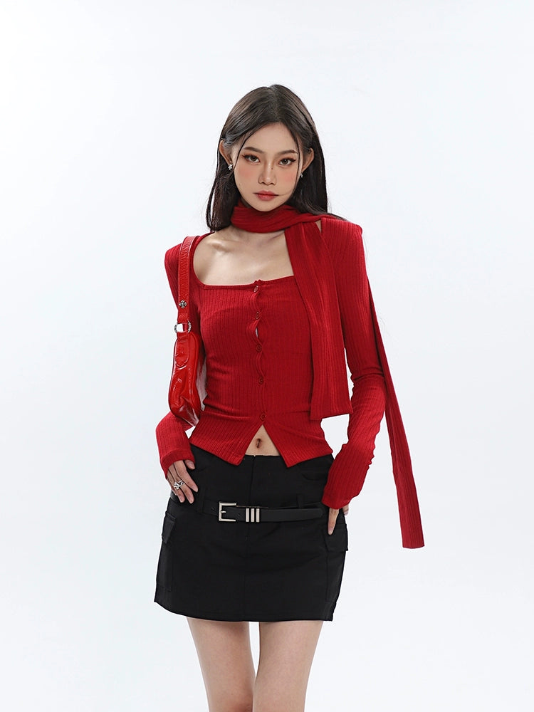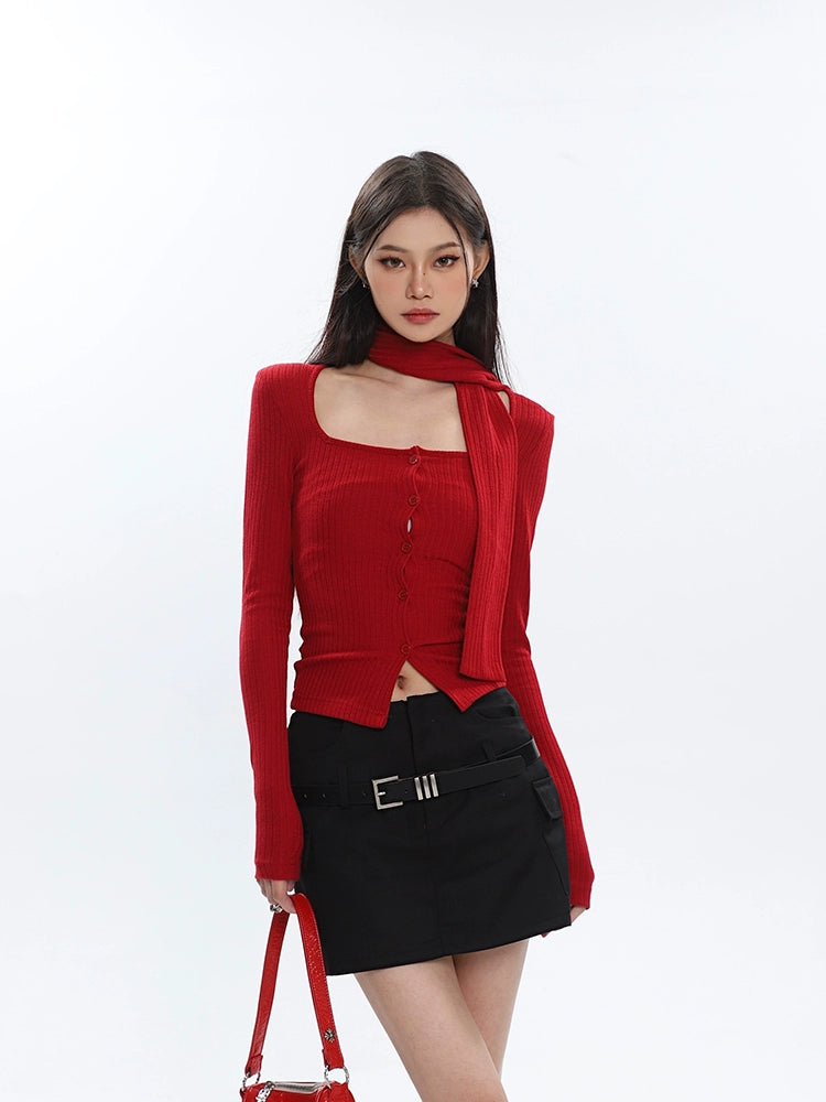 Crafted for comfort and style, this cardigan showcases a finely ribbed texture and solid color design. The slim-fit silhouette paired with a unique scarf detail accentuates an edgy yet sophisticated aesthetic. Its single-breasted placket adds a traditional touch while ensuring ease of wear.