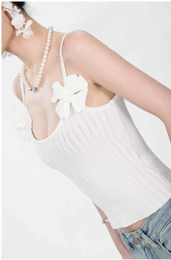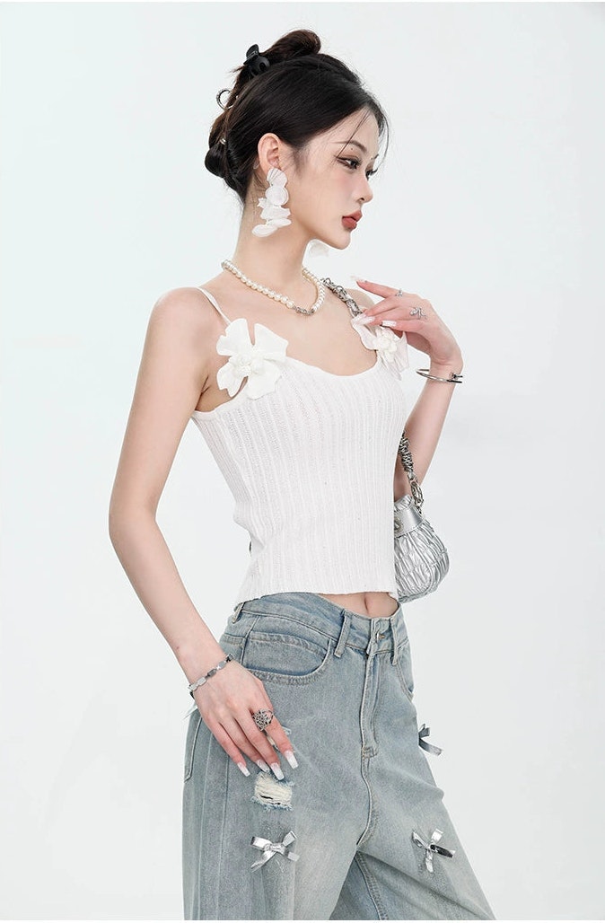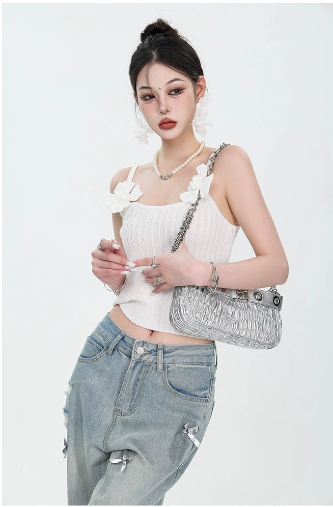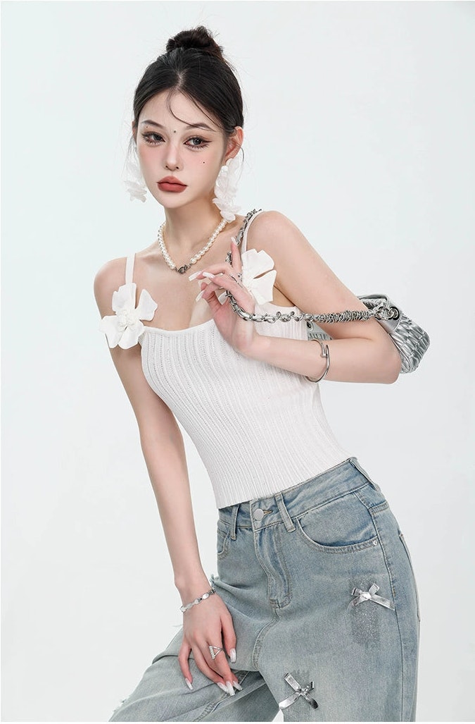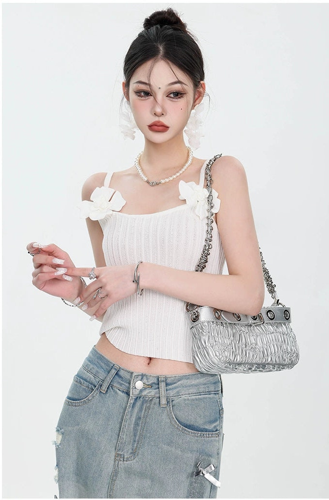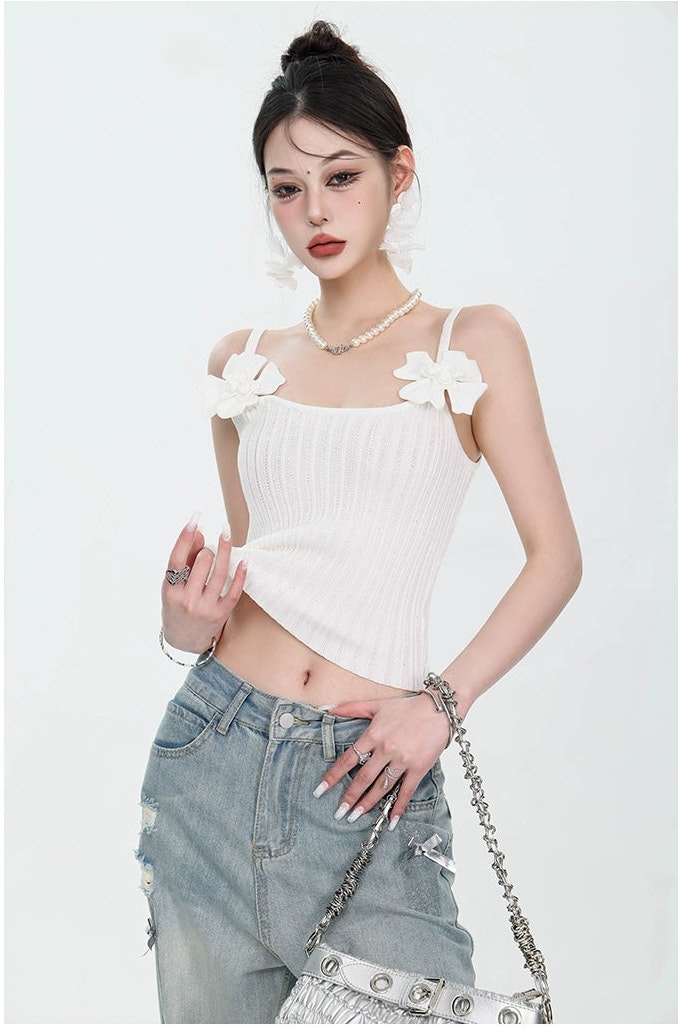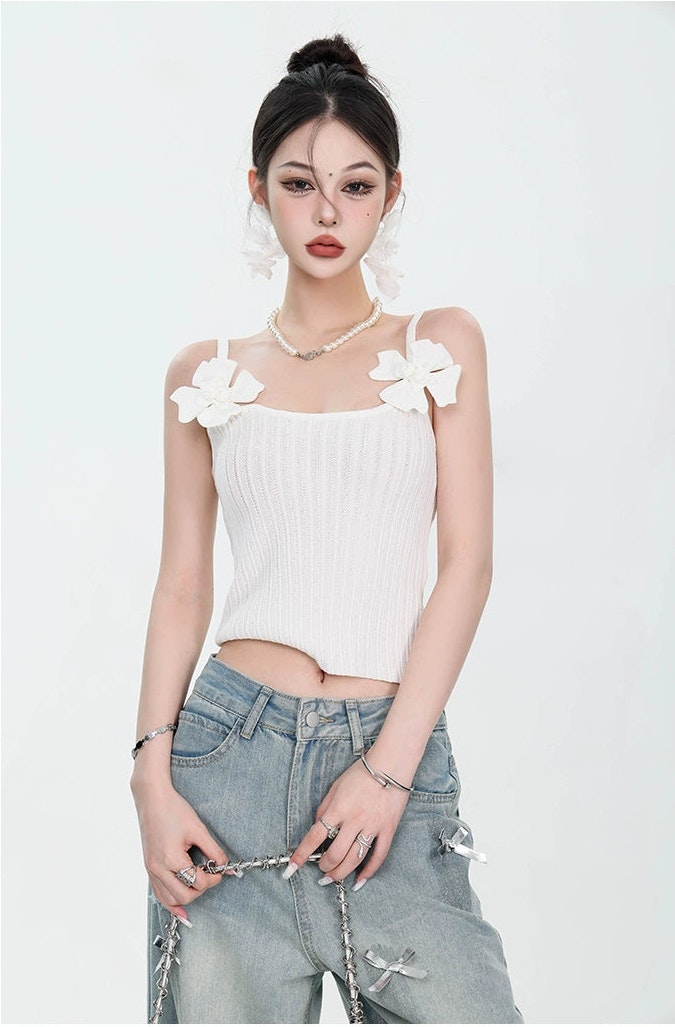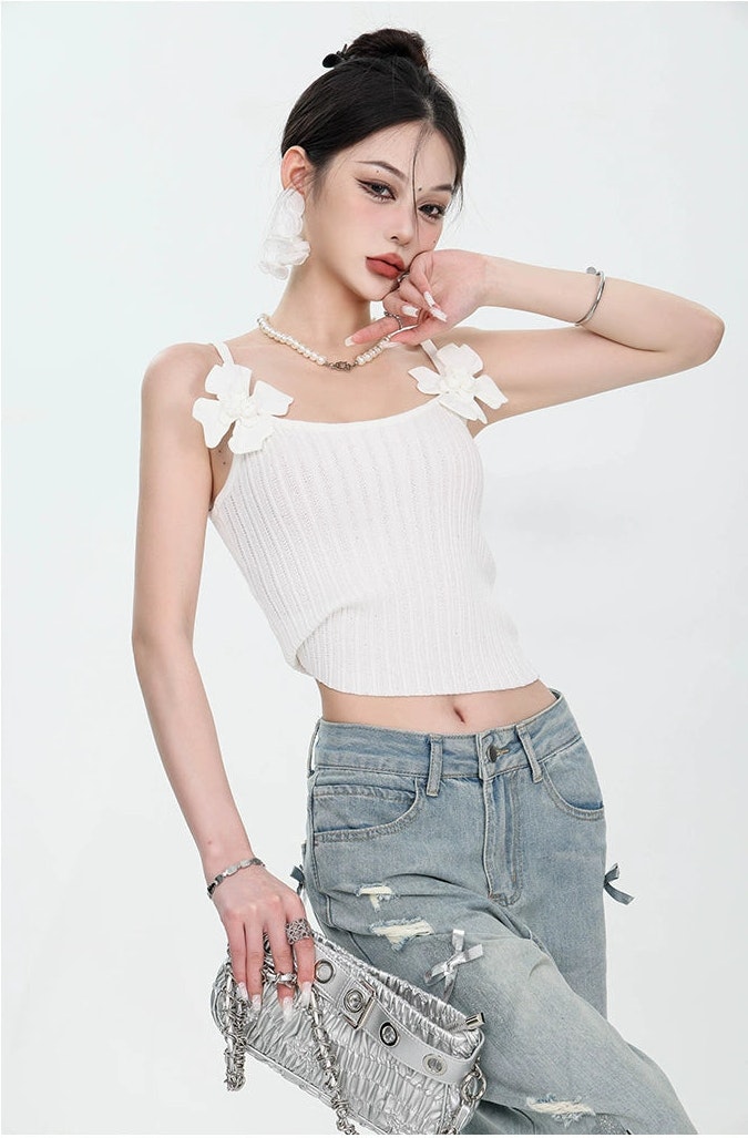 Crafted with attention to detail, this crop top features a ribbed texture that hugs the body for a flattering, fitted silhouette. The three-dimensional floral accents on the shoulders add a unique edge to an otherwise classic piece, effortlessly combining elegance with a hint of boldness.