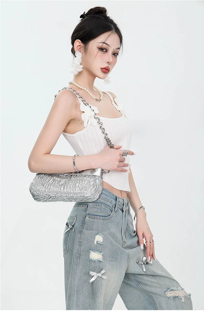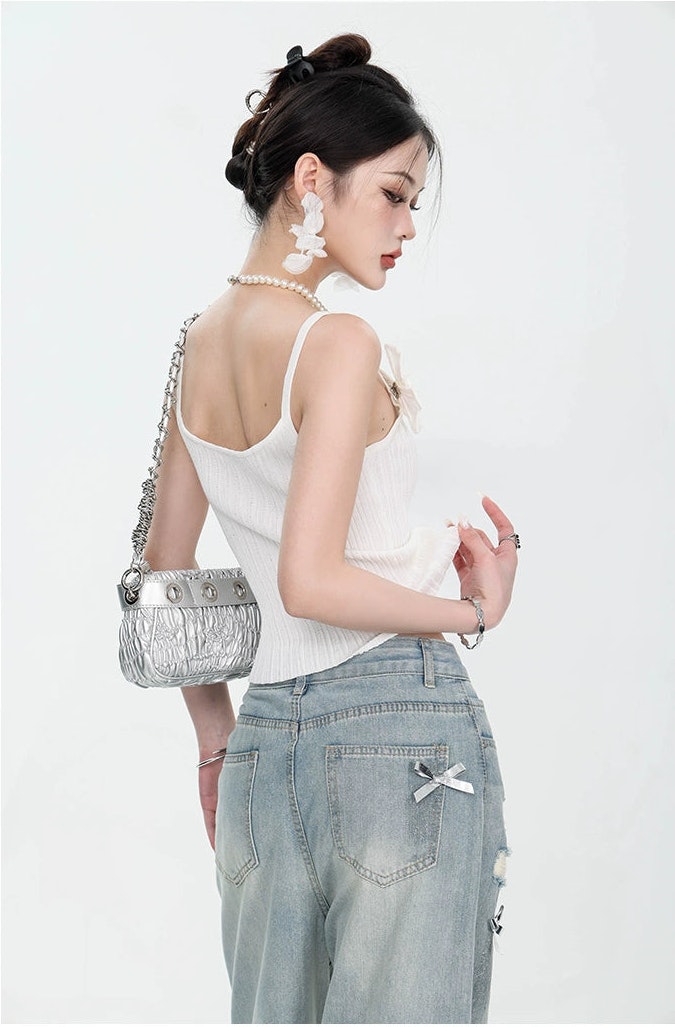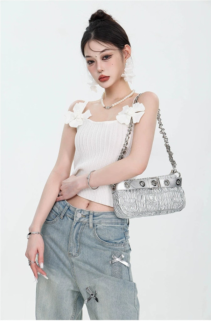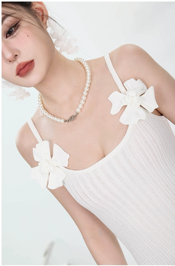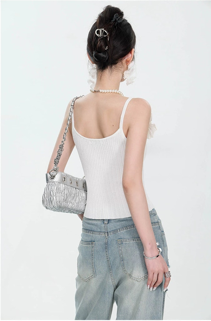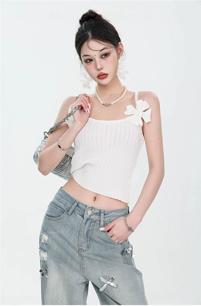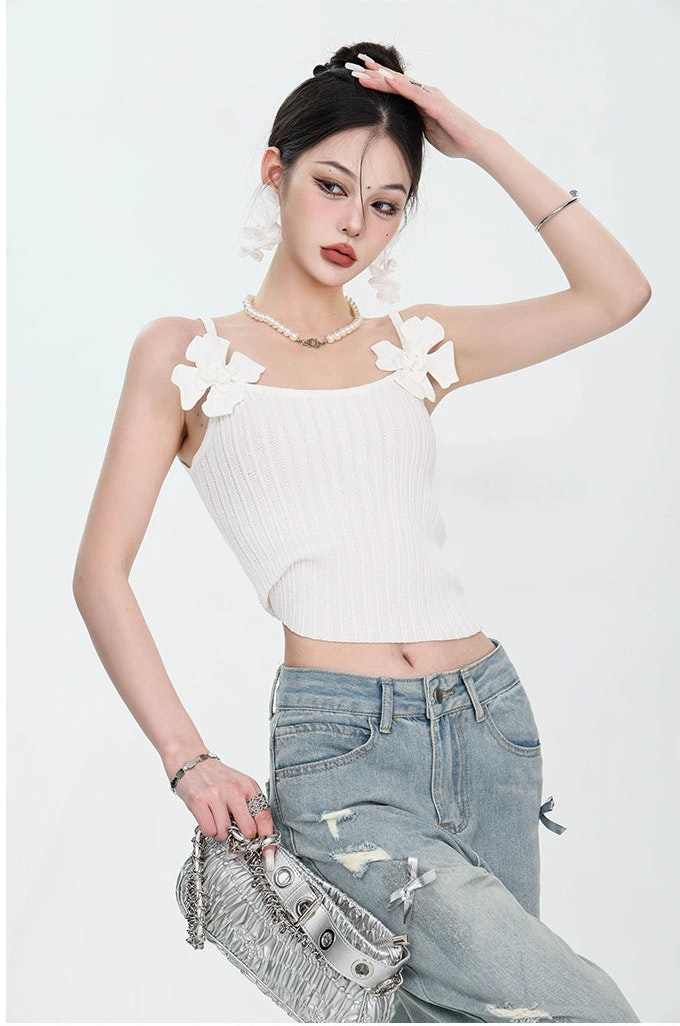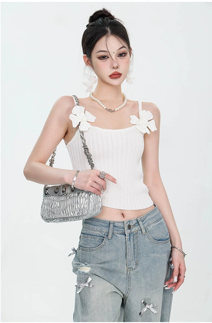 Crafted with attention to detail, this crop top features a ribbed texture that hugs the body for a flattering, fitted silhouette. The three-dimensional floral accents on the shoulders add a unique edge to an otherwise classic piece, effortlessly combining elegance with a hint of boldness.