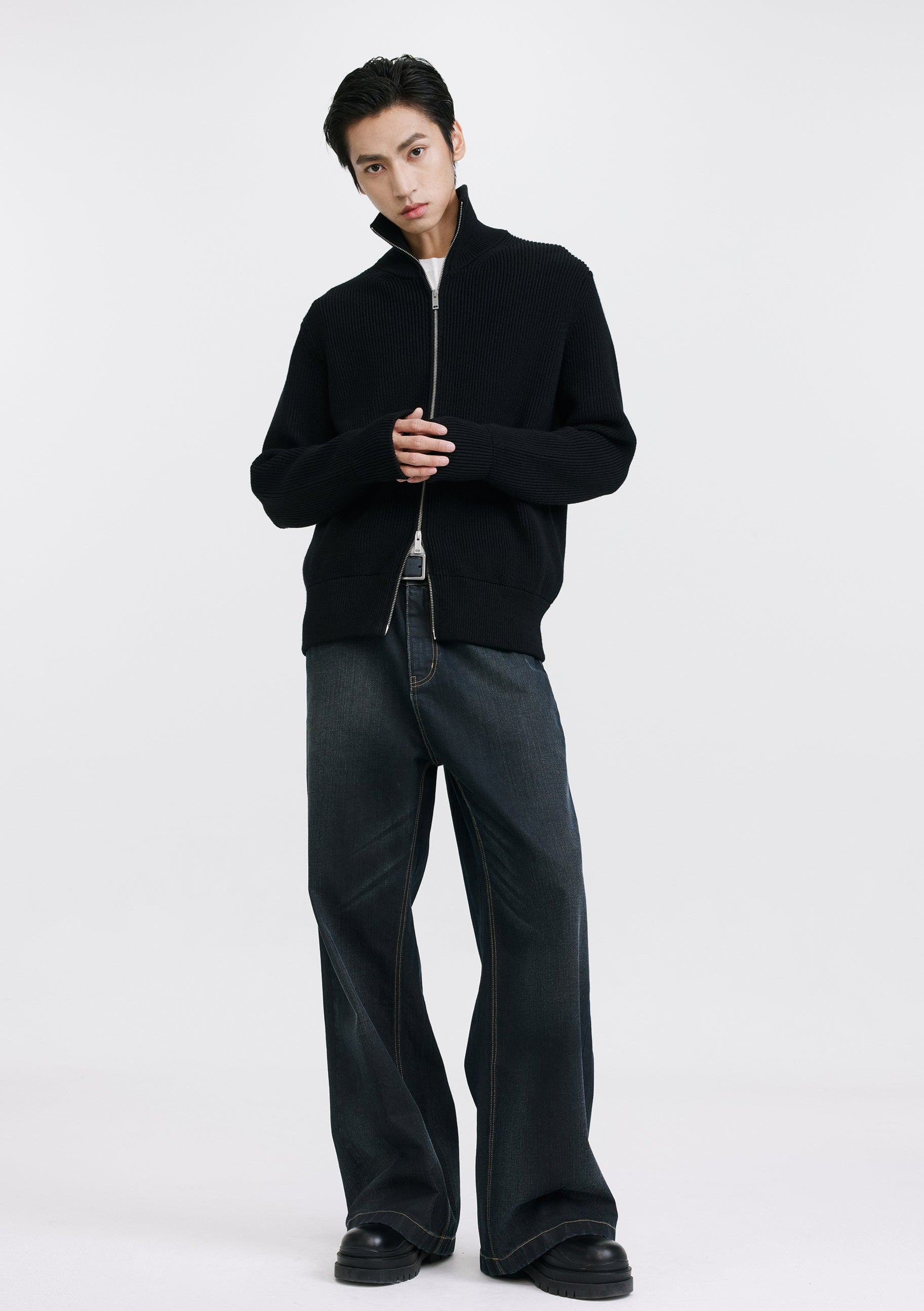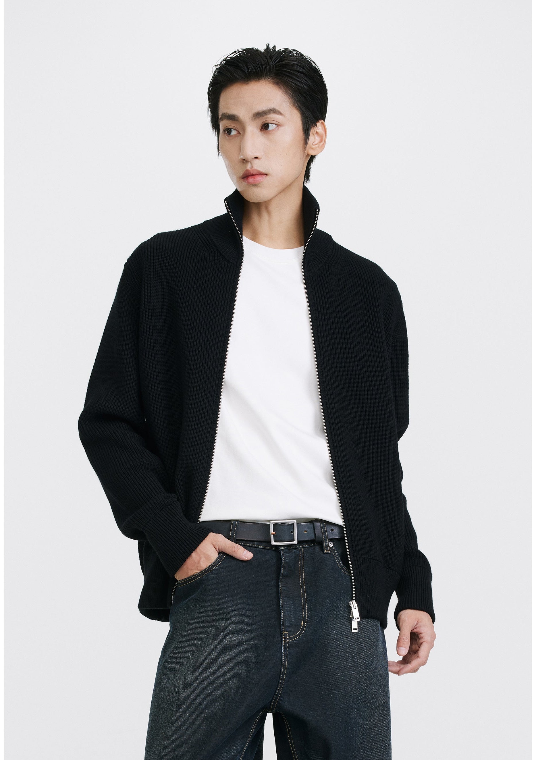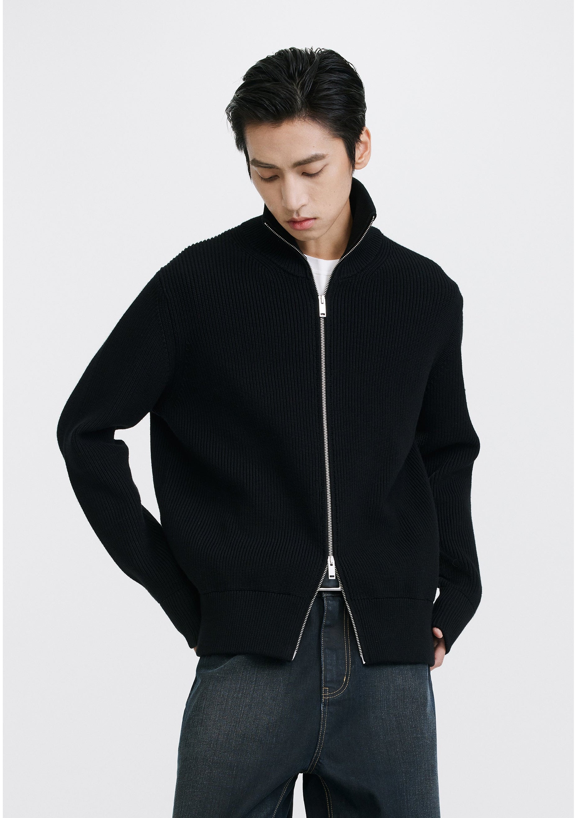 Ribbed Knit Double Zip Jacket with Stand Collar
