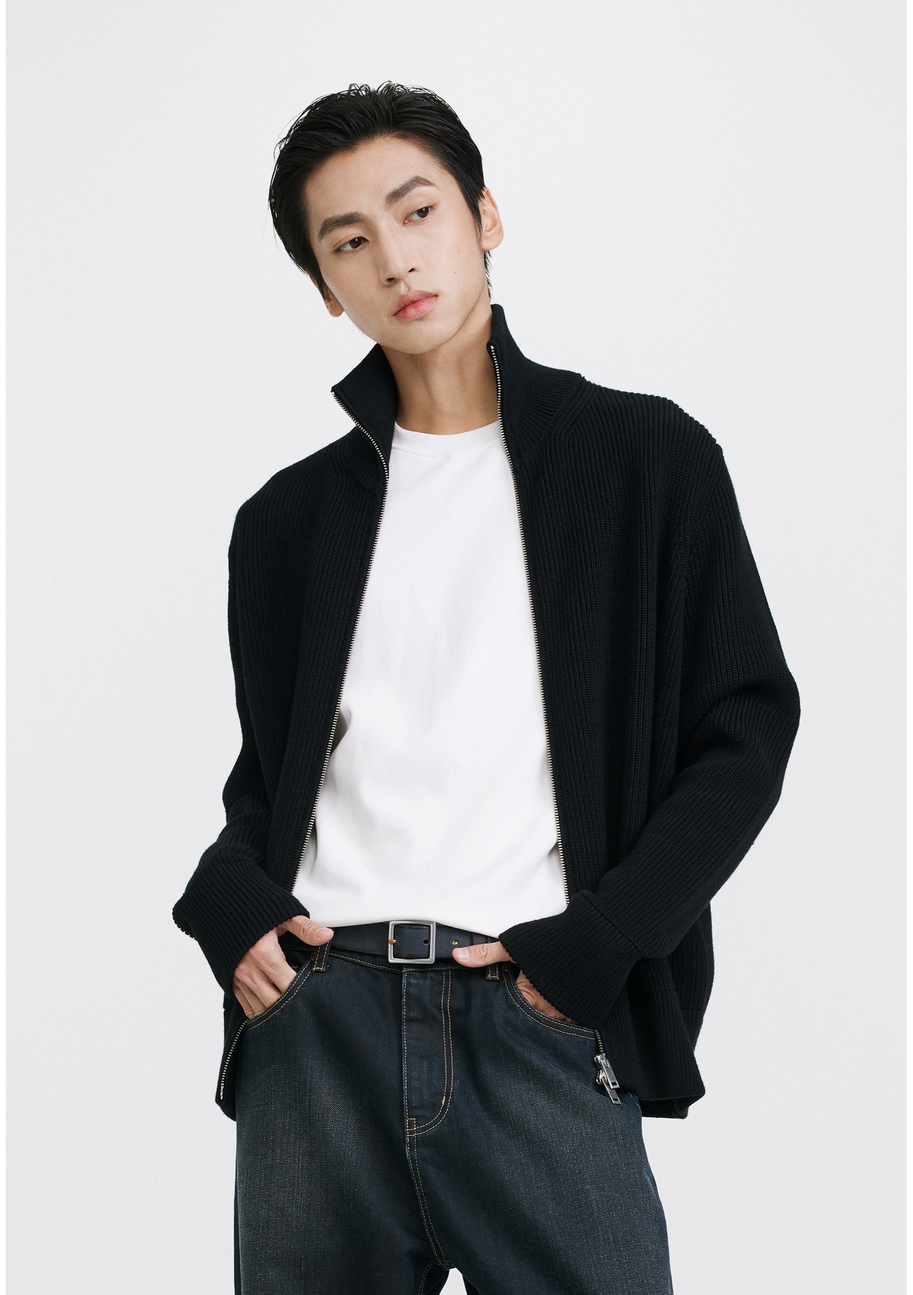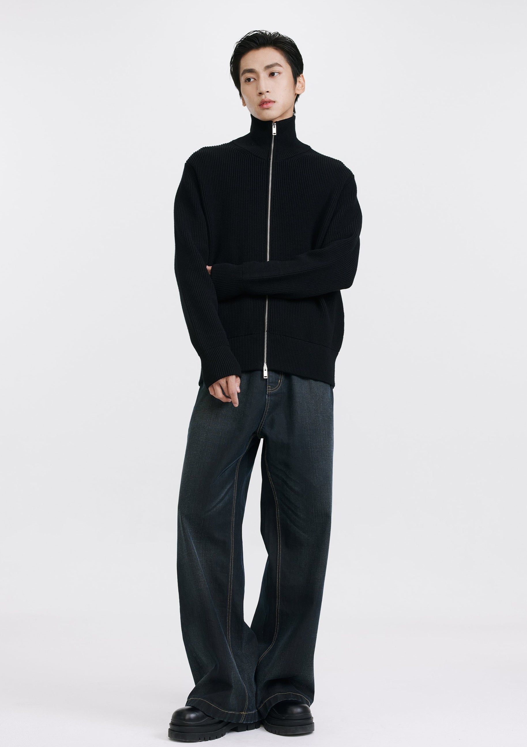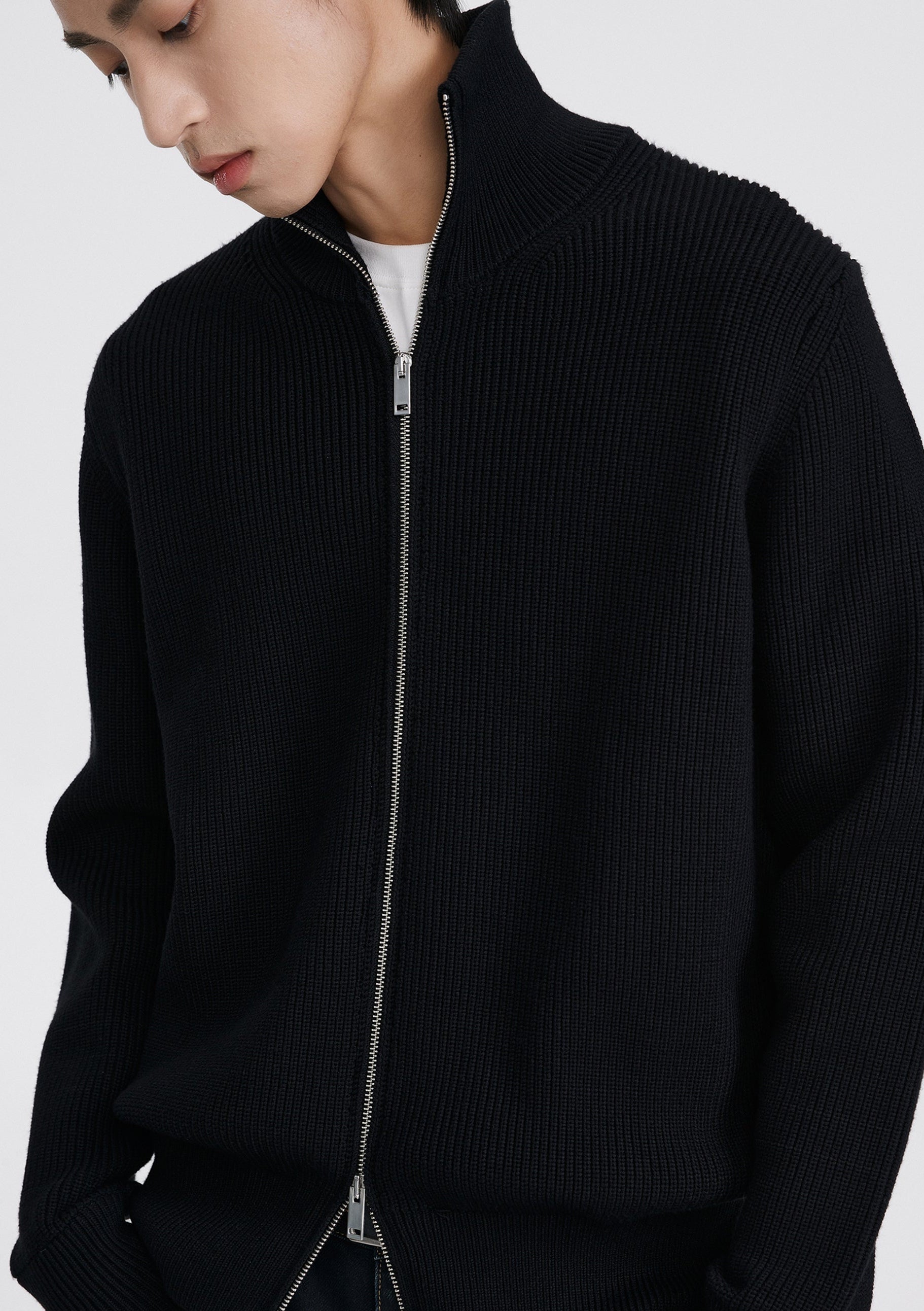 Crafted from a soft viscose-polyester blend, this piece features structured seven-gauge detailing that adds depth without bulk. The ribbed construction maintains its shape wear after wear, while the custom two-way zip enhances movement and layering potential. It leans into slim, minimal design that slips between laid-back and elevated with ease.