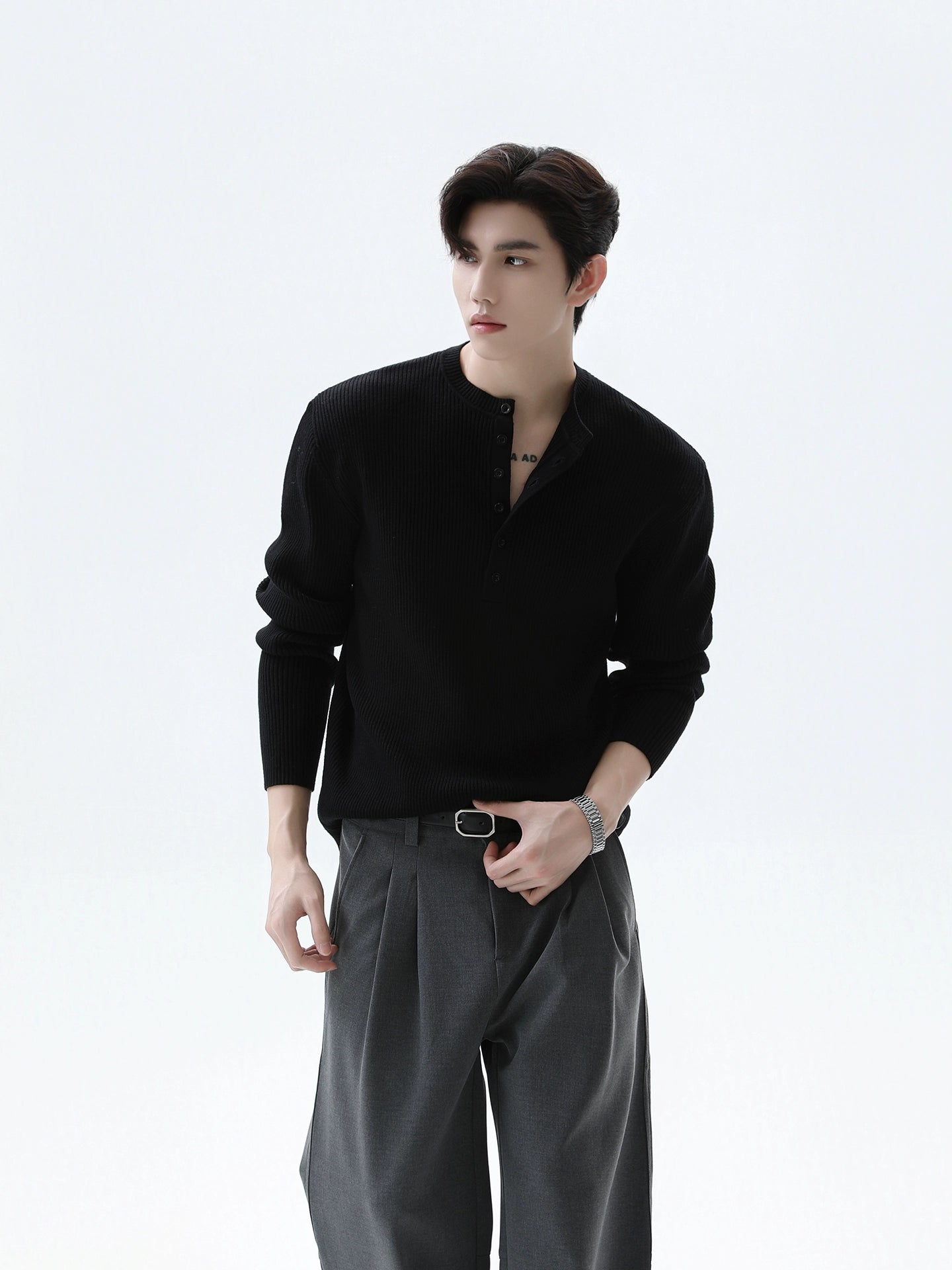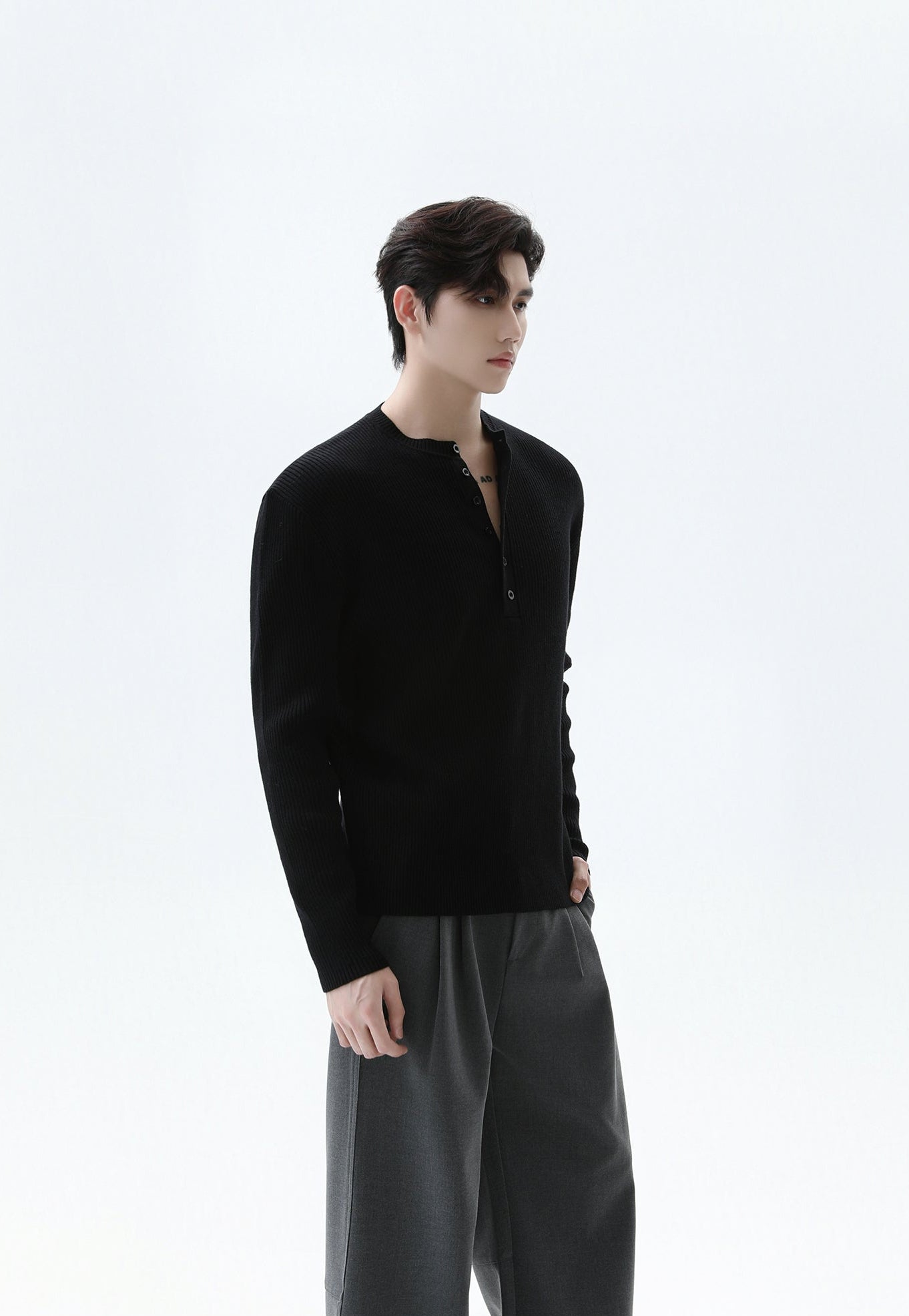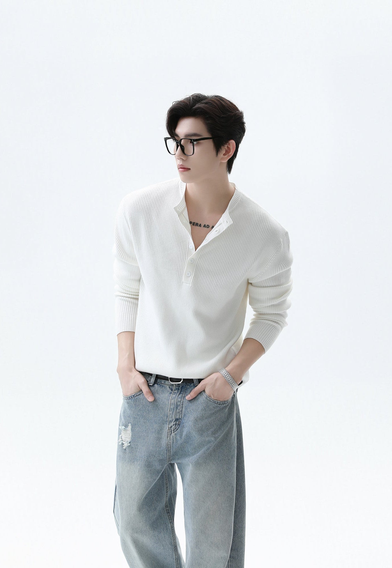 Ribbed Knit Henley Sweatshirt with Button Neckline