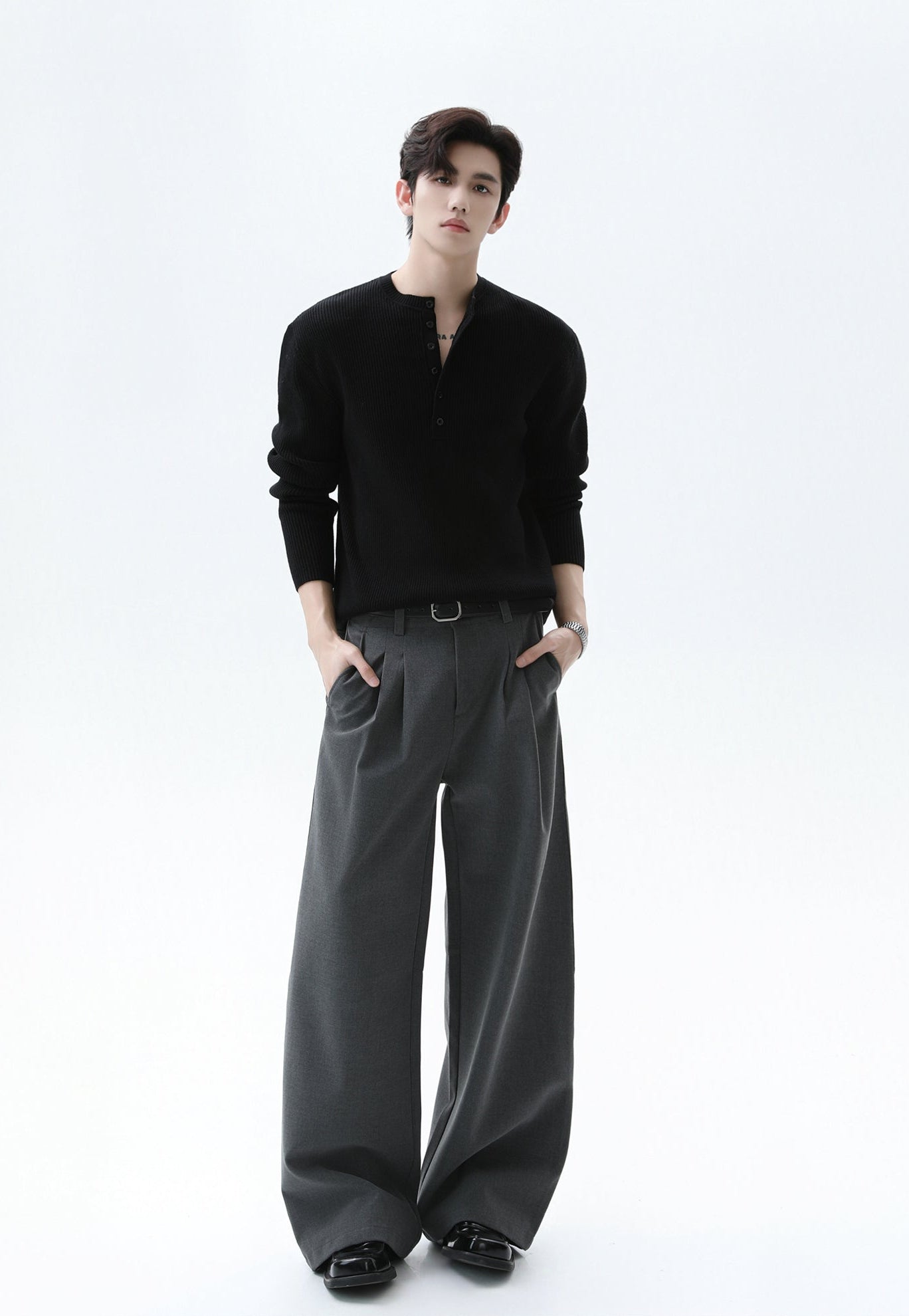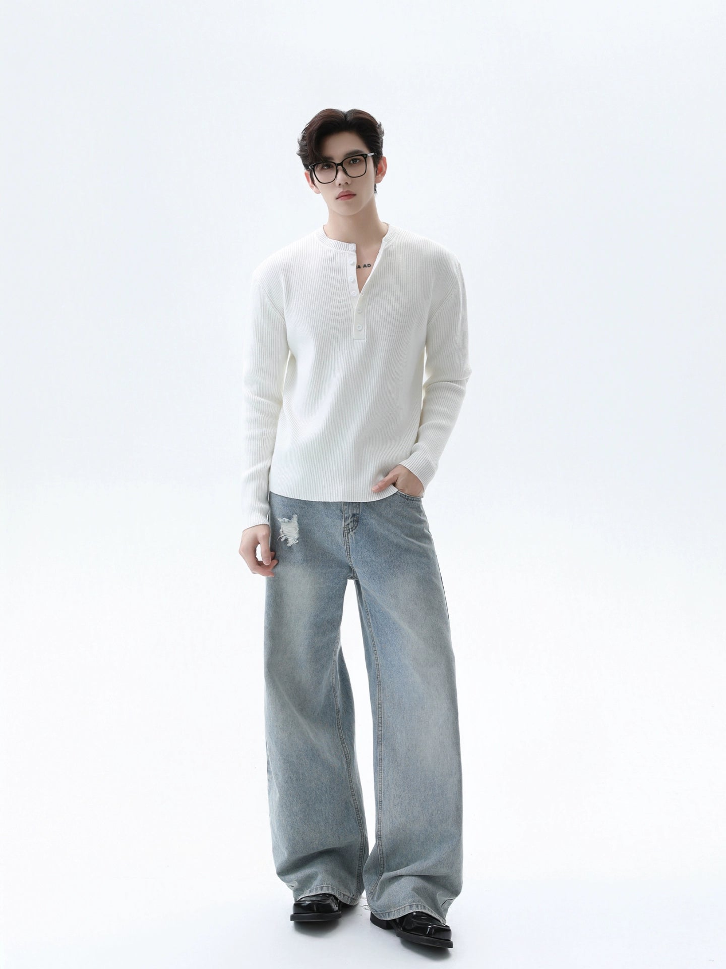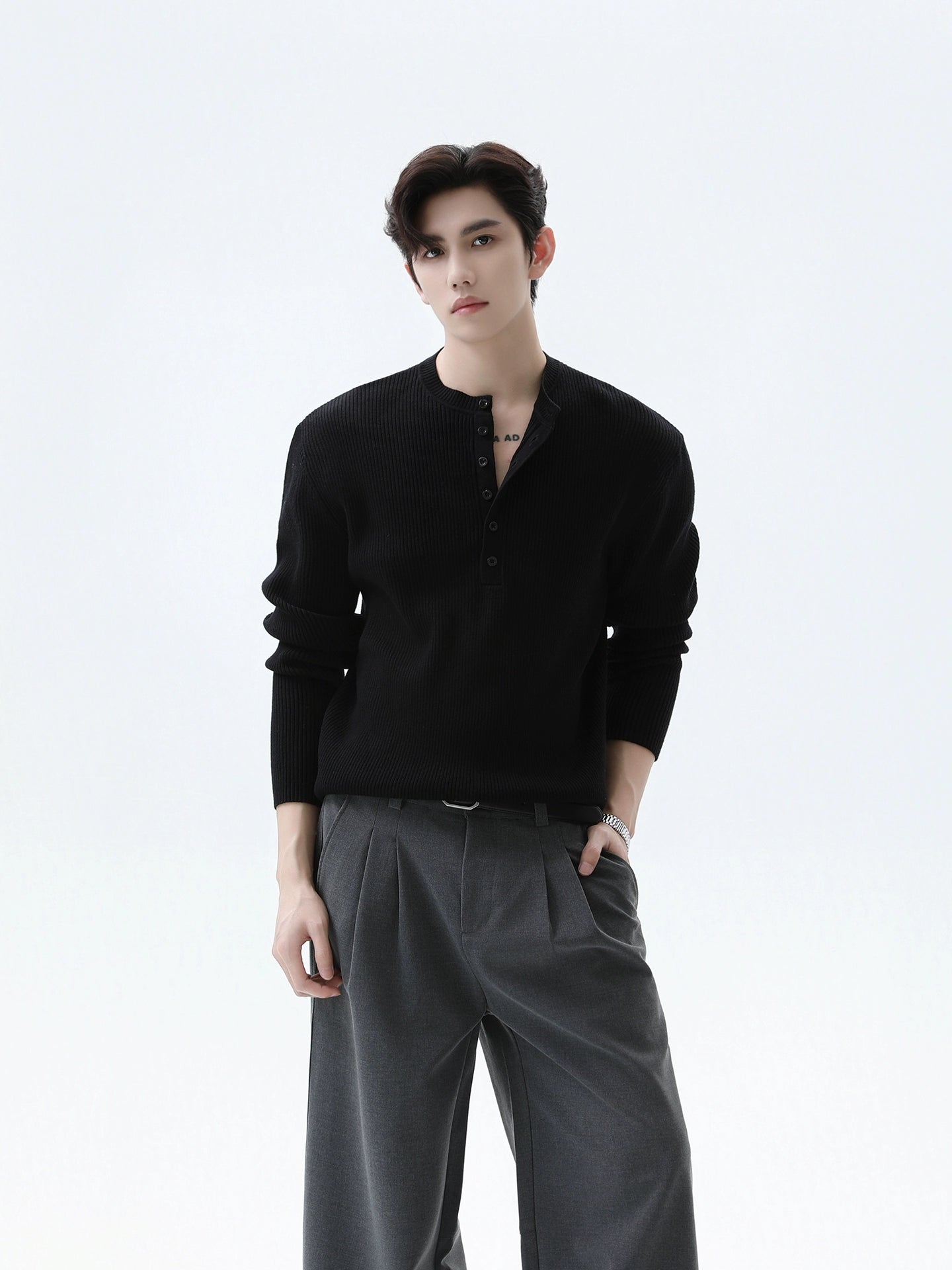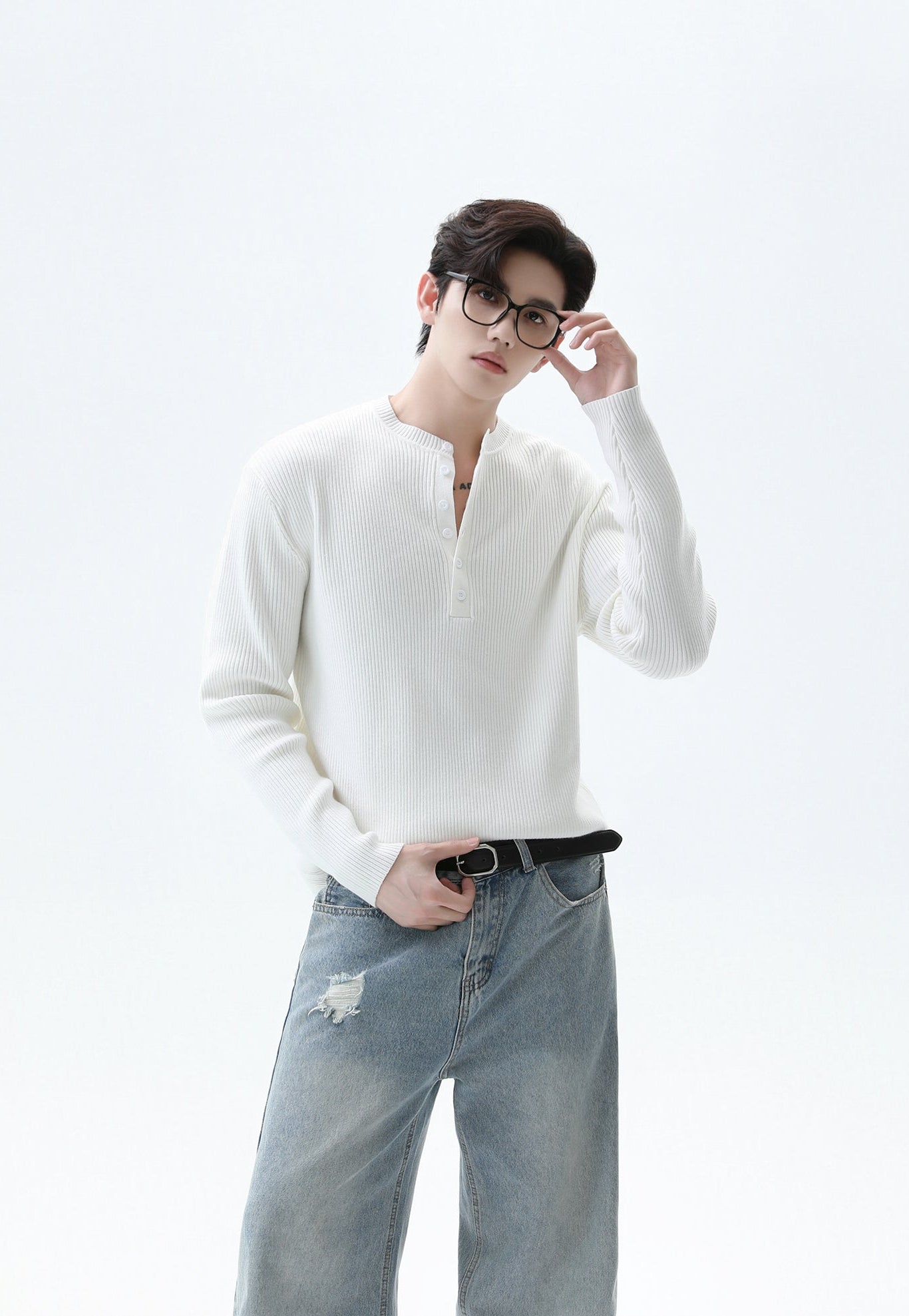 Ribbed Knit Henley Sweatshirt with Button Neckline