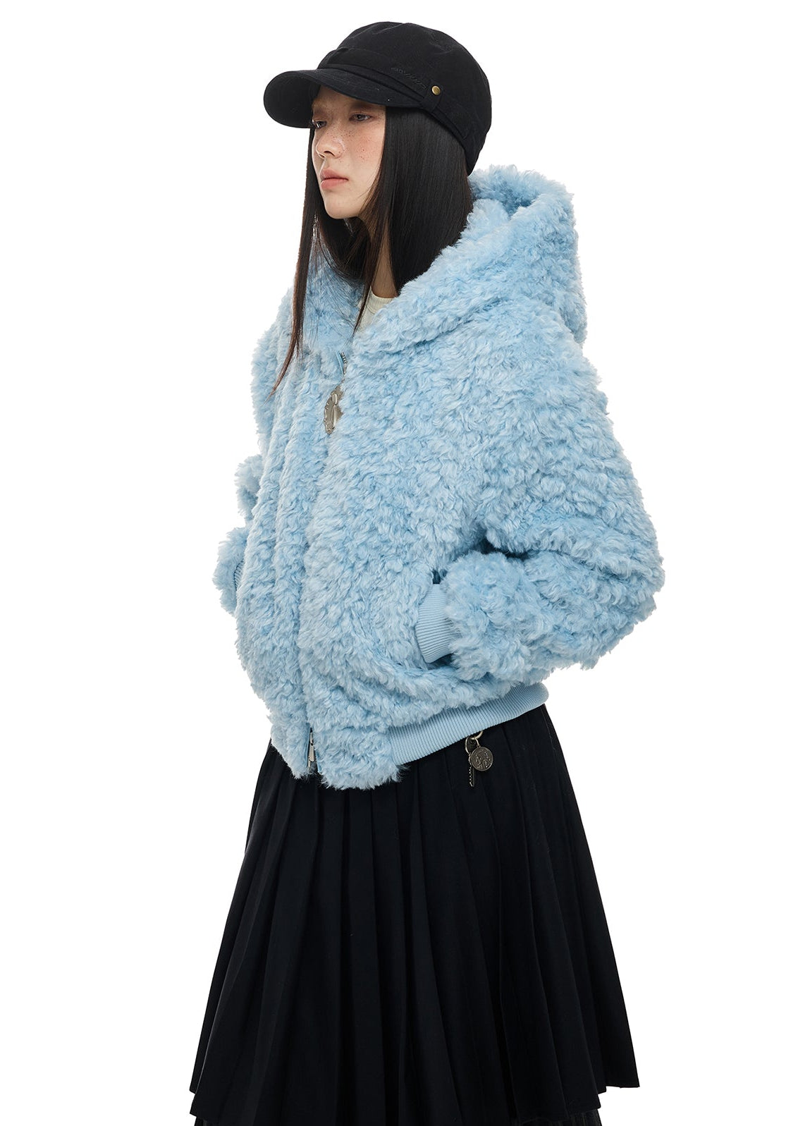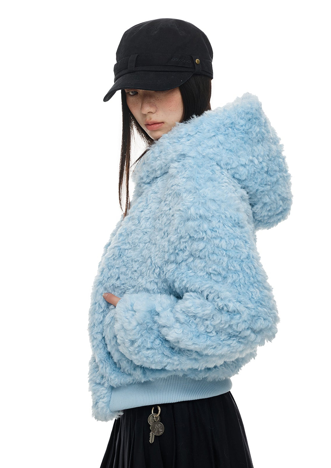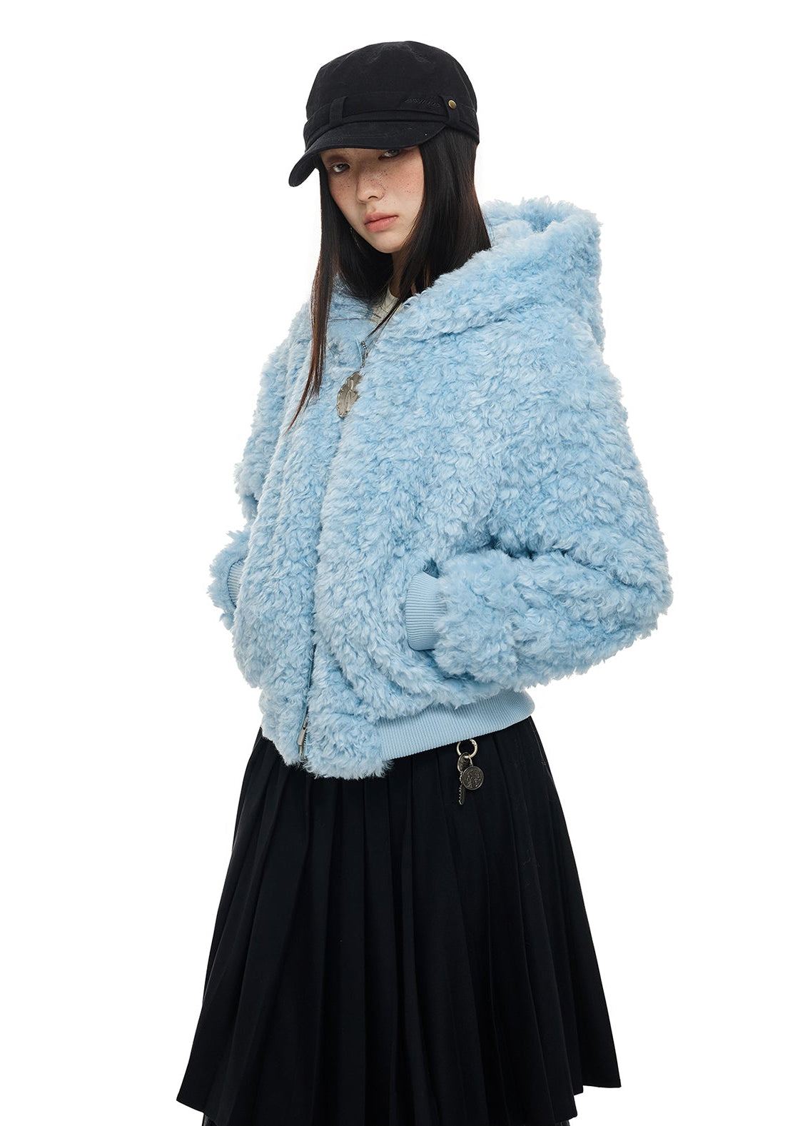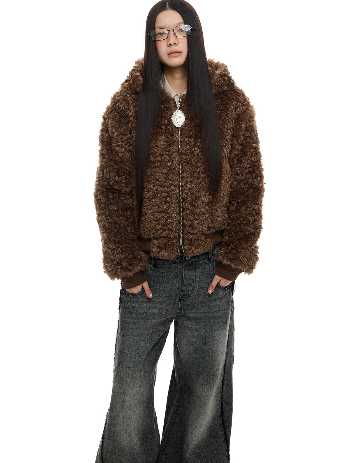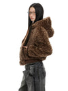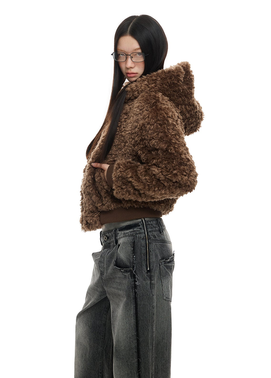 Ribbed Trim Hoodie Faux Shearling Zip-Up Jacket