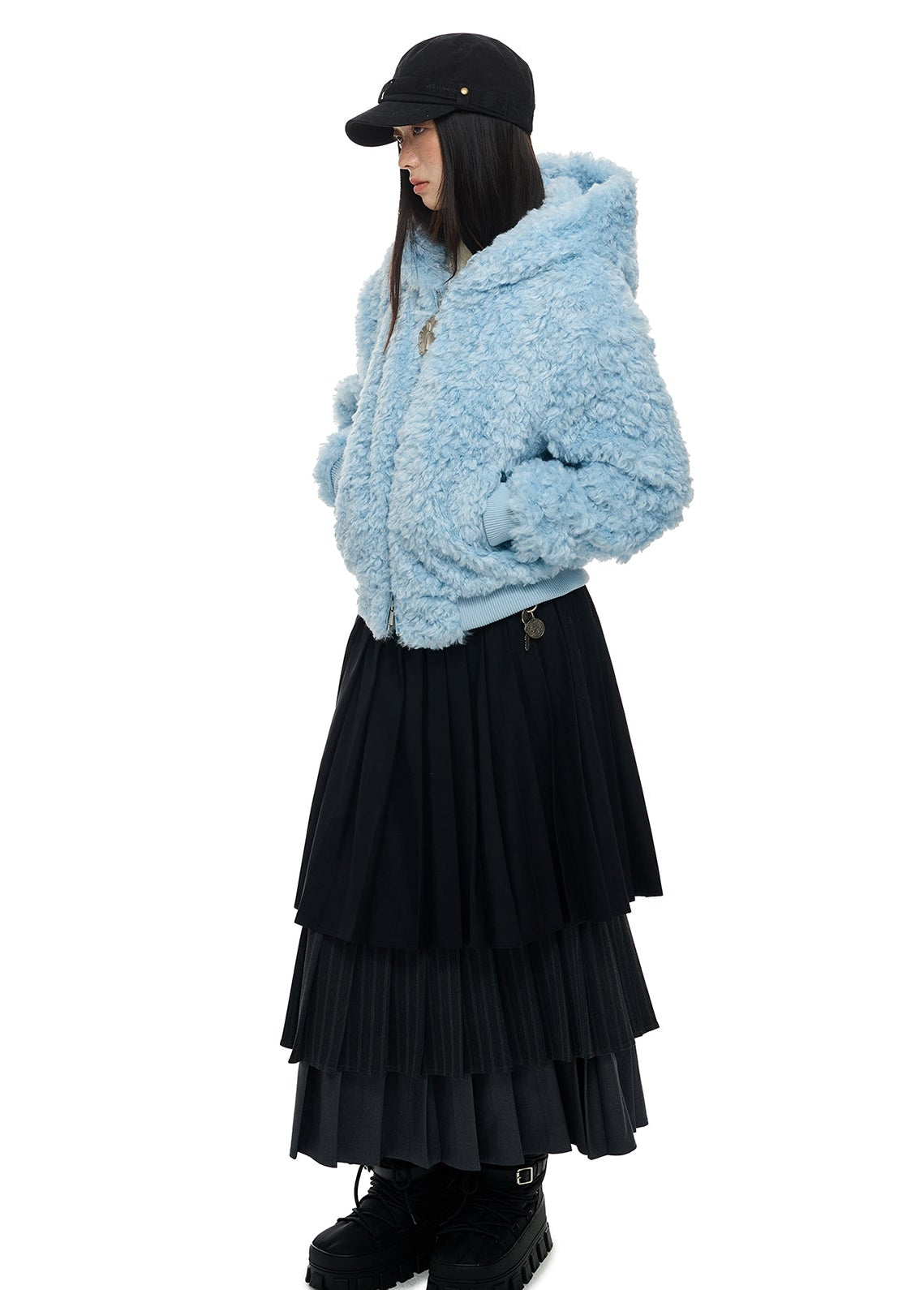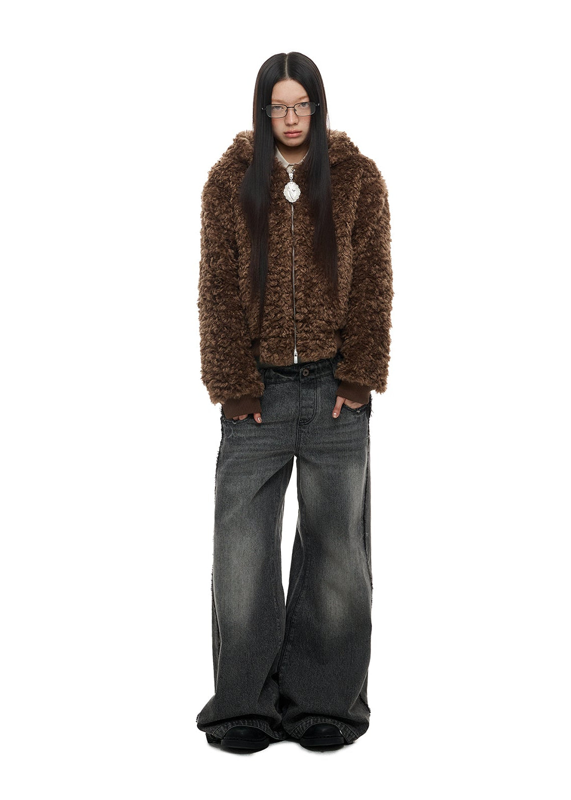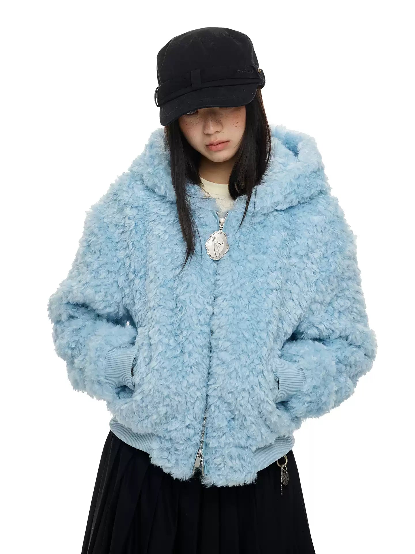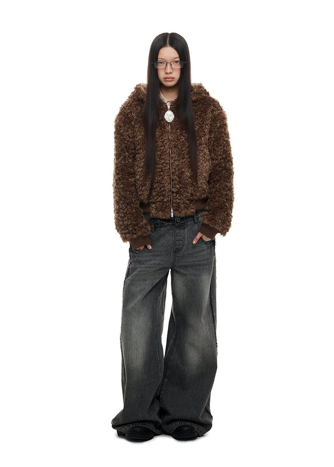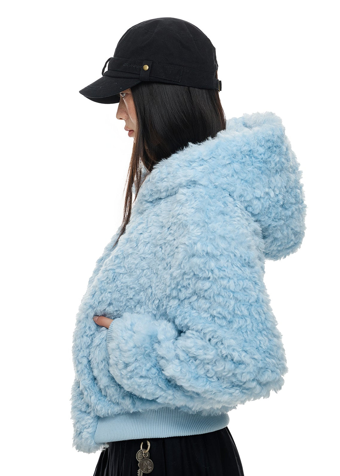 Ribbed Trim Hoodie Faux Shearling Zip-Up Jacket