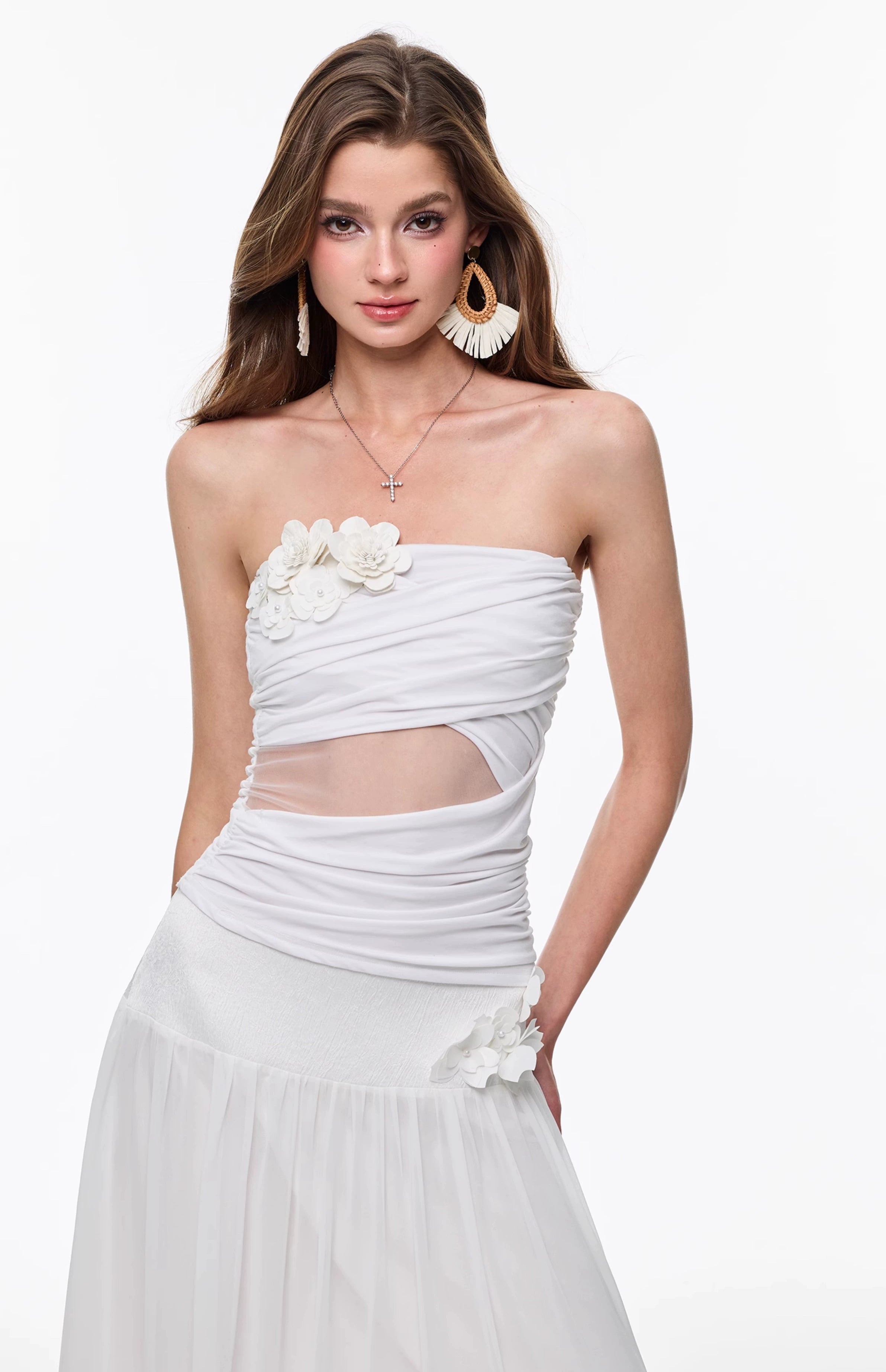 Read full Return PolicyThis two-piece set stands out with hand-sewn 3D flower appliqué over a ruched tube top and a high-waist maxi skirt, blending softness with edge in the right amount.