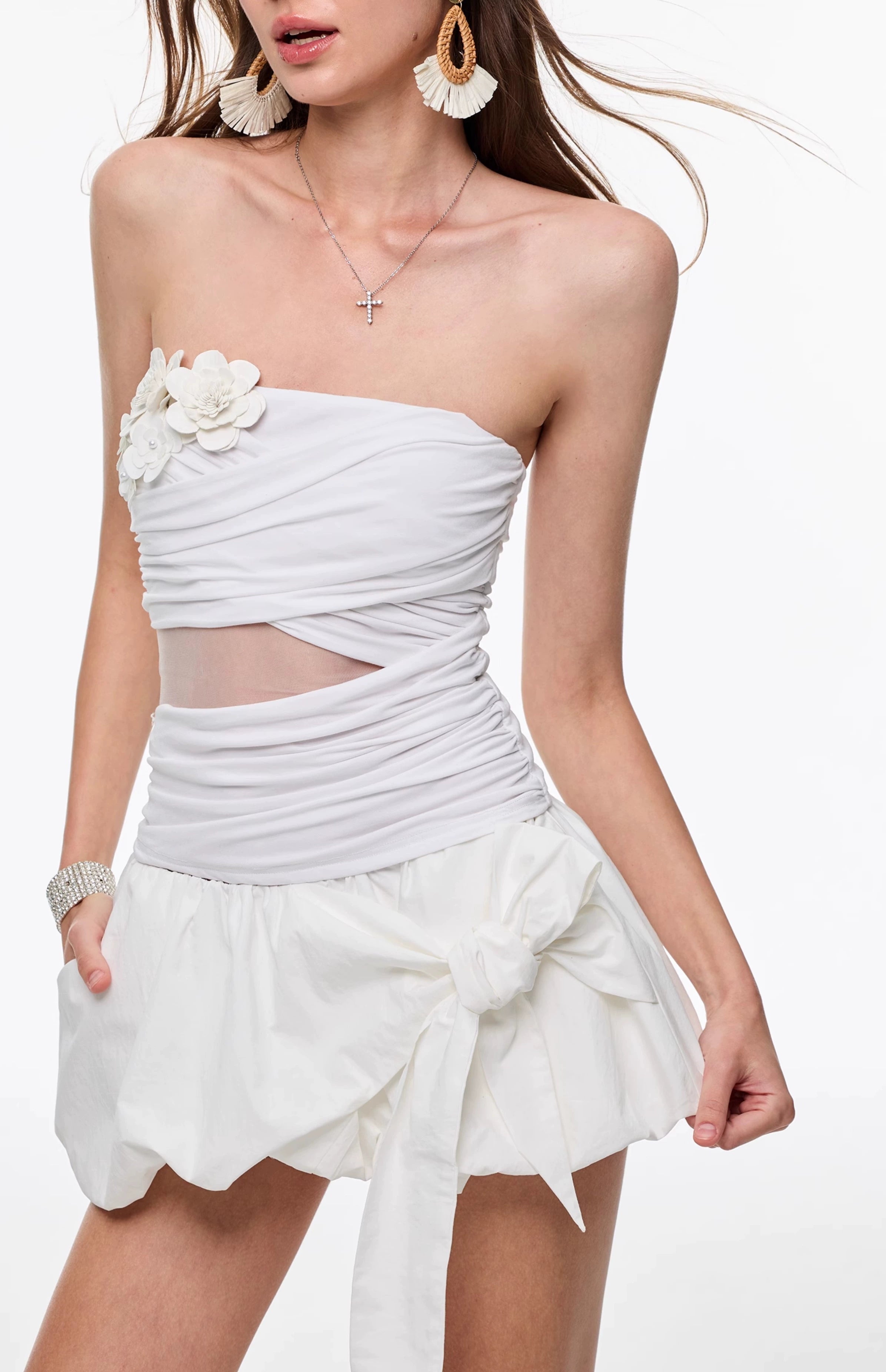 Designed with intentional cut-outs and subtle layering, it adds shape and movement that doesn't try too hard but still makes a statement. The set features a crossover ruched structure on the top that wraps naturally around the body and a triangle-shaped mesh detail at the waist for a subtle contrast in texture. The layered florals along the chest bring dimension without overpowering the look.
