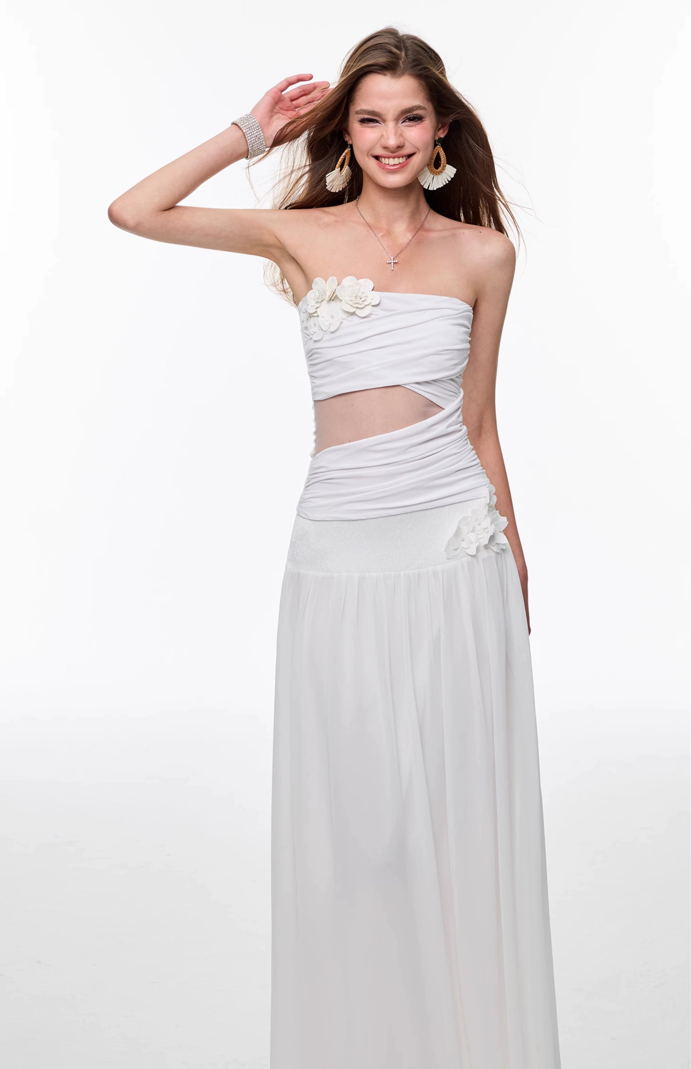 Ruched Tube Top and High Waist Maxi Skirt with Flower Applique Detail Two-Piece Set