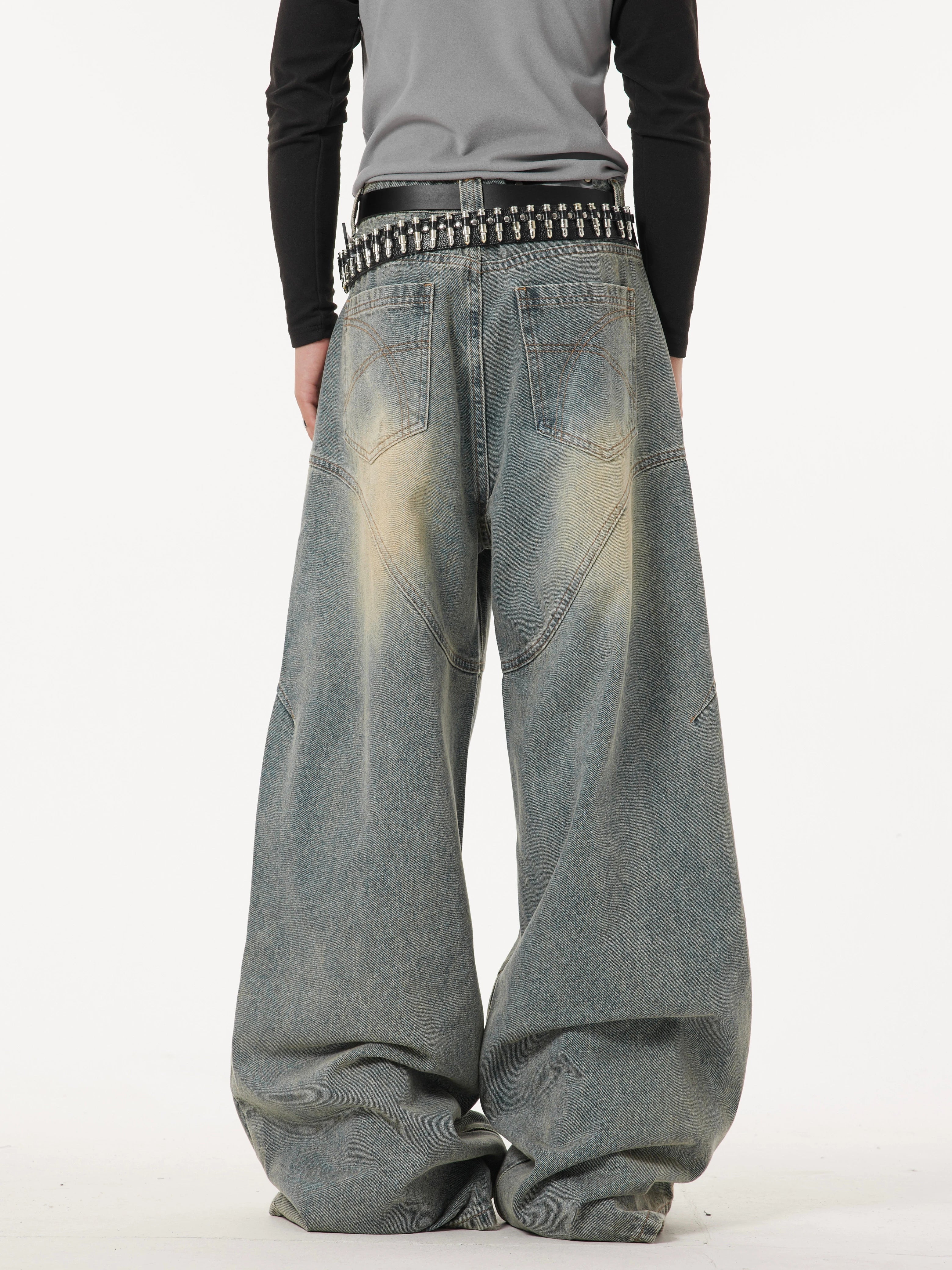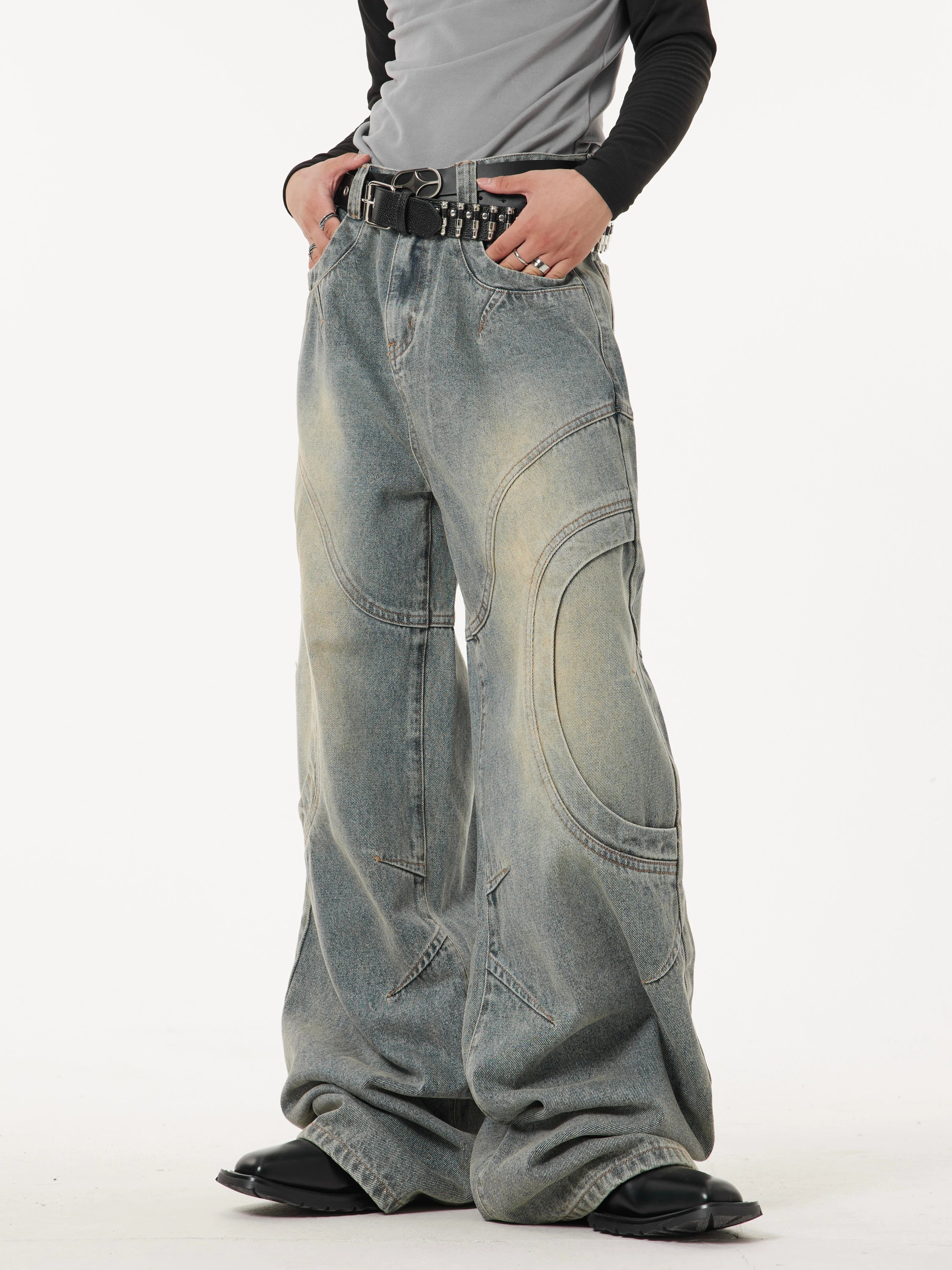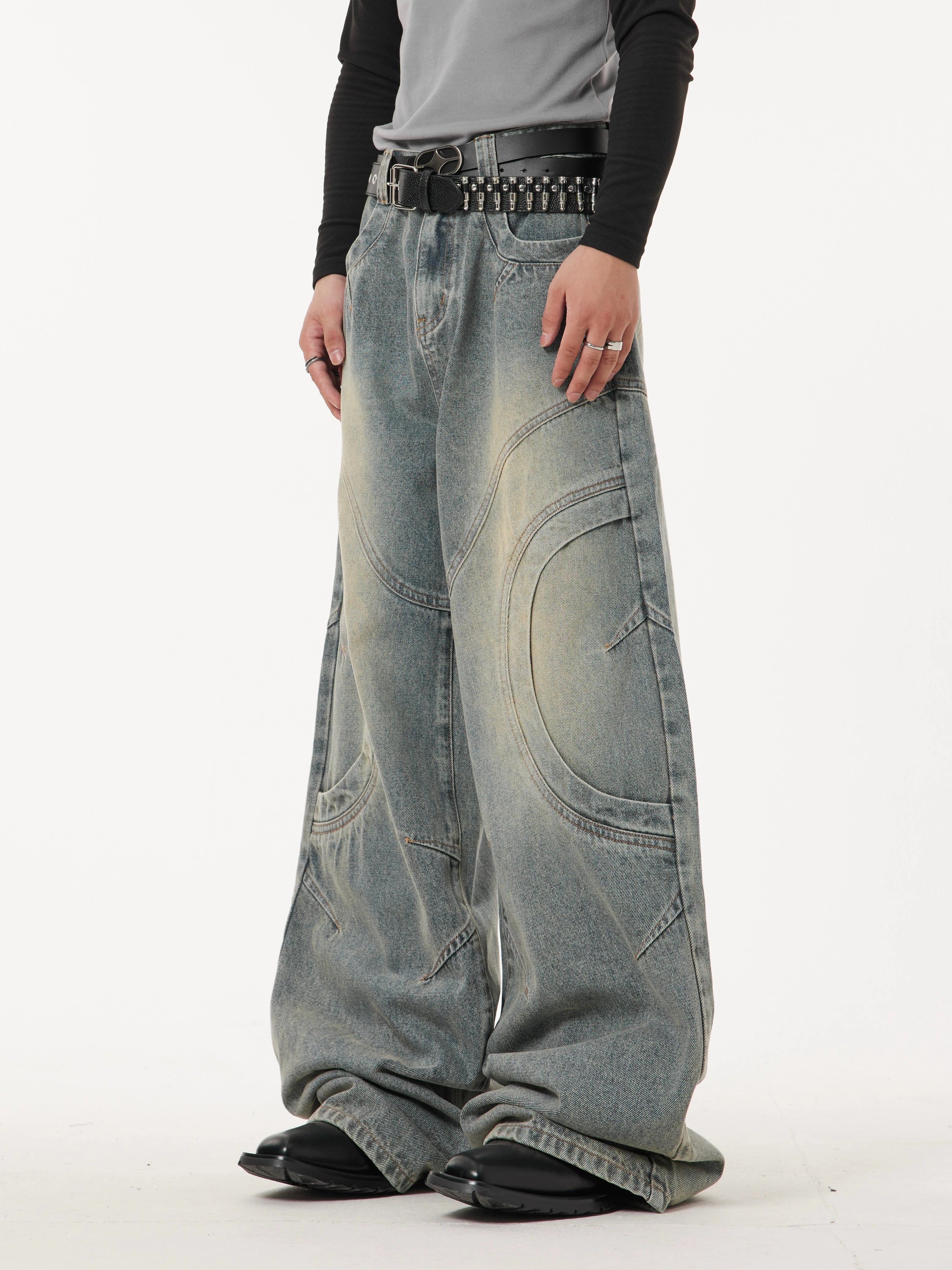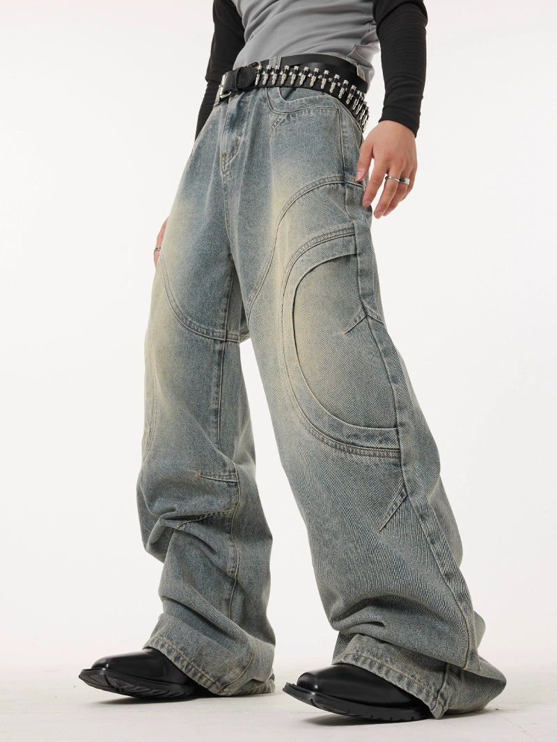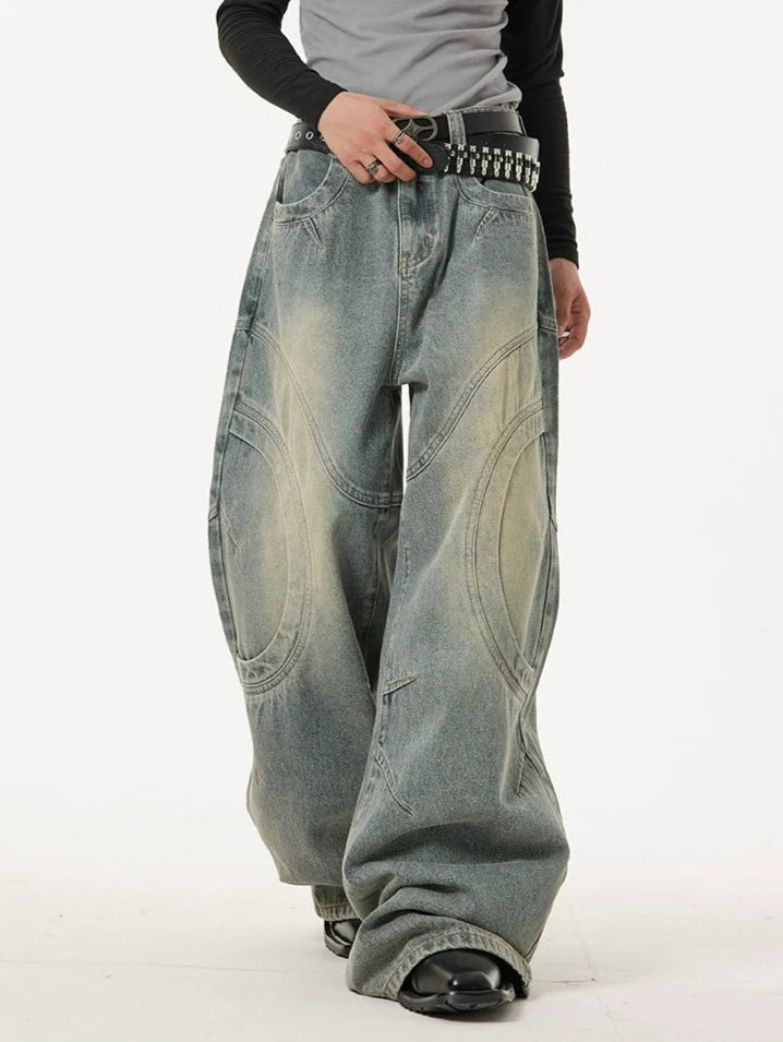 Sandblast Faded Wave-Curve Stitch Wide Leg Jeans