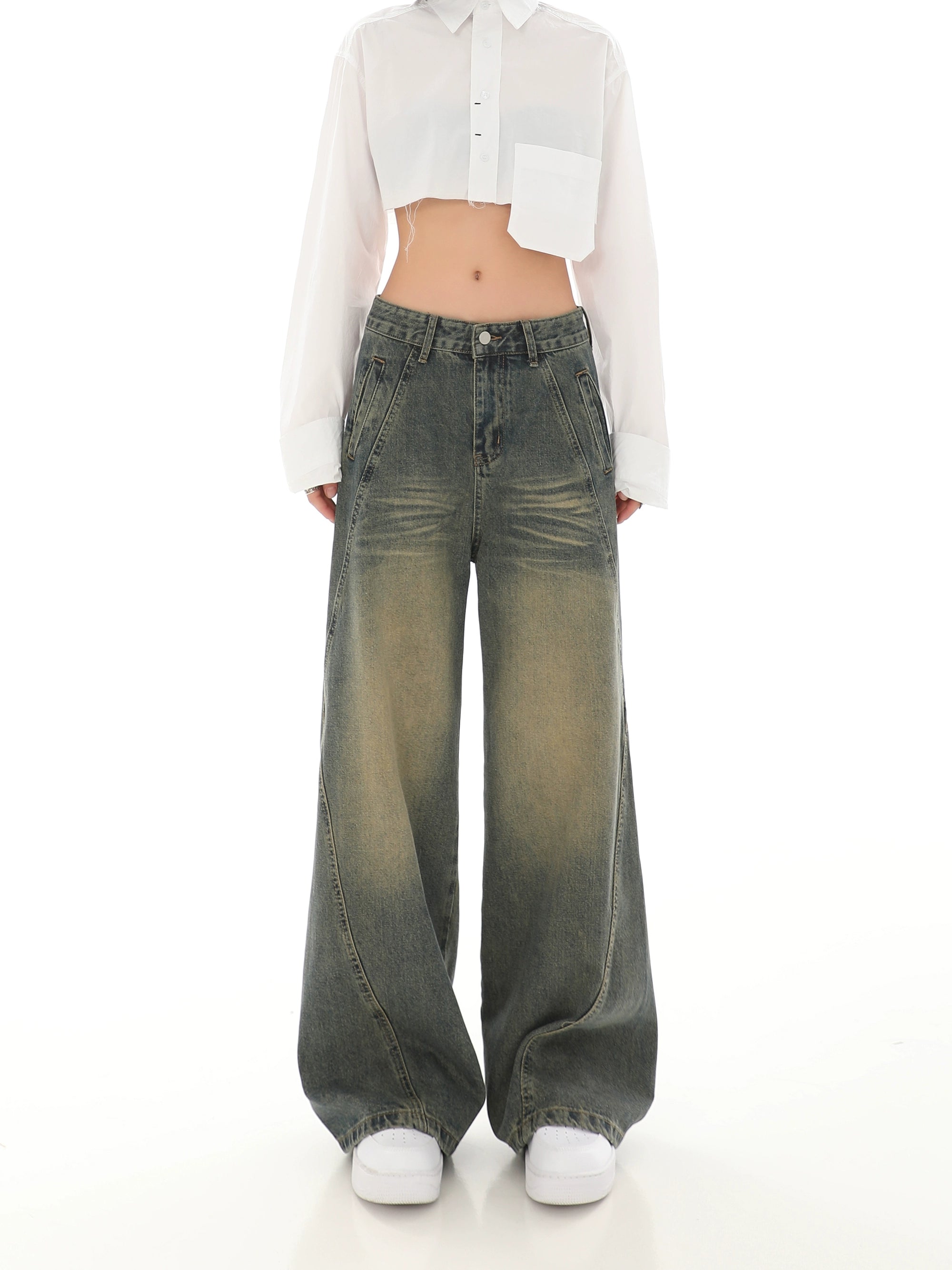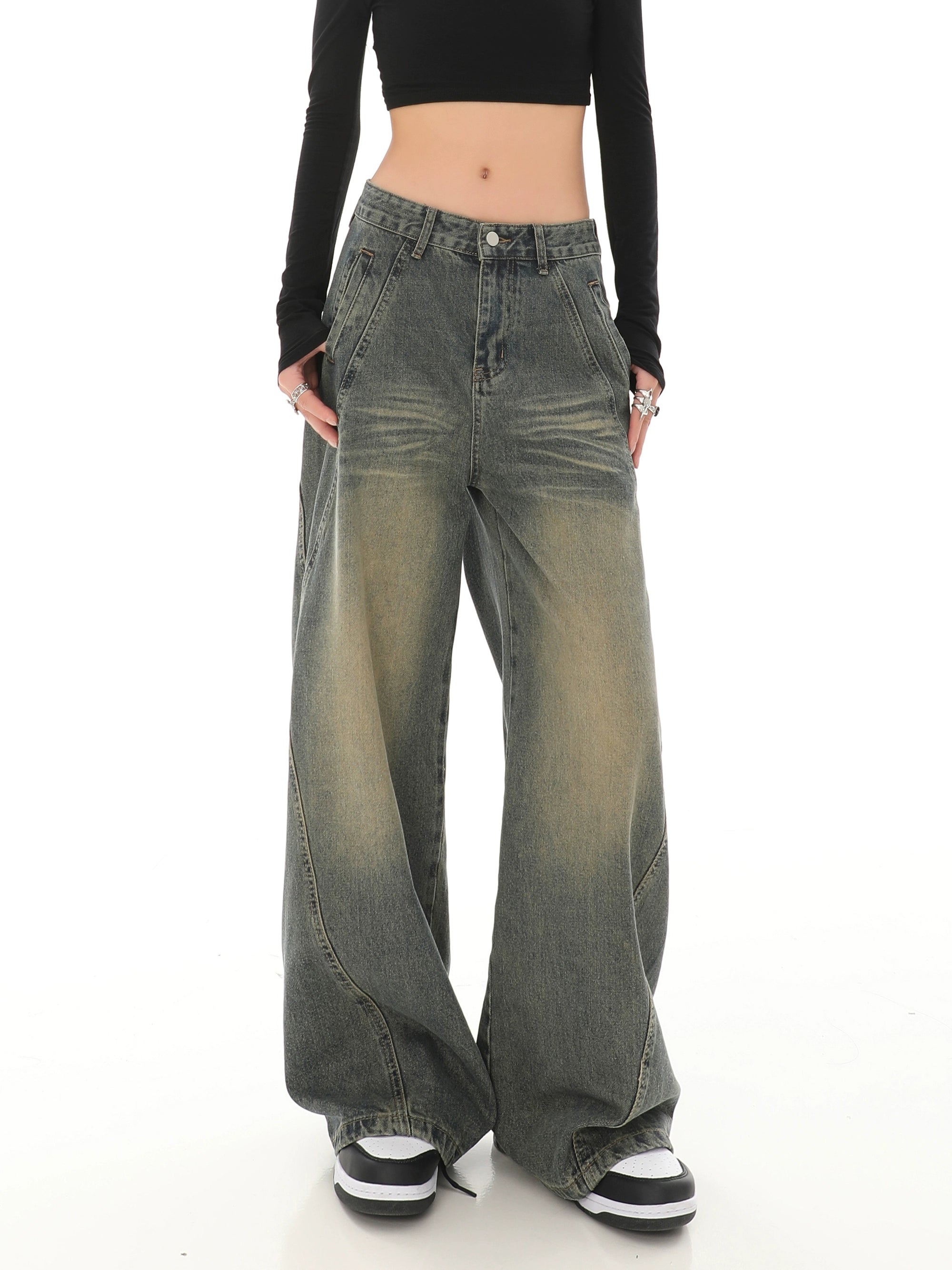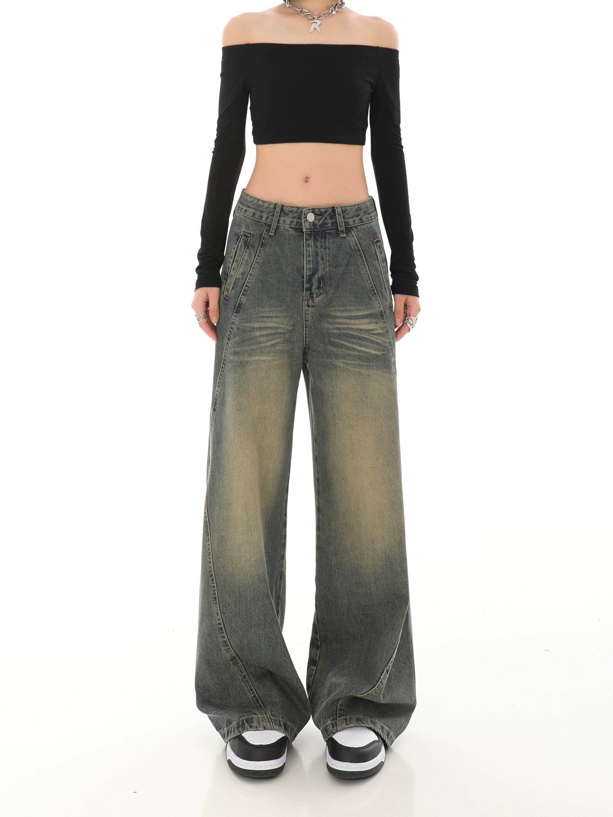 Crafted from 100% cotton for a comfortable, breathable fit, these jeans exhibit a retro blue hue with unique sandblast detailing for a vintage, lived-in look. High-waisted design meets wide-leg style, providing a flattering silhouette while echoing an edgy yet nonchalant vibe.