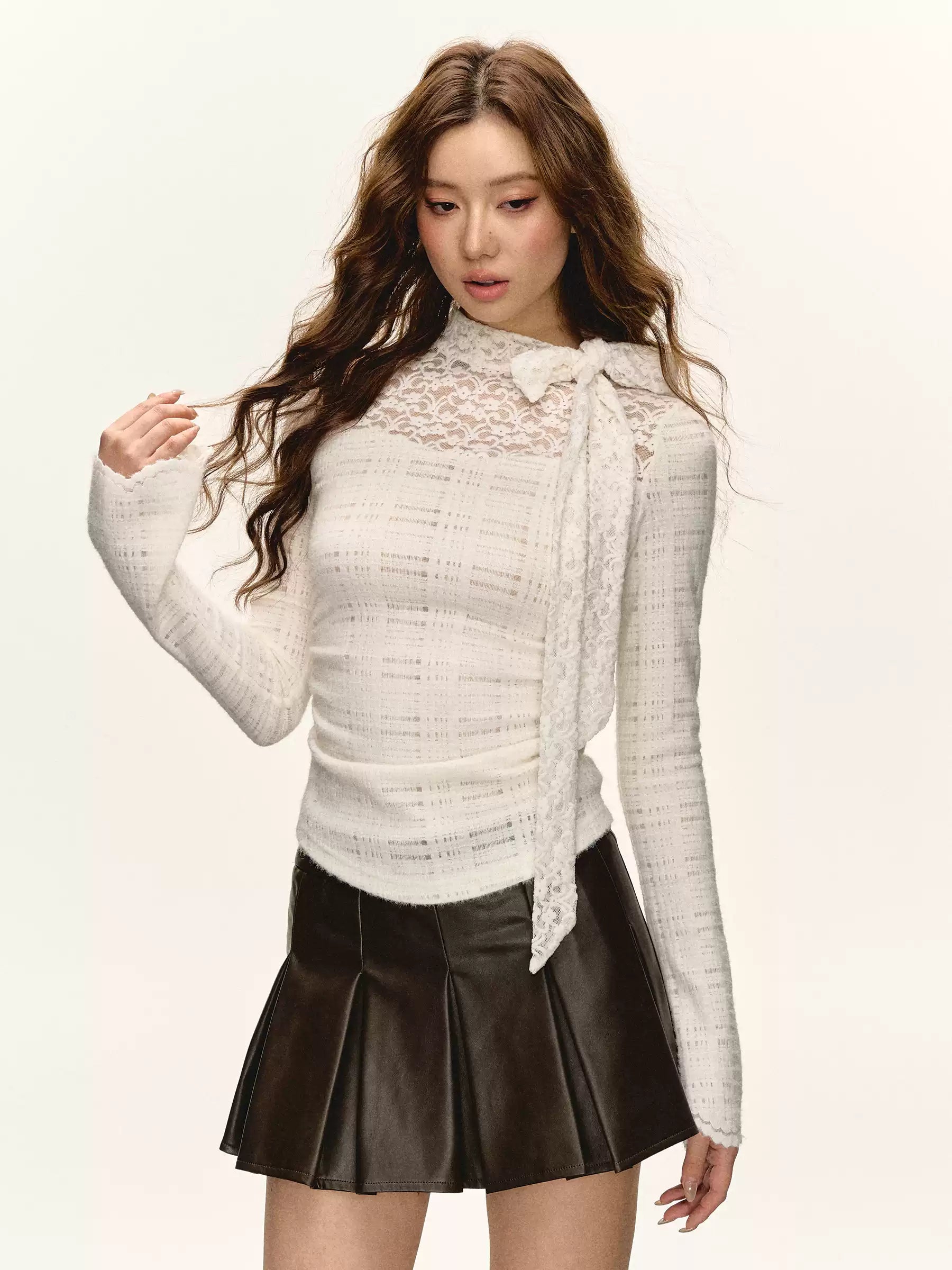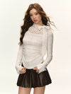 The semi-sheer lace panel at the neckline adds just the right amount of edge, complemented by a neck tie that creates an understated yet refined finish. The fitted silhouette hugs your figure while the plaid-knit fabric introduces a subtle contrast in texture. Flared cuffs with lace trim elevate the design further, making it a go-to for layering or wearing solo.