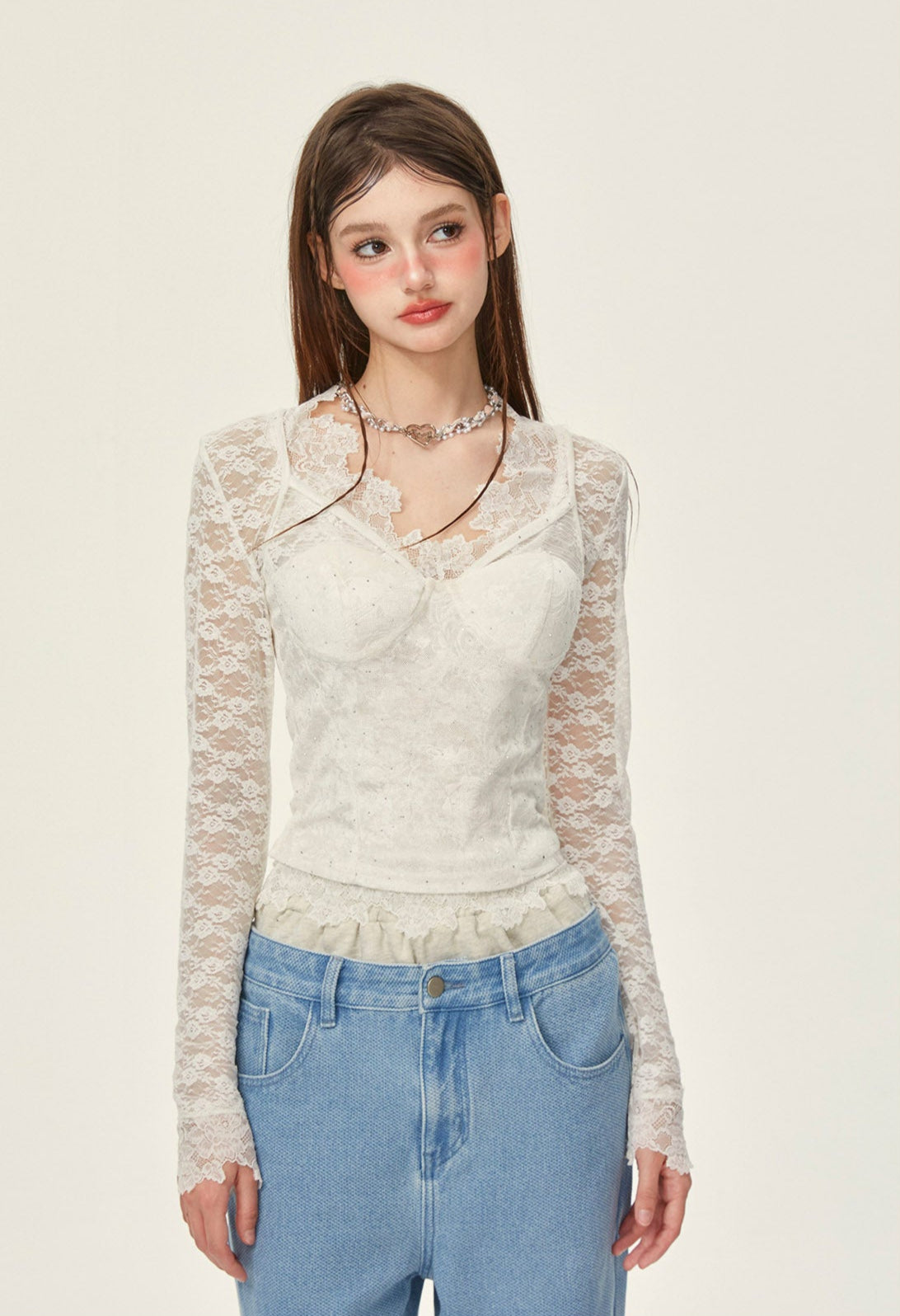 The intricate lace pattern and V-neckline add texture and depth, while the slim fit creates a sleek silhouette. Wear it under structured blazers for contrast, or pair it with a bralette for a statement look.