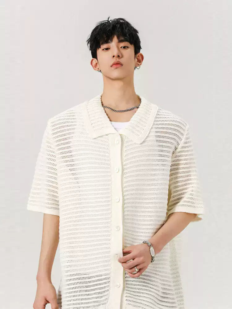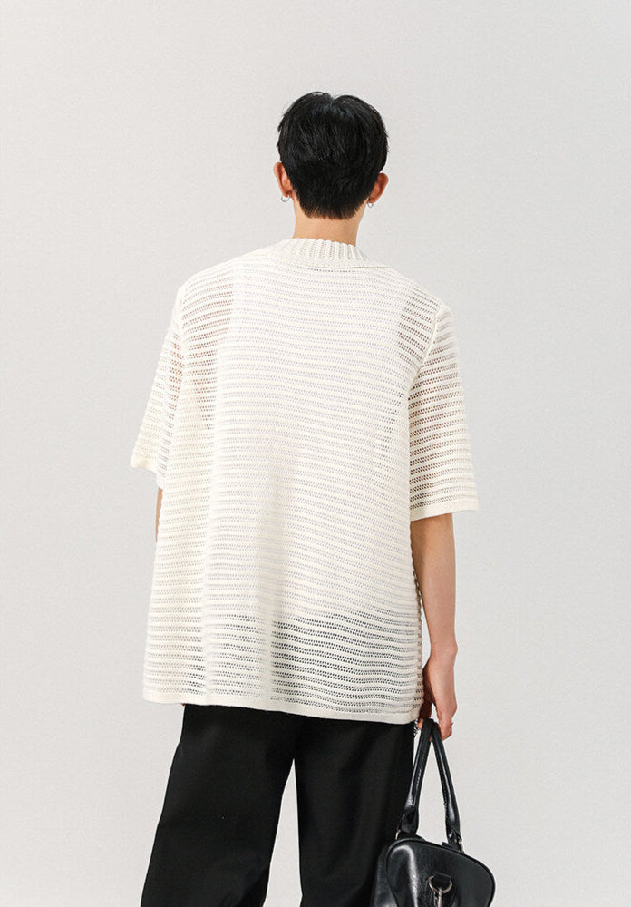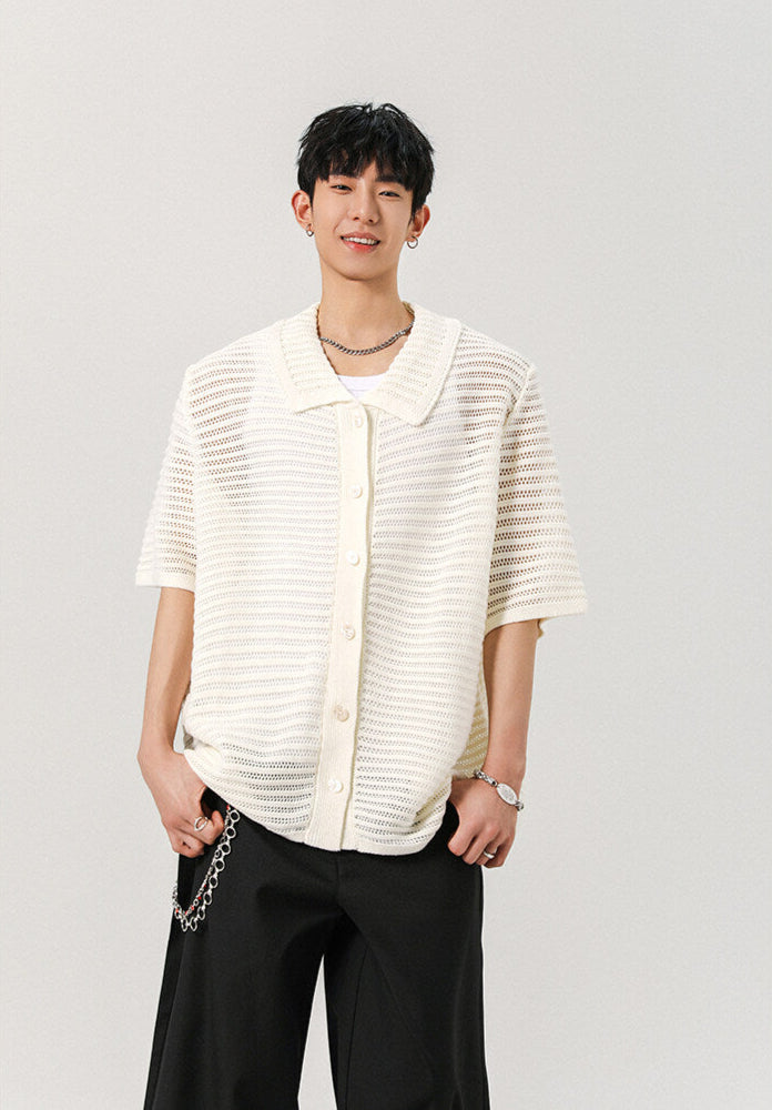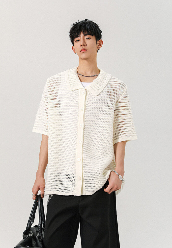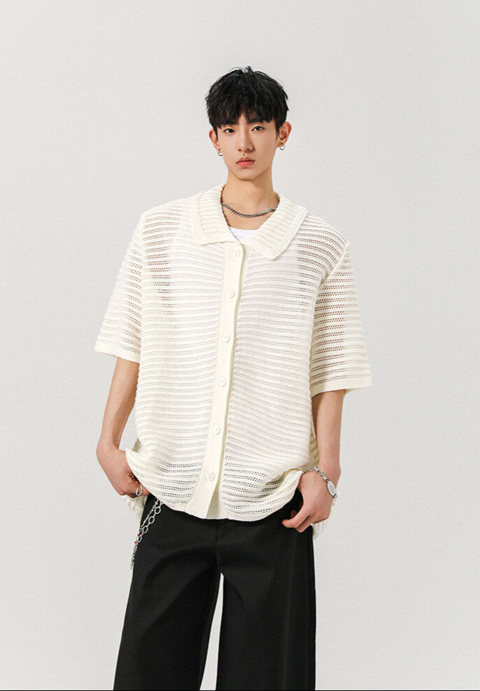 Sheer Open Knit Button-Up Short Sleeve Shirt