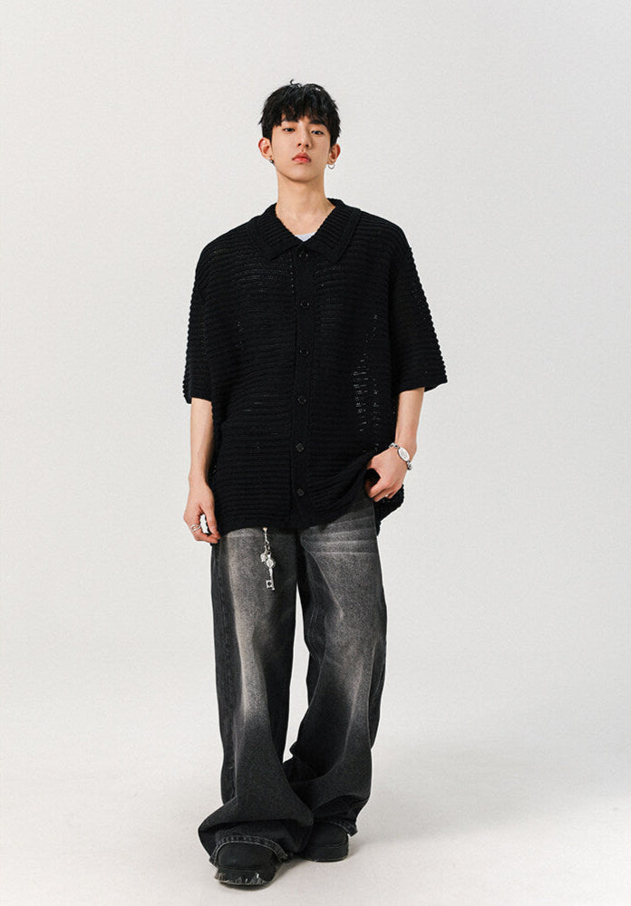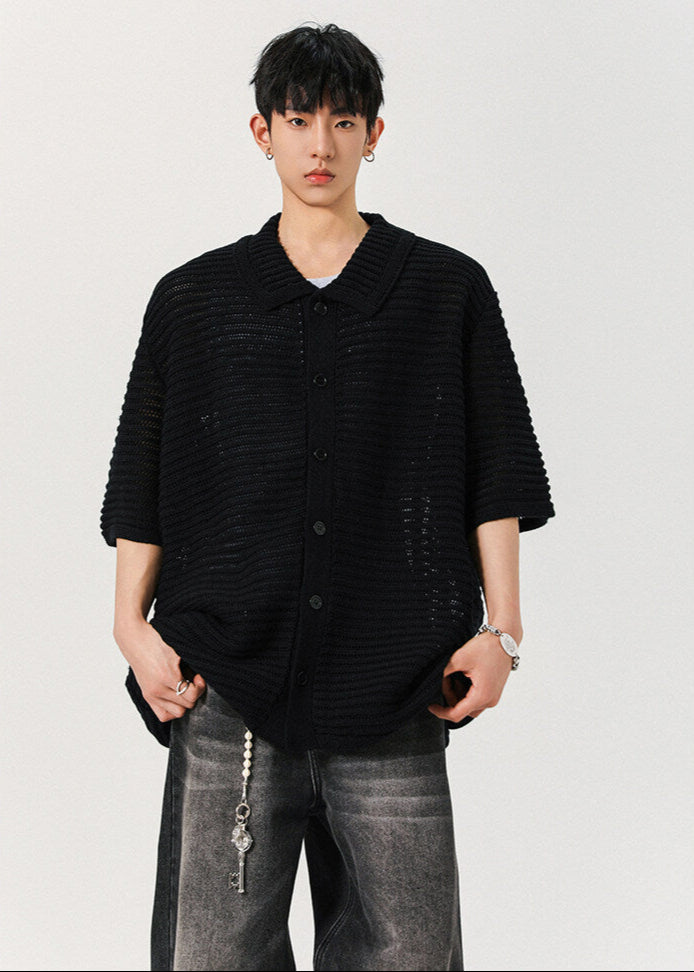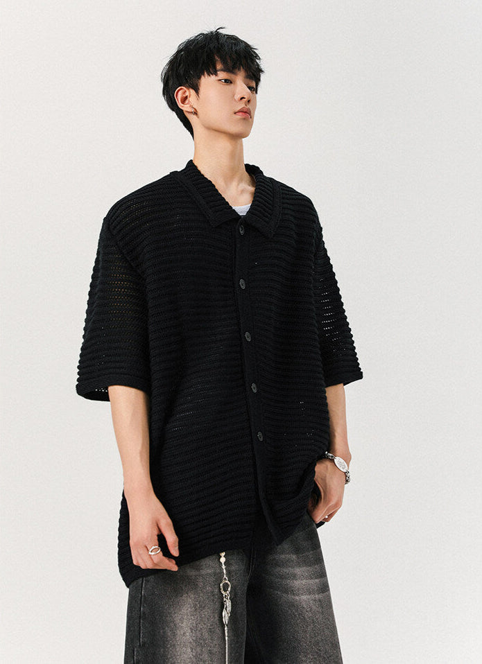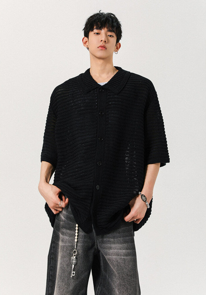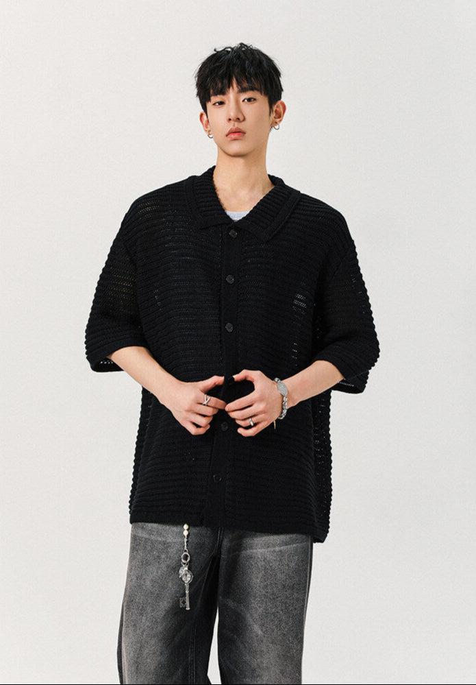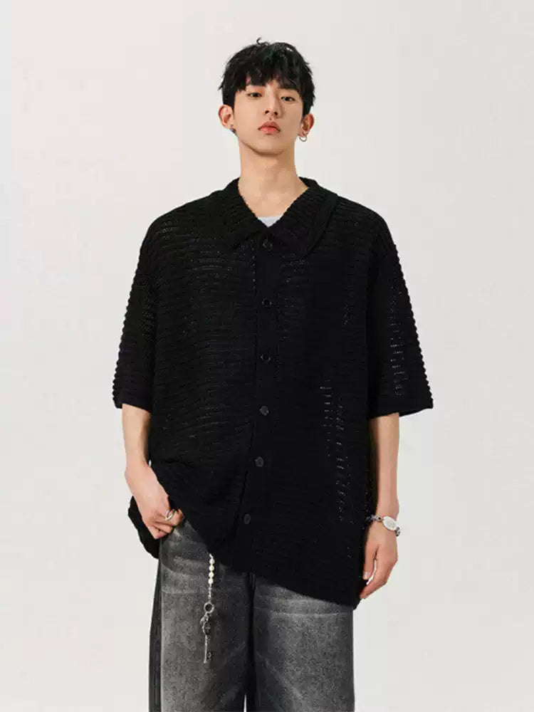 Sheer Open Knit Button-Up Short Sleeve Shirt