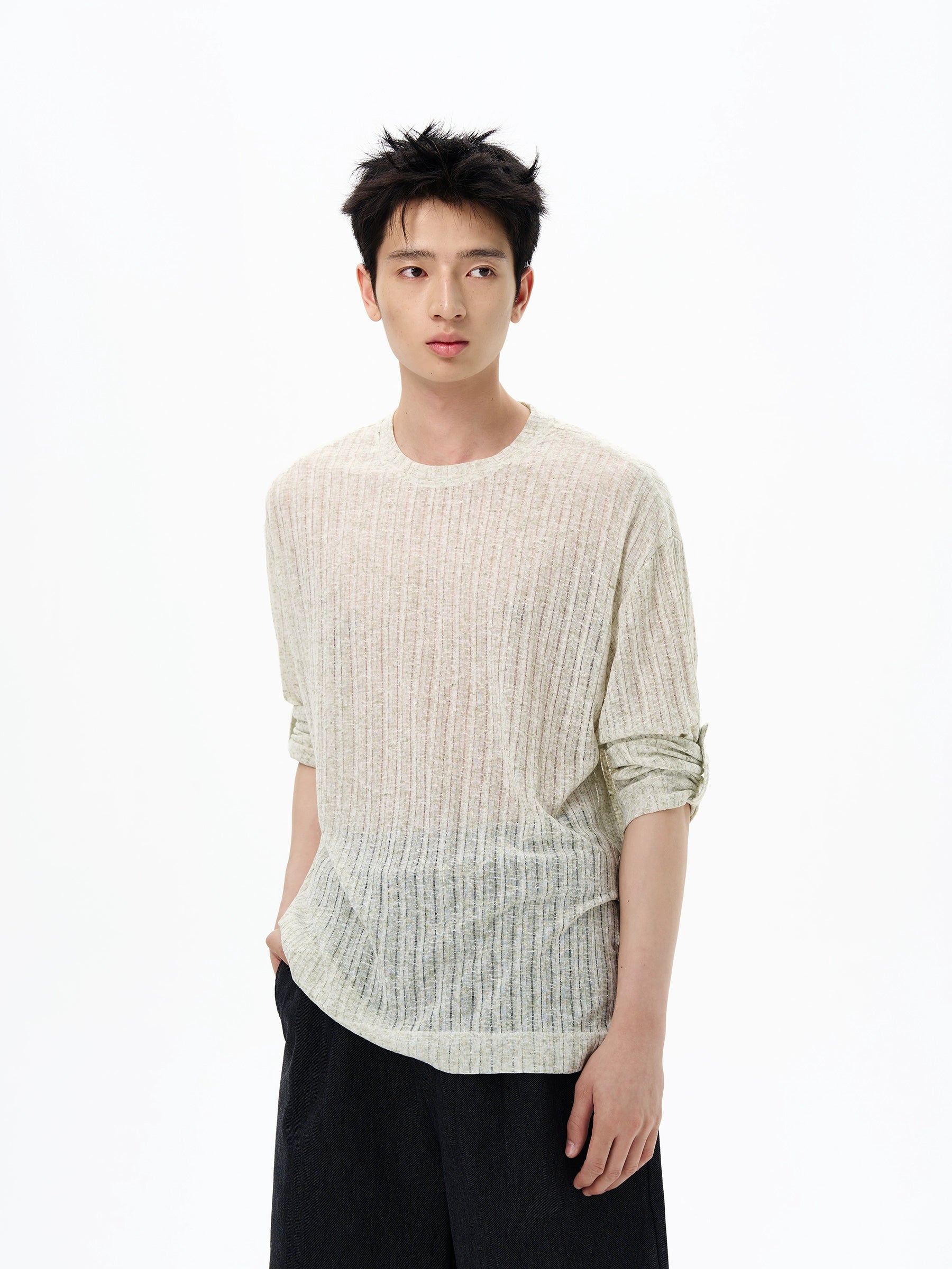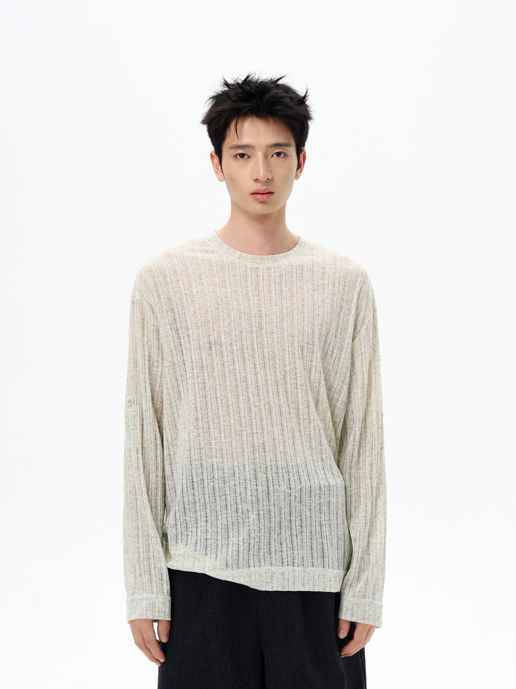 Made from a finely knitted material with a subtle ribbed texture, it has a laid-back, semi-see-through finish that feels effortless but intentional. The loose fit, soft hand-feel, and round neckline offer comfort and understated style, while the sheer design adds dimension whether worn on its own or layered up. Throw it over a basic tank, pair it with wide-leg trousers, or lean into contrast by styling it under a structured jacket.