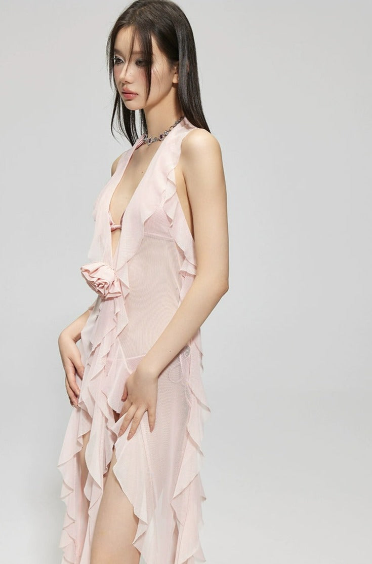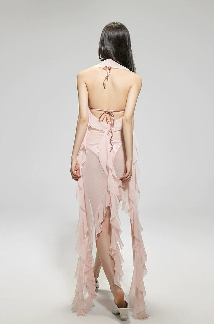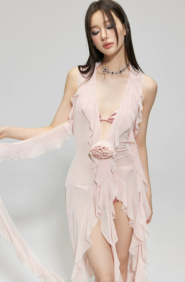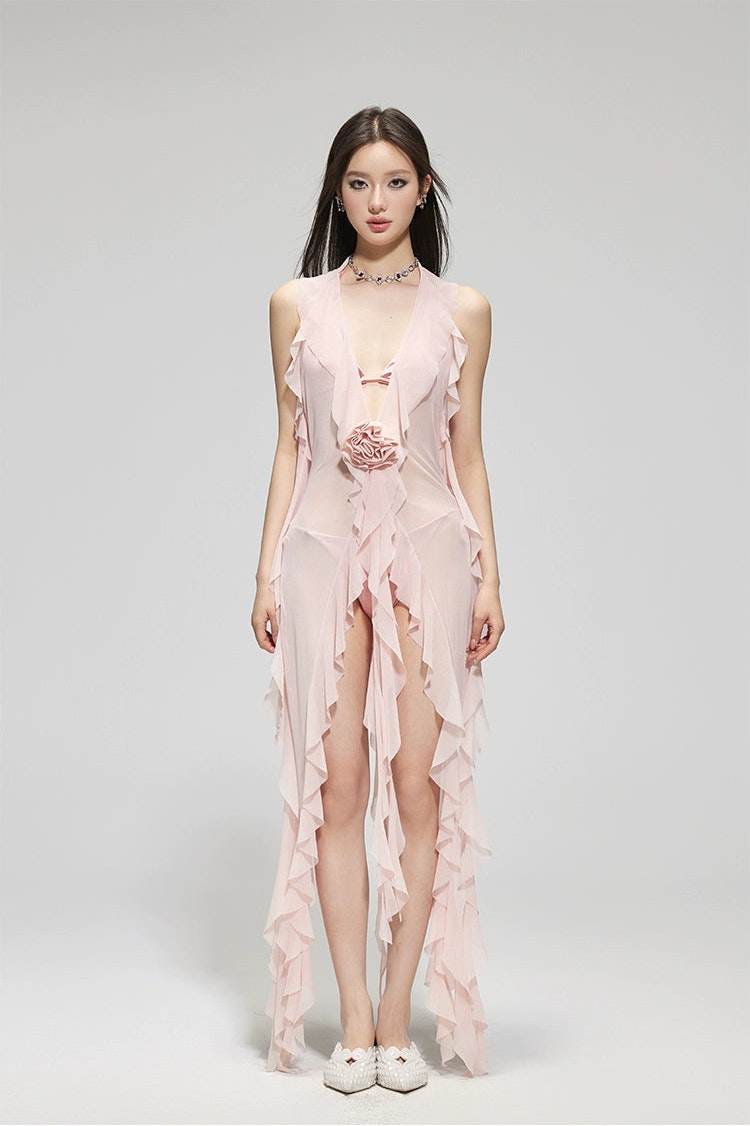 Sheer Ruffle Cover-Up Sleeveless Beach Swimdress