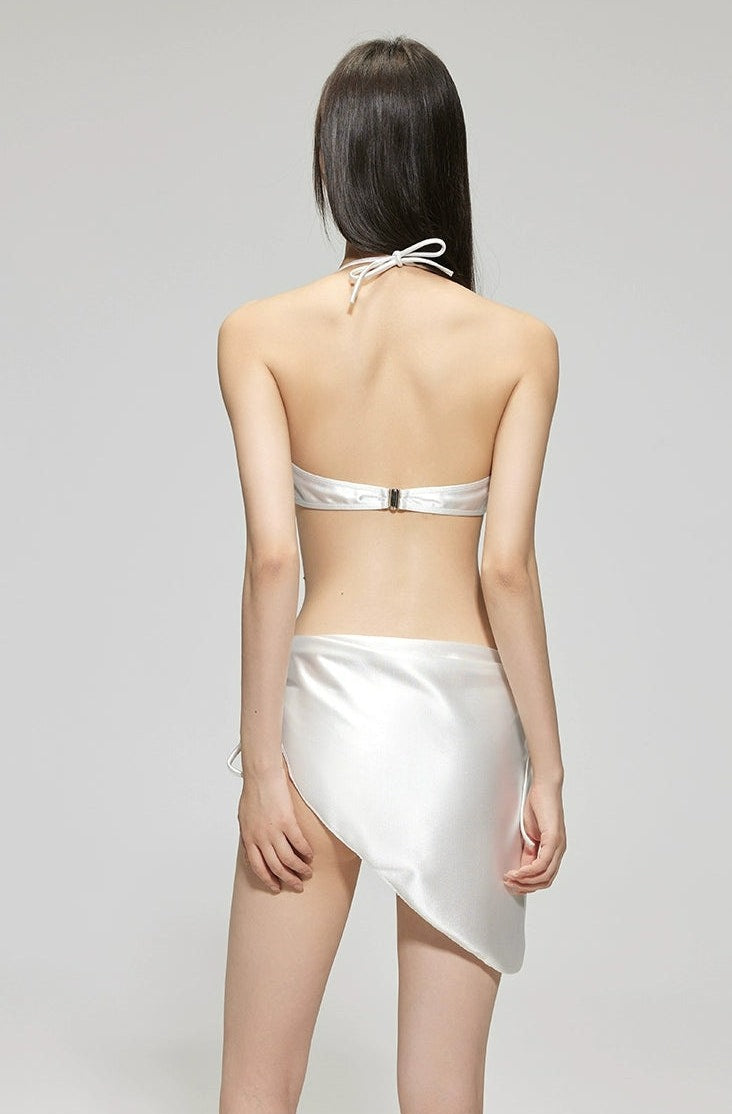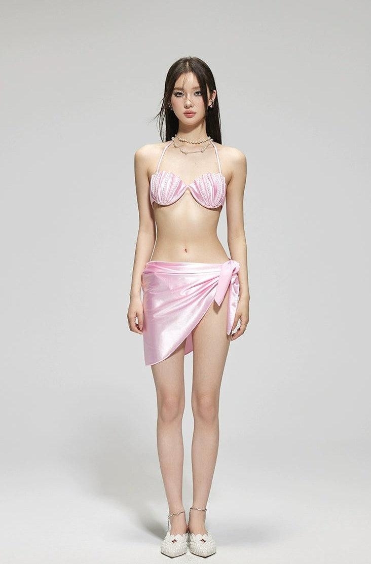 Crafted from a premium fabric that shapes and supports, this set features a halter-style top with intricate hand-sewn pearl and rhinestone embellishments, adding a touch of sophistication. The wrap-around sarong skirt brings an air of allure, while the set's quick-drying and durable material maintains high comfort and breathability.