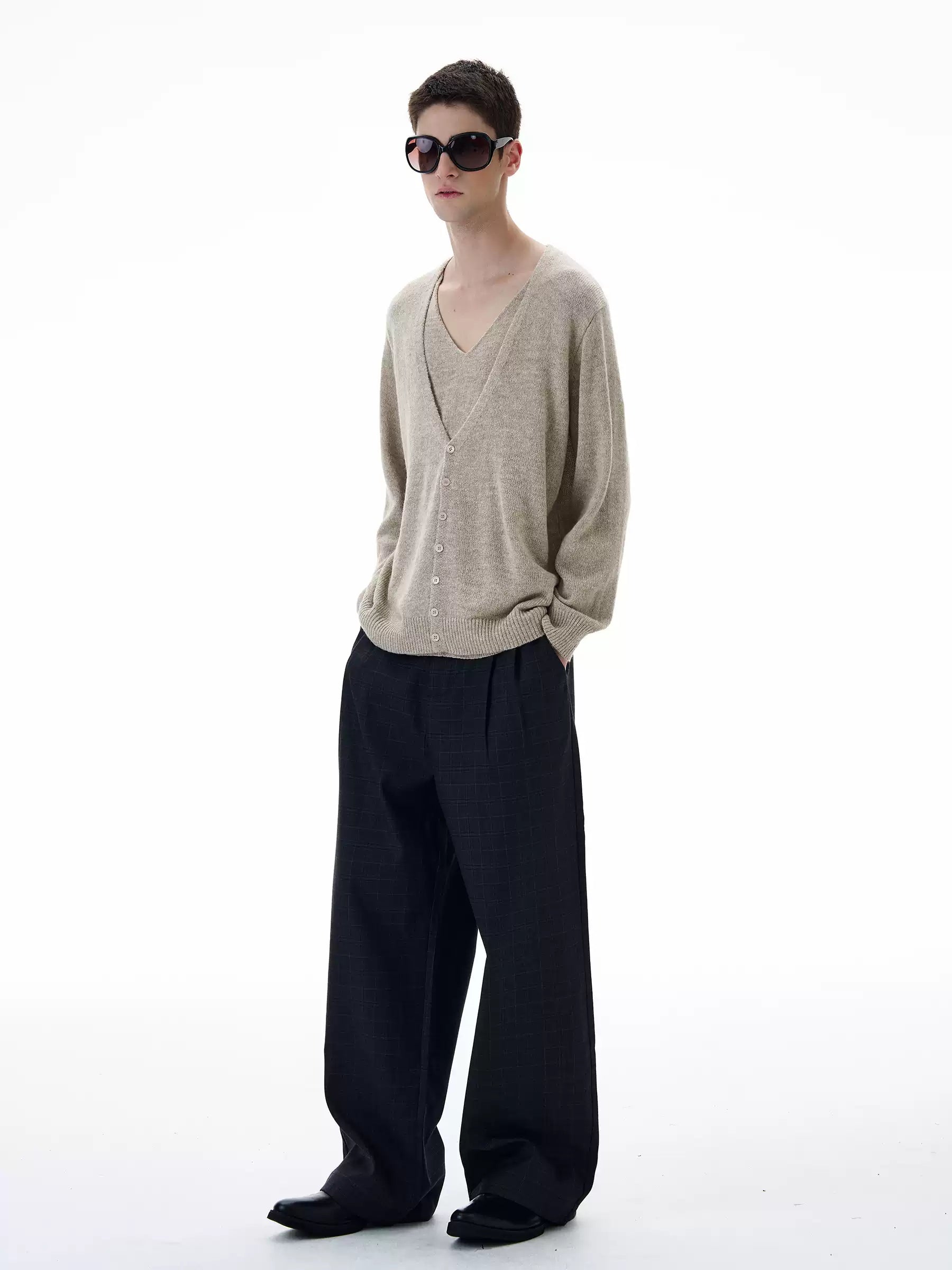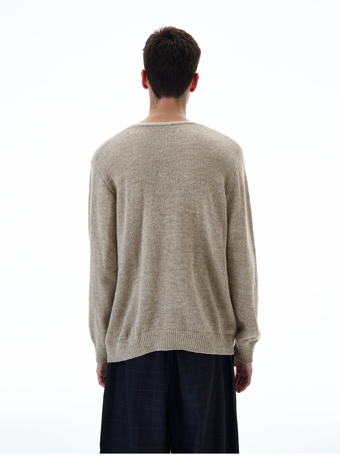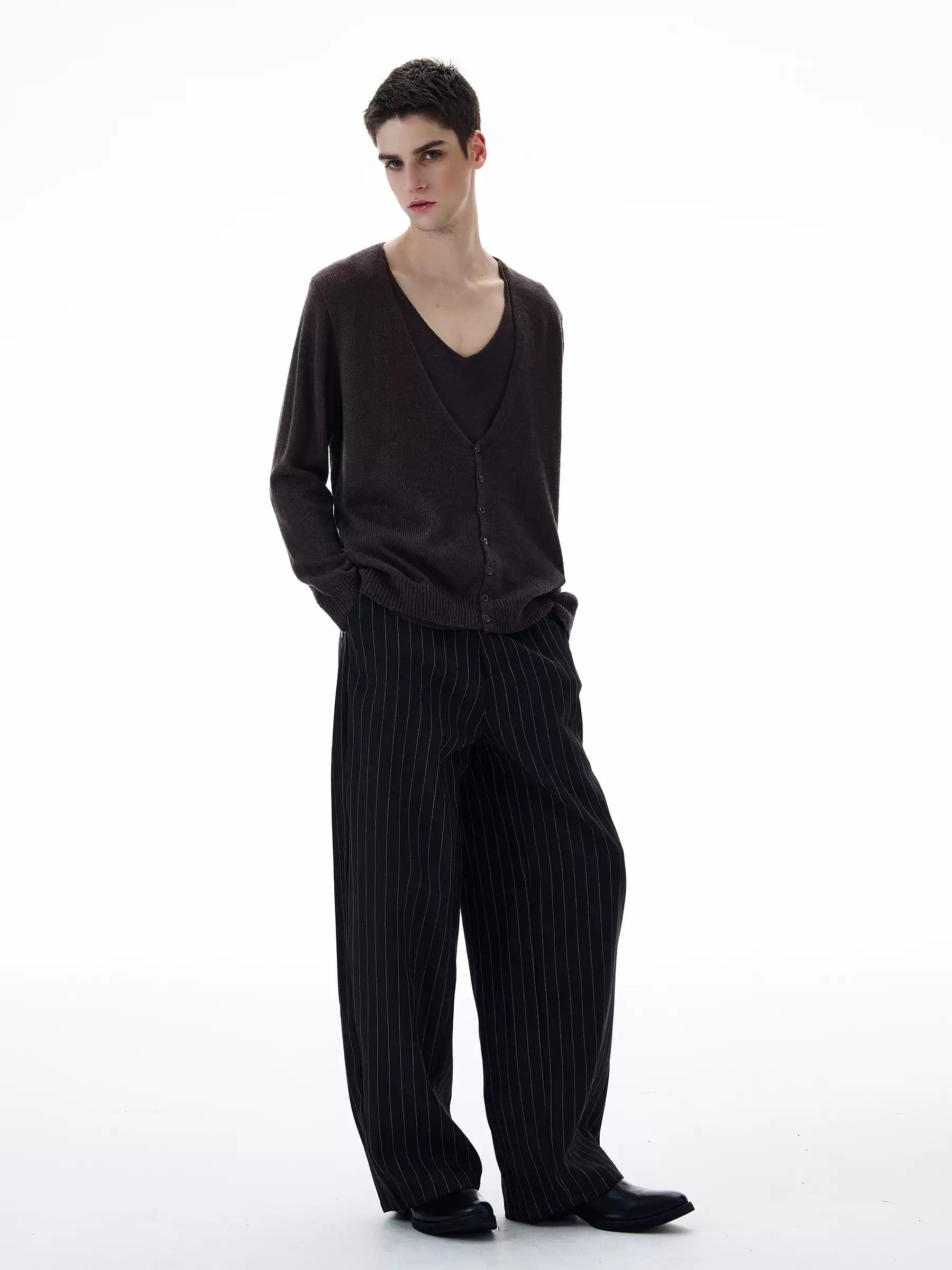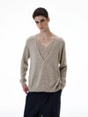 Its ribbed hem and slim fit create a sharp silhouette that feels modern yet easy to wear. Made from a balanced mix of acrylic, nylon, and wool, the knit is soft to the touch while offering structure and breathability. The spliced V-neck design adds depth and visual contrast, while long sleeves and a comfortable drape make it practical for everyday styling.