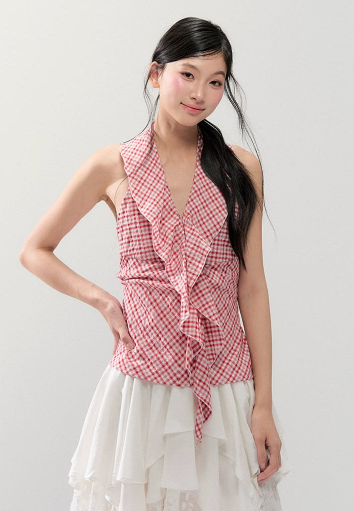 Sleeveless Checker Ruffle Front Tie Halter Top