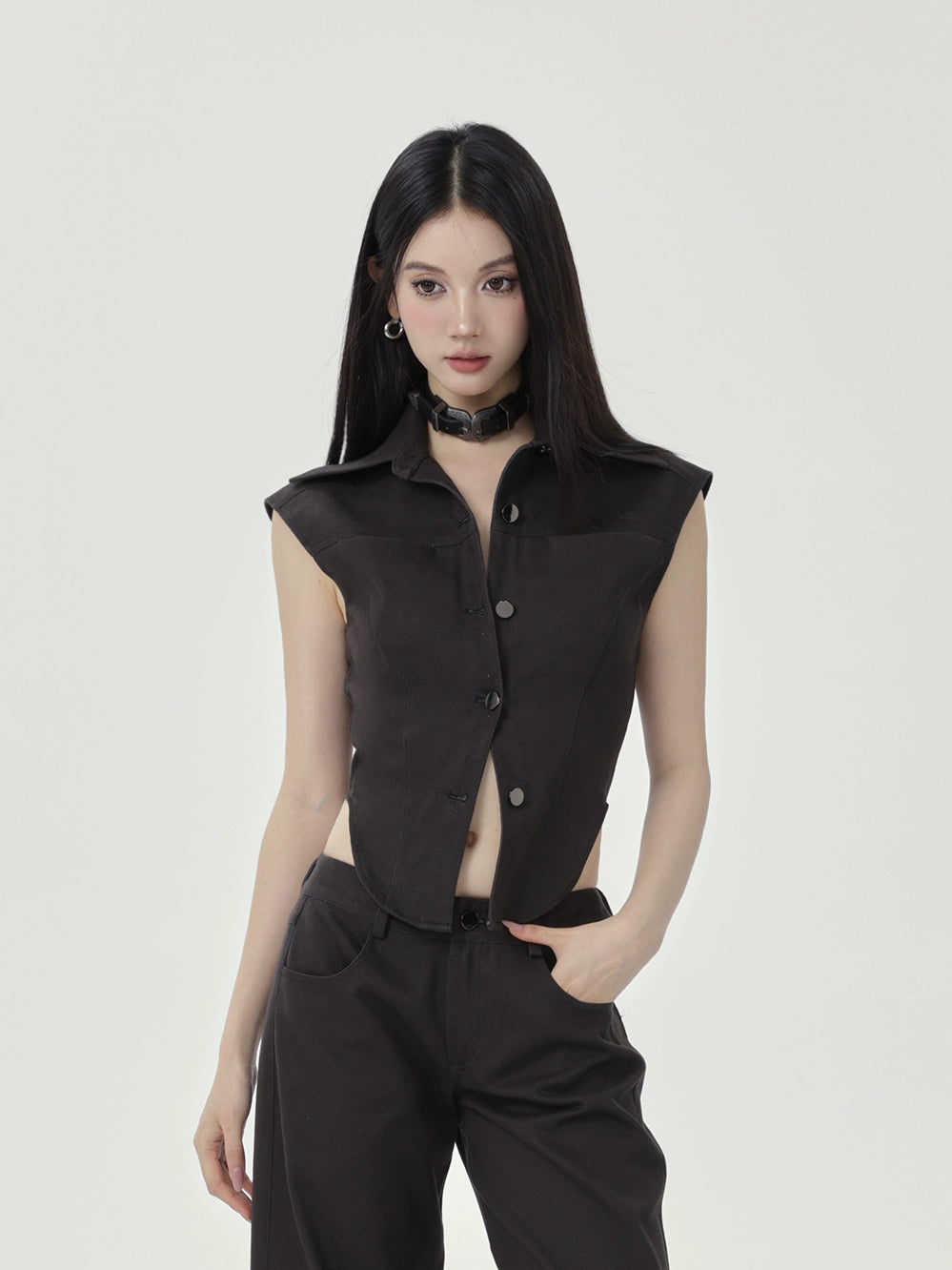 Read full Return PolicyExude confidence with this Sleeveless Collared Button-Up Waistcoat Top, a seamless blend of sophistication and edgy allure.
