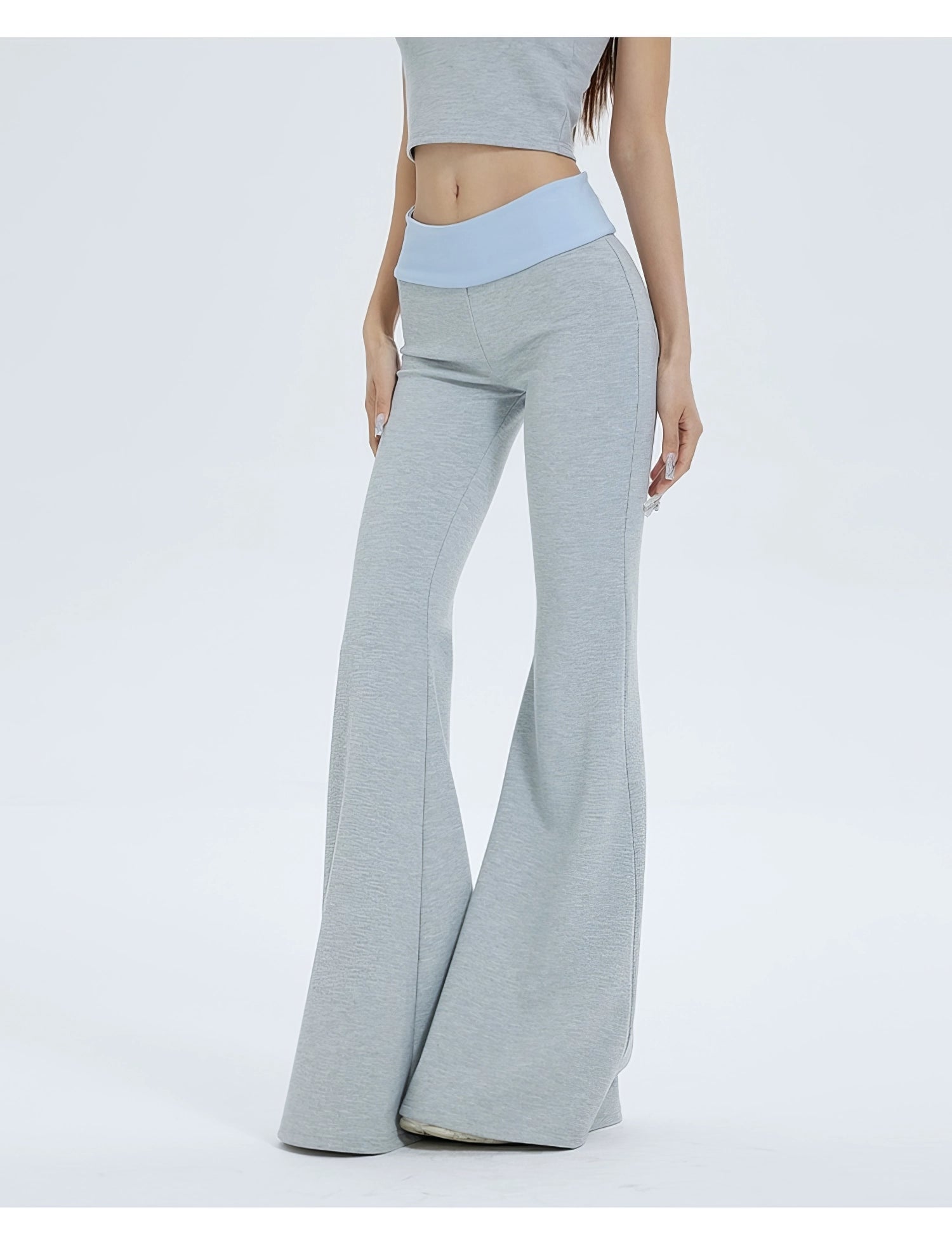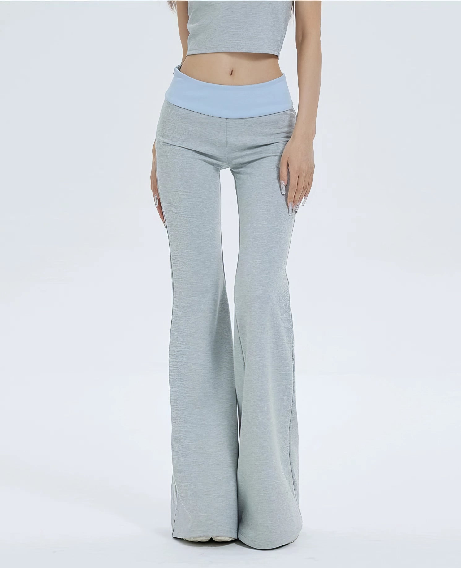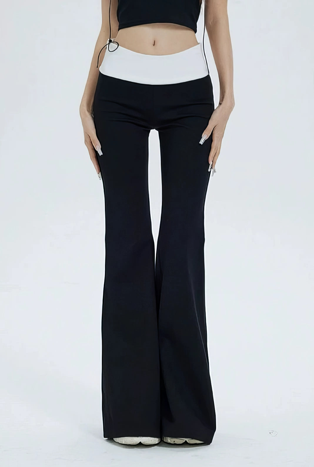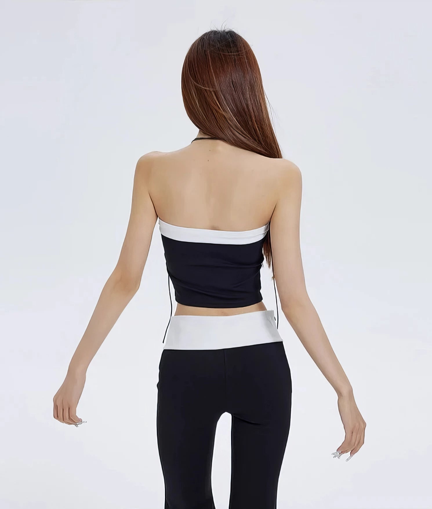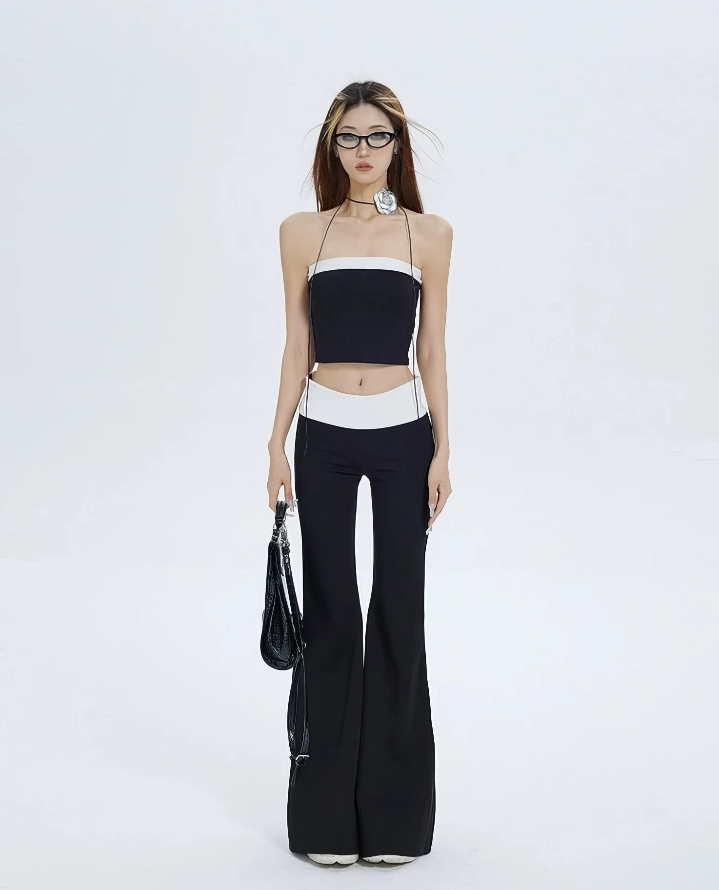 Crafted for the fashion-forward, this two-piece ensemble features a chic sleeveless crop top with a curve-accentuating cut, paired with flared pants that boast a bold color-block waistband for an elevated look. With meticulous attention to detail, the fabrication provides a comfortable fit and seamless movement, making it as functional as it is stylish. This set is a versatile staple that can easily transition from day to night.