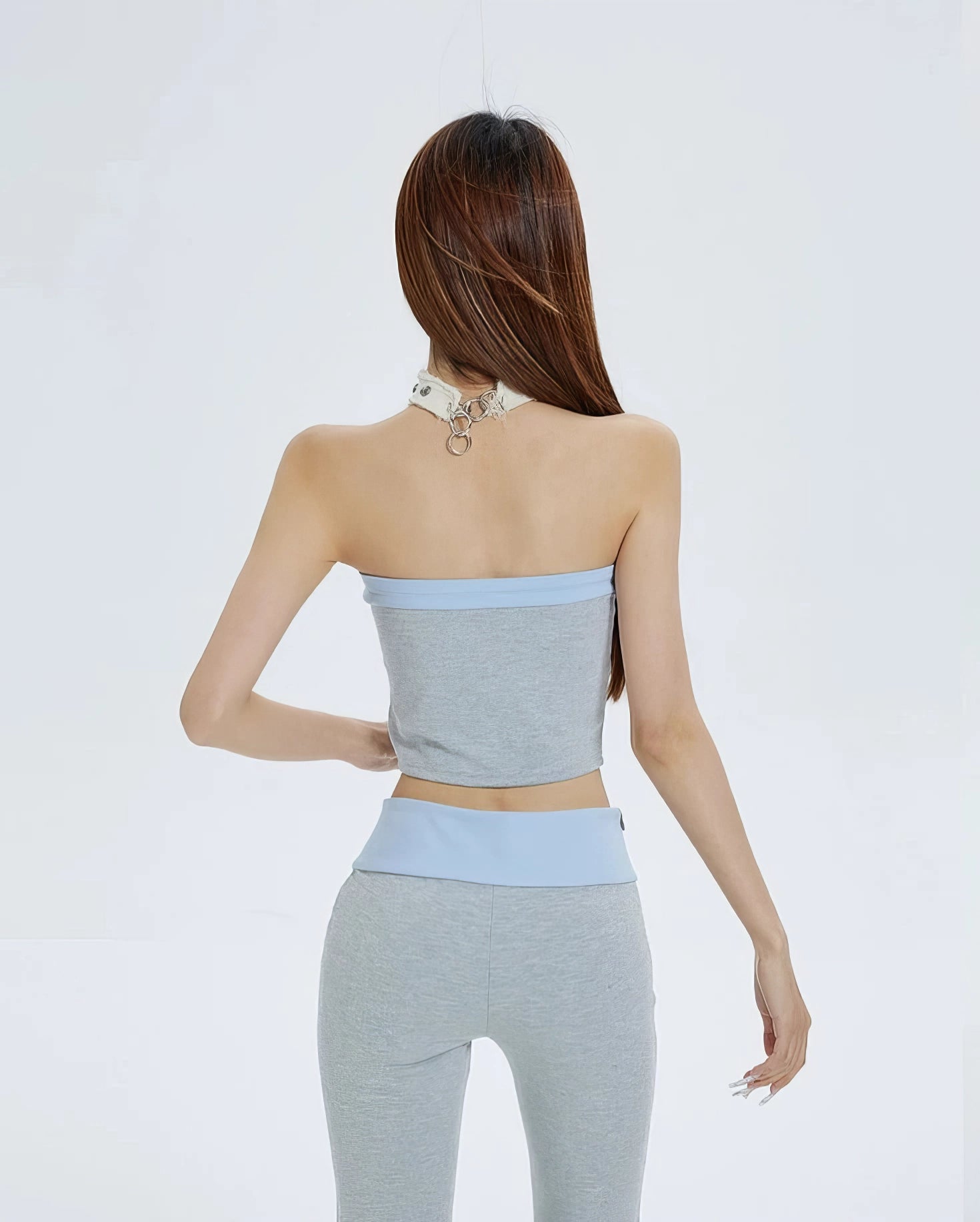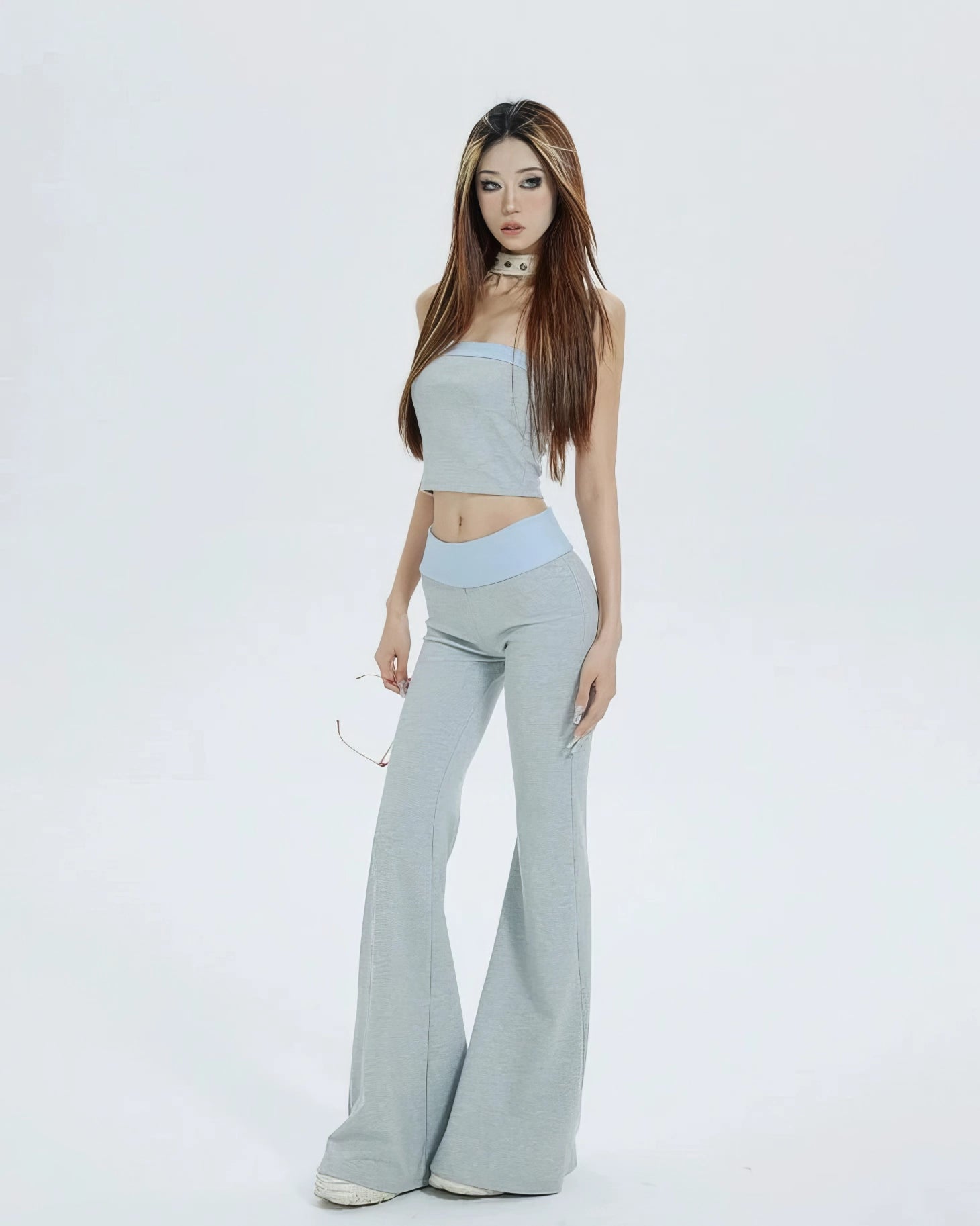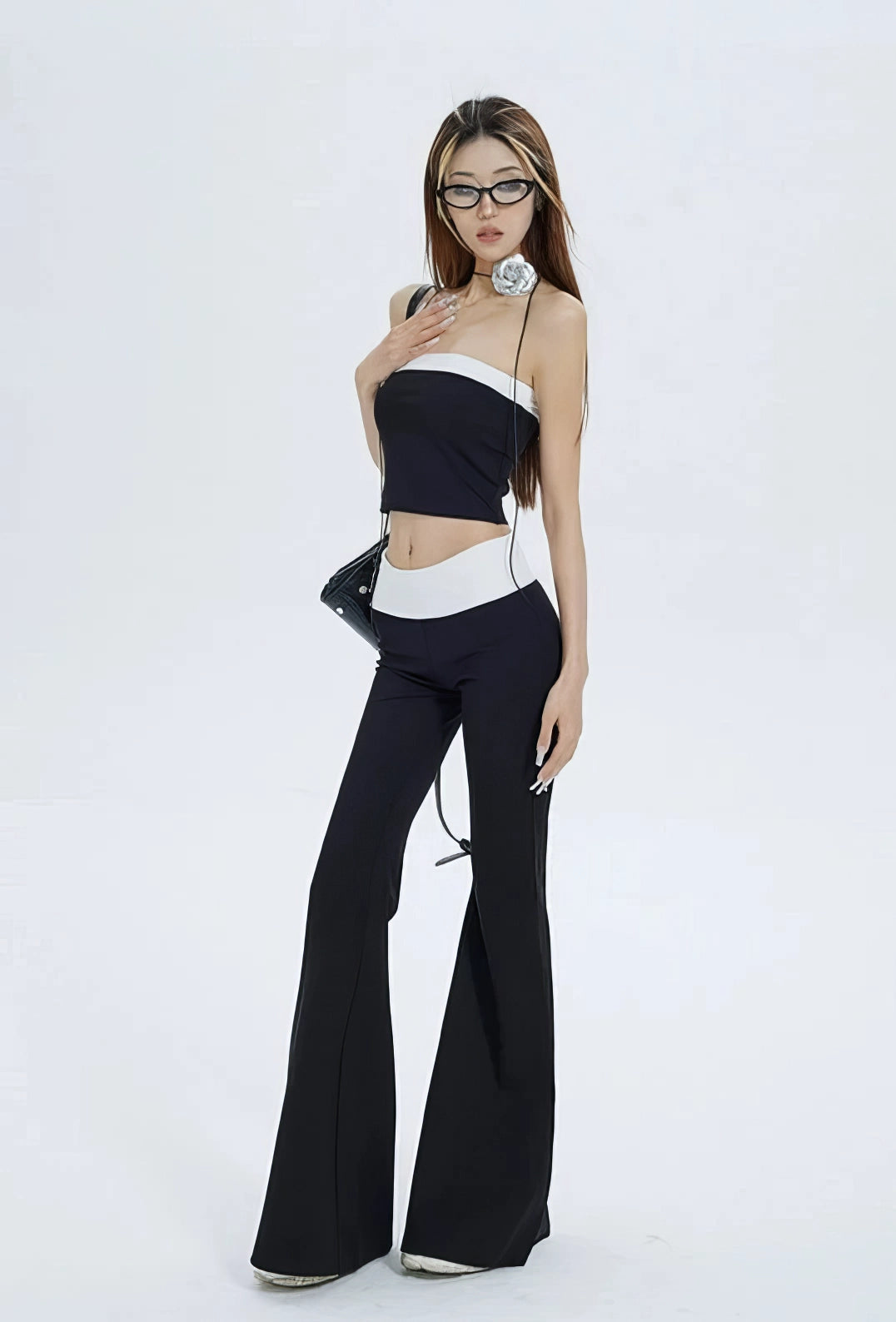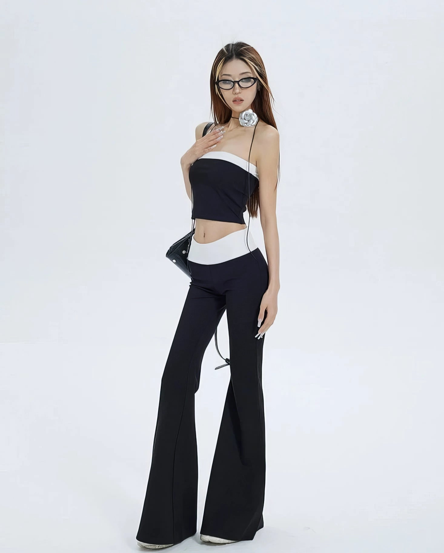 Sleeveless Crop Top and Color-Block Waistband Flare Pants Set