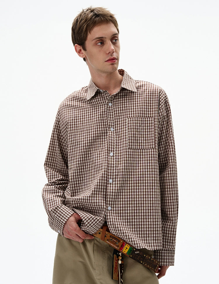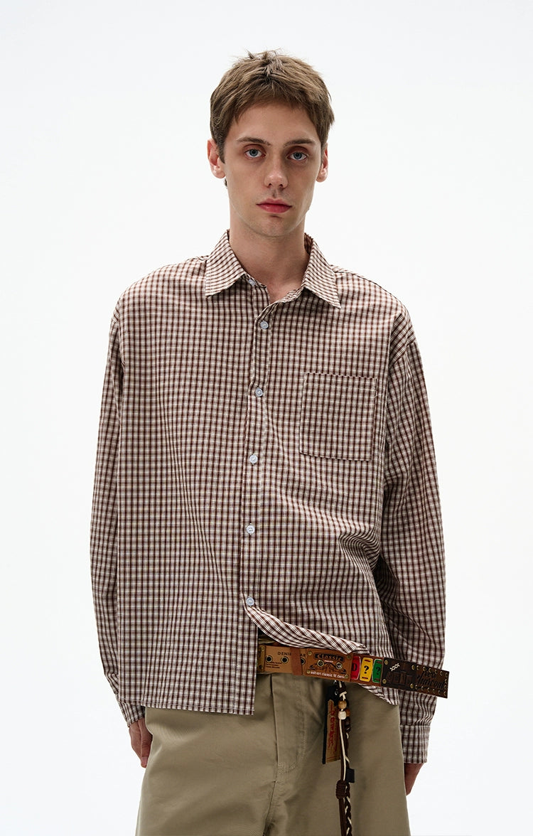 Made from a soft woven cotton blend, this shirt features a narrow plaid design that adds subtle structure without overwhelming your look. The drop shoulder cut and relaxed fit offer a naturally loose silhouette, while the pointed collar and full button closure keep the finish polished and easy to layer. A single chest pocket brings a functional detail without distracting from the minimalist vibe.