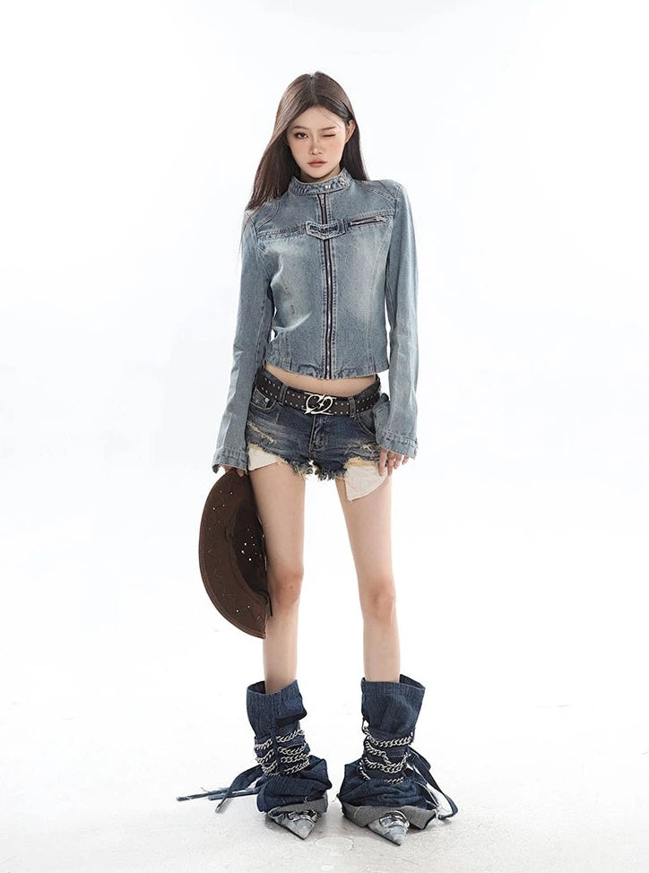 Read full Return PolicyEffortlessly stylish, the Slim-Fit Boxy Vintage Wash Denim Racer Jacket is a wardrobe staple for those who lean towards timeless fashion with an edge.