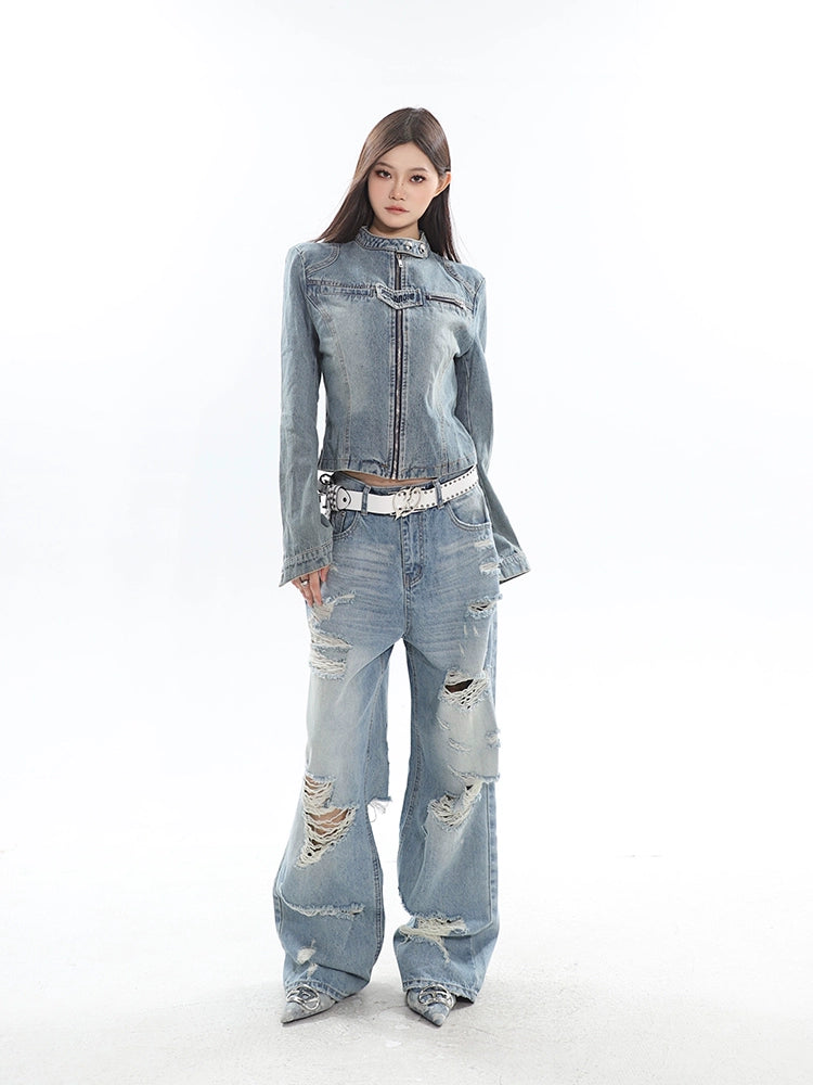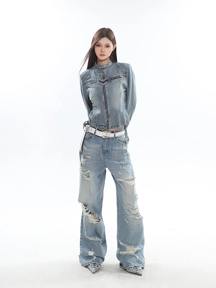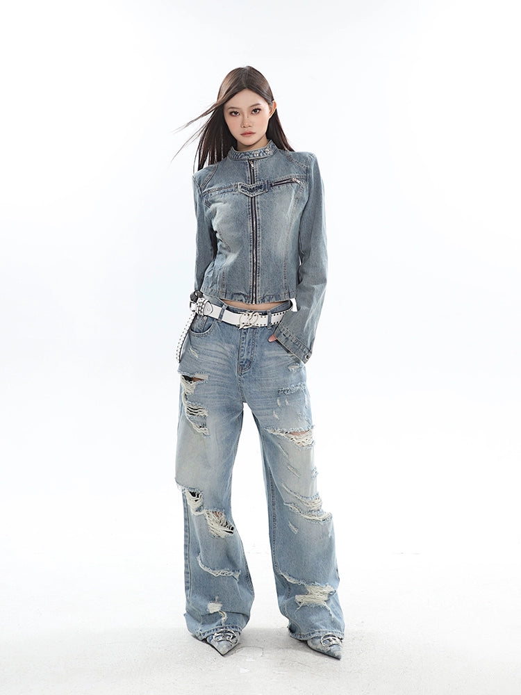 Slim-Fit Boxy Vintage Wash Denim Racer Jacket