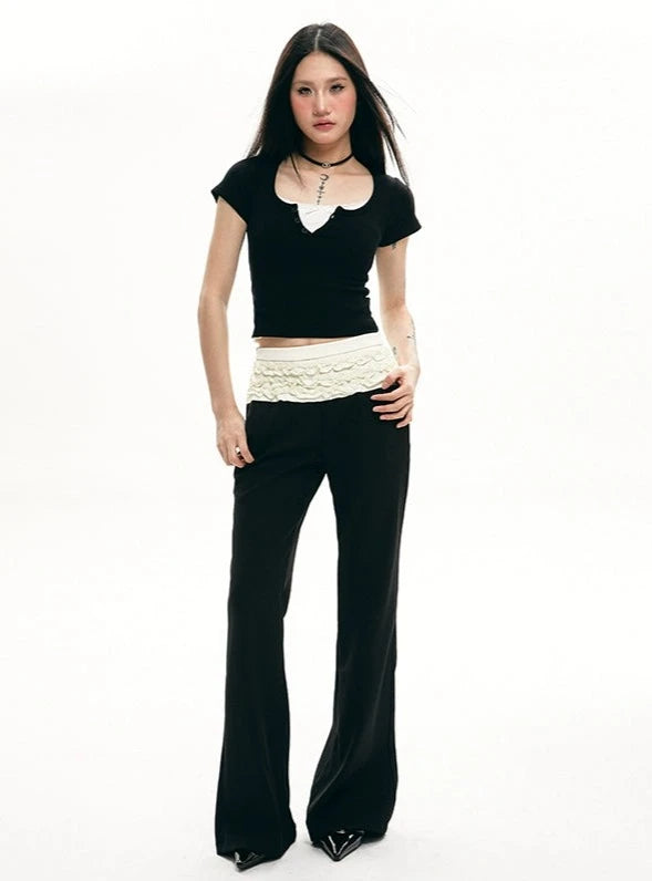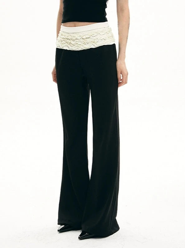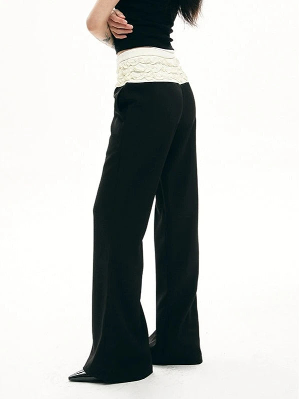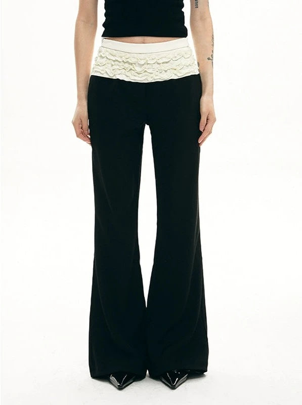 Crafted from 100% polyester fiber, these high-waist, flared trousers showcase a delicate lace trim that exudes a moody yet professional aesthetic. The conventional thickness of the fabric ensures comfort for all-day wear, while the smart design maintains a relaxed straight fit that flows effortlessly with your movements.