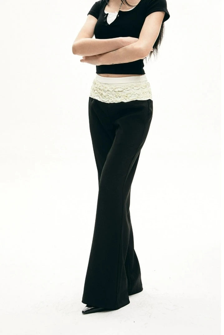 Read full Return PolicyDiscover elegance with a twist in these Slim Lace Trimmed Waistband Flare Pants, perfect for adding a touch of sophistication to any outfit.