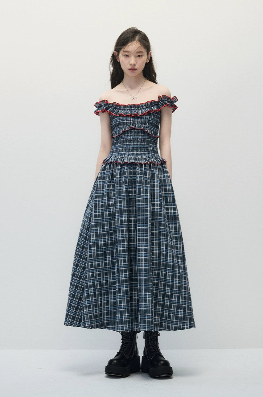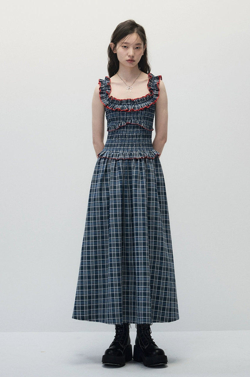 Smocked Plaid Maxi Dress with Ruffle Trim