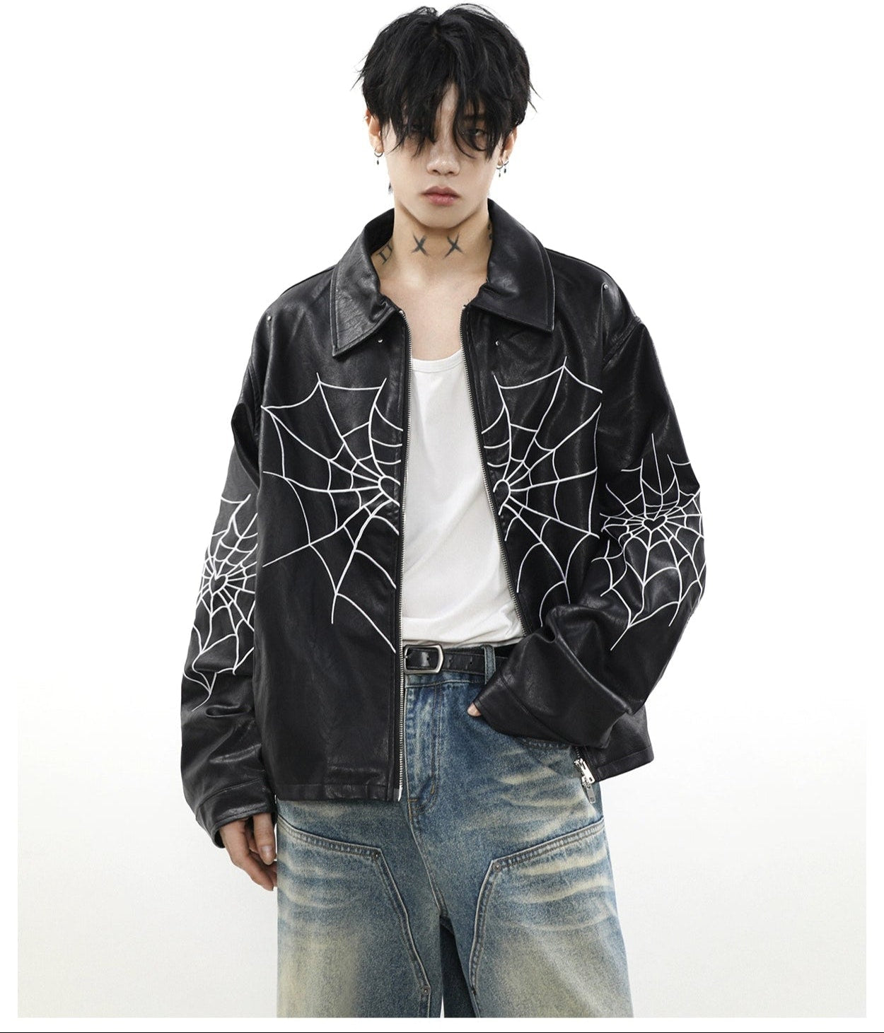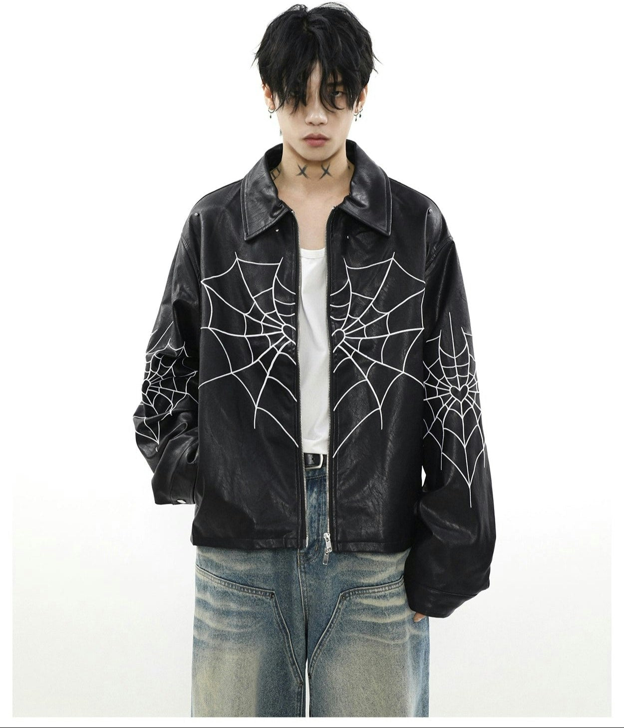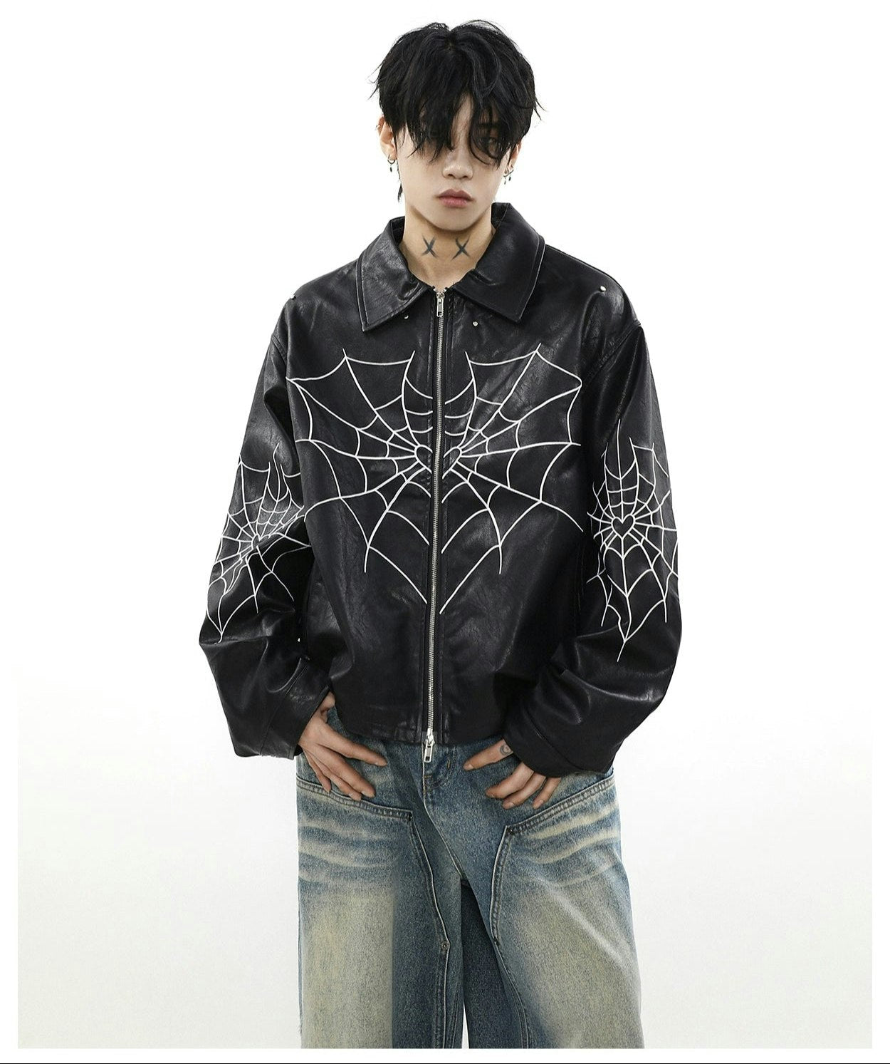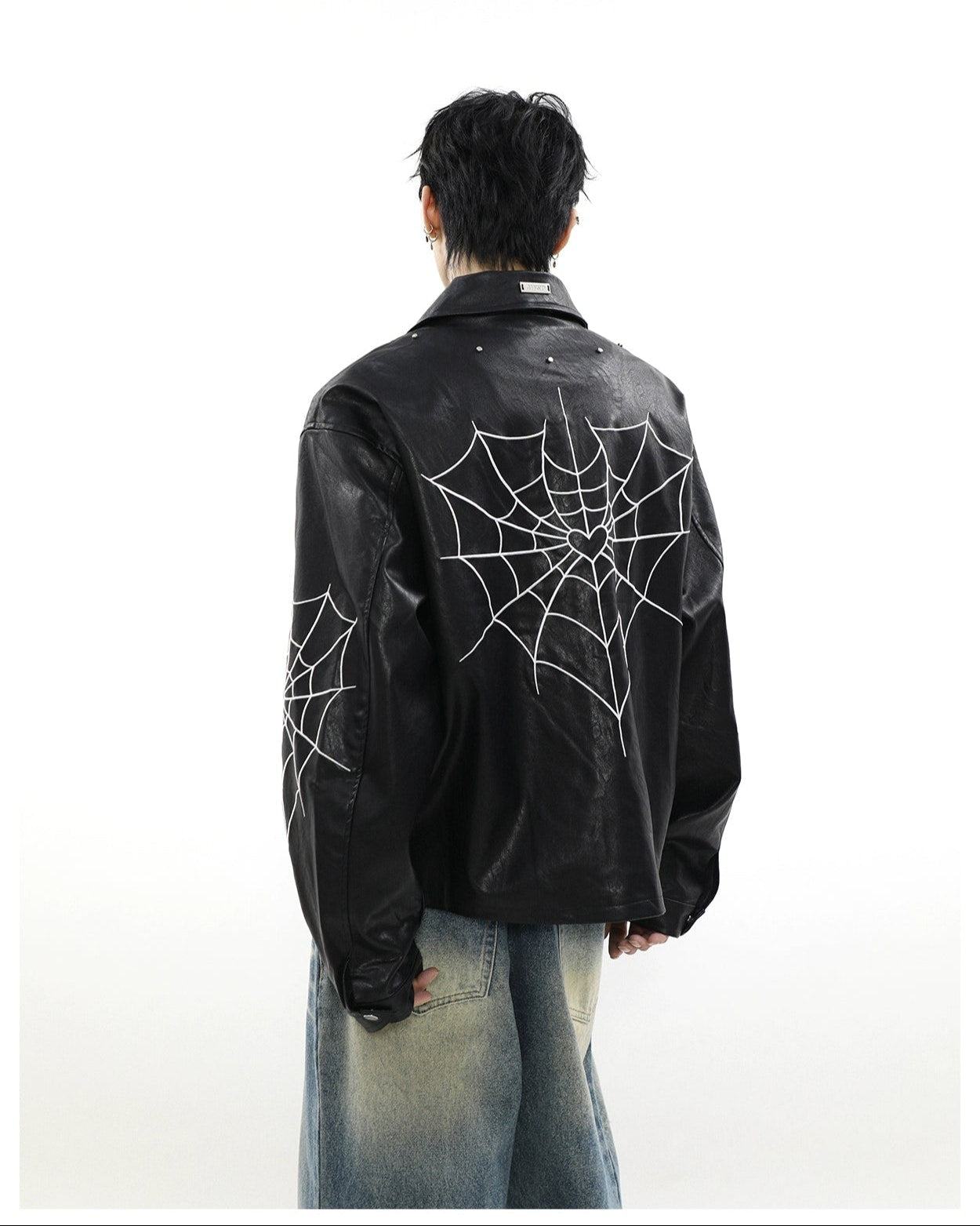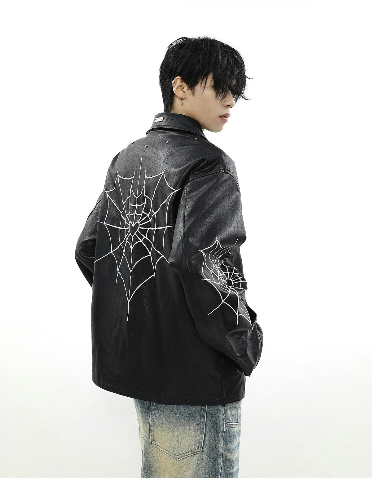 Read full Return PolicyUnleash edgy vibes with this Spiderweb Print Faux Leather Bomber Jacket, blending bold aesthetics with a comfortable loose fit. Crafted from high-quality PU leather and adorned with a distinctive skeleton/spider embroidery, this piece promises to be a perennial staple in any contemporary wardrobe, perfect for leisure. A perfect fusion of style and practicality, it's a must-have for the autumn season, offering an effortlessly cool look.